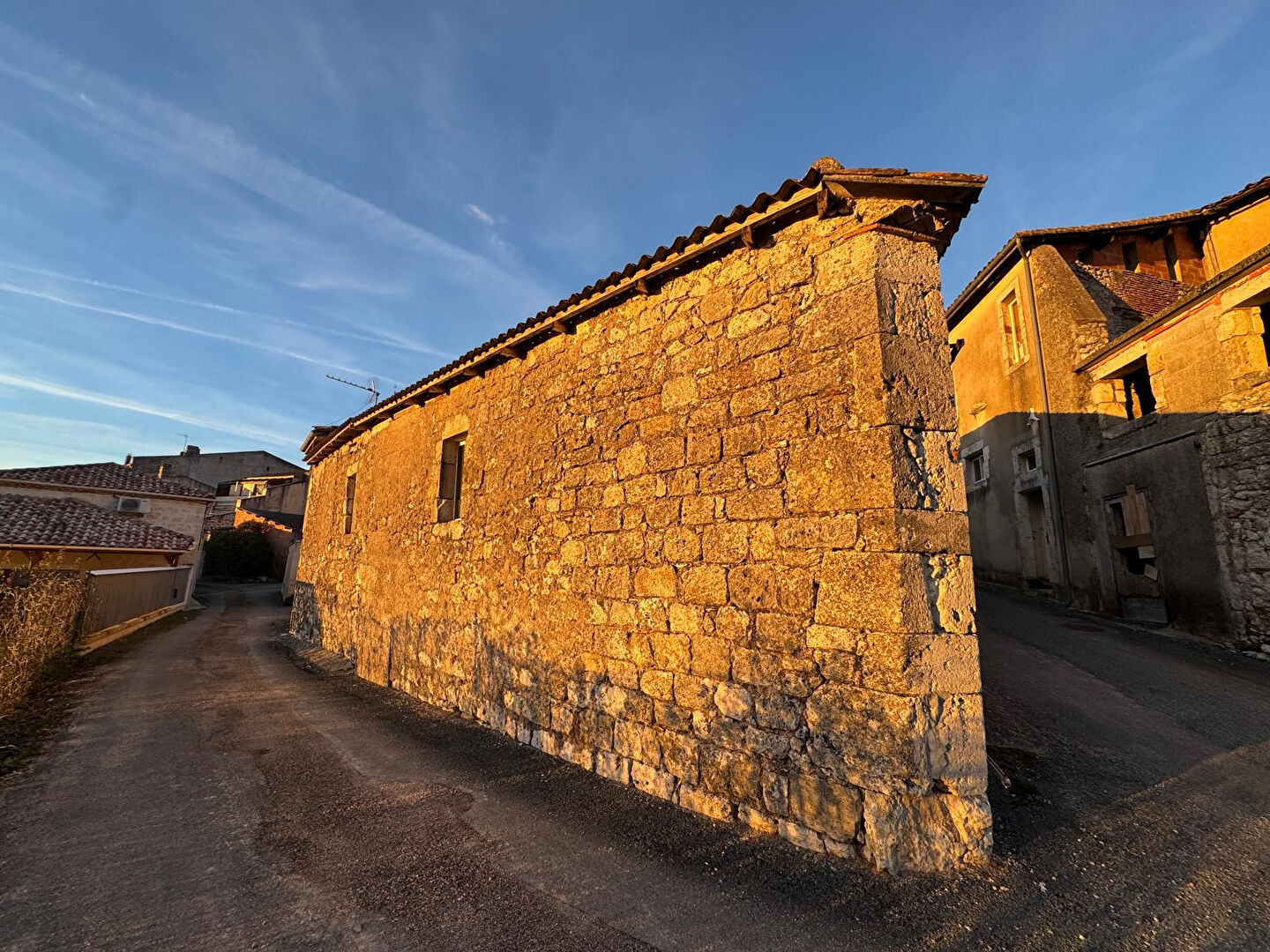 Bâtiment en pierre d'une surface d'environ 80 m2 au sol avec portail au centre bourg du village de Montpezat pouvant faire office de garage ou d'atelier.
