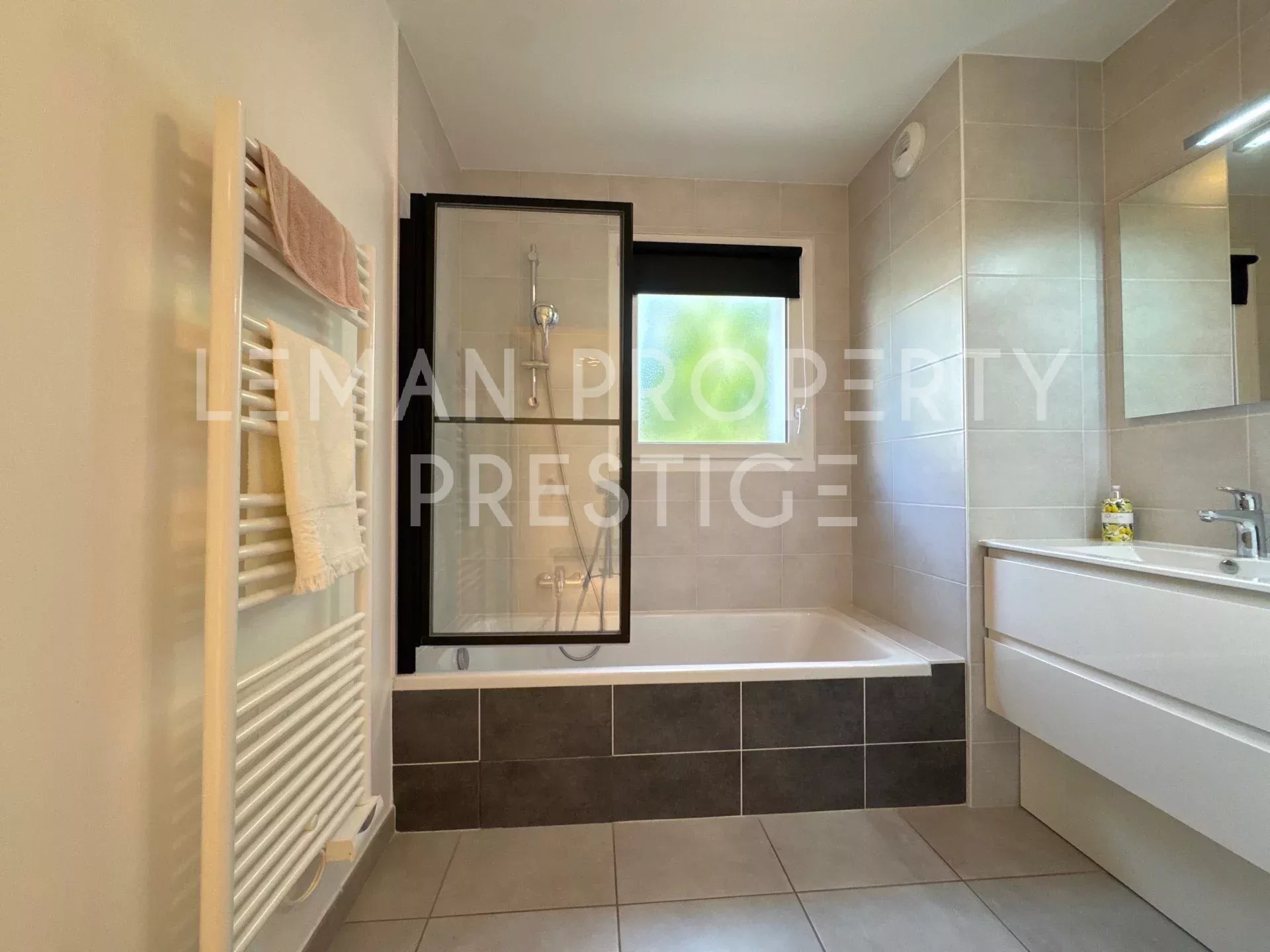 Emplacement de premier ordre pour ce beau 3 pièces rez-de-jardin lumineux dans résidence récente et sécurisée et verdoyante, au pied des Termes et 7min de la gare. Entrée avec placard, séjour avec cuisine ouverte équipée, terrasses et jardin privatif, le coin nuit se compose de deux belles chambres, salle de bains avec fenêtre, WC. Une cave. DOUBLE GARAGE sécurisé avec porte motorisée. Venez le visiter avec LEMAN PROPERTY PRESTIGE. DPE : C et C Nombres de lots : 39 Charges annuelles 1600 euros Pas de procédure en cours Honoraires charge vendeur