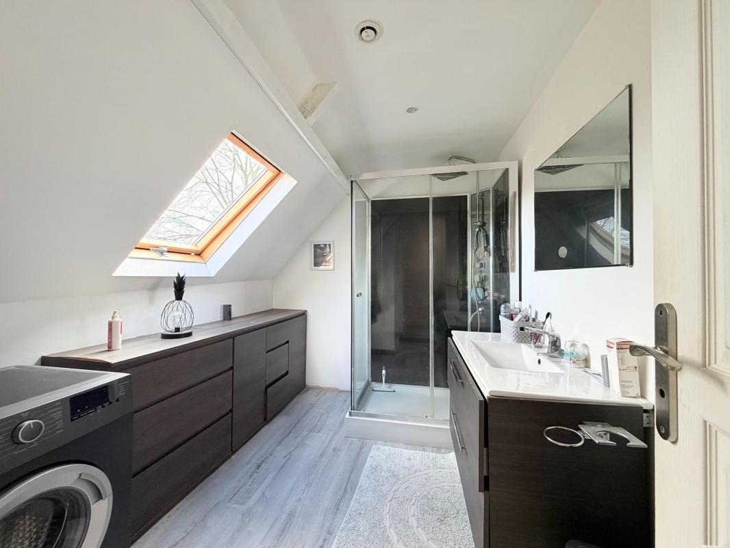 À l'étage, le palier accueille un coin bureau, parfait pour le télétravail ou un espace lecture, ainsi qu'une chambre, une salle de douche et un WC.