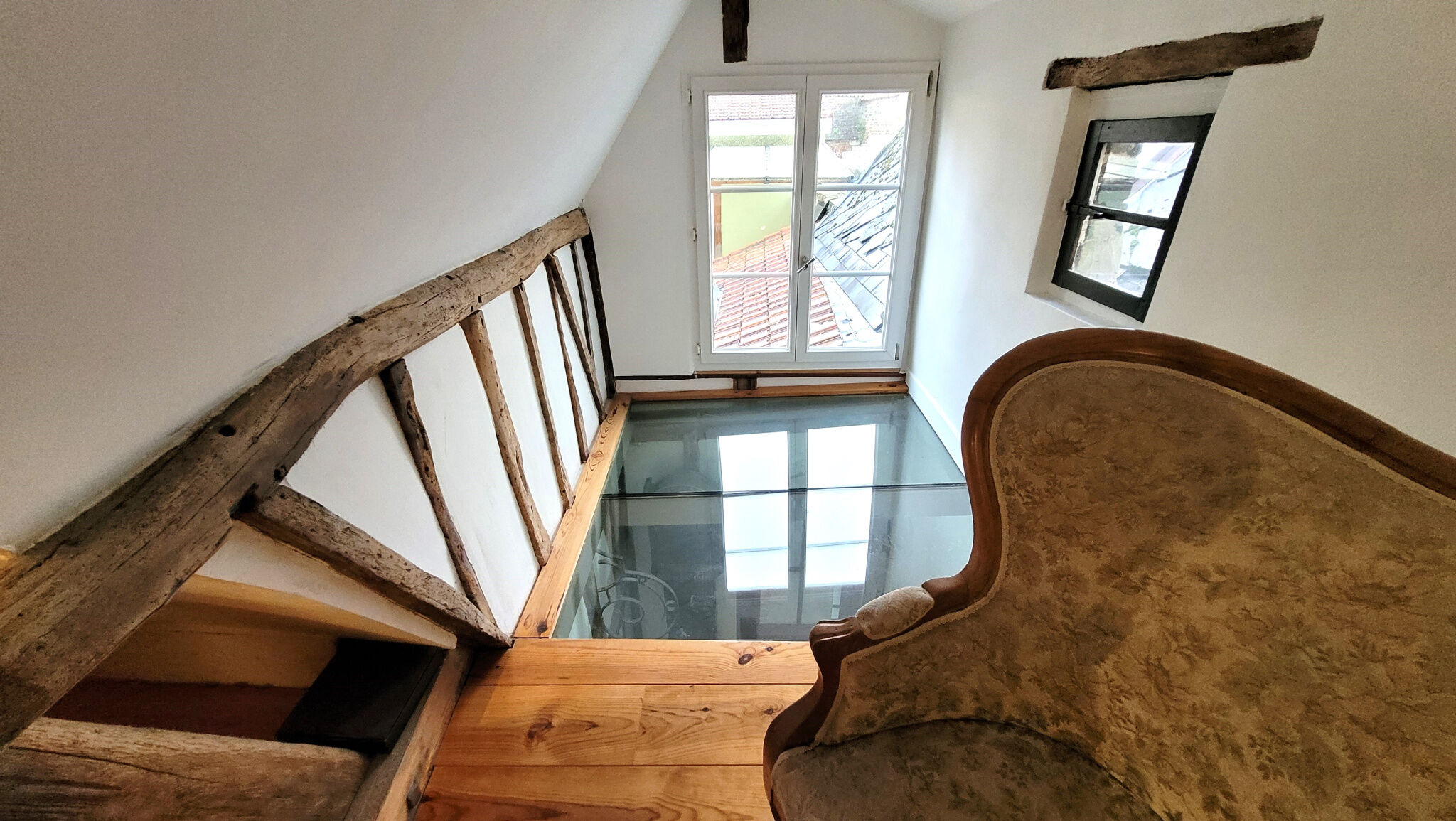 Il se compose d'un grand séjour avec un poêle à pellets, ouvert sur une cuisine ouverte aménagée et équipée (séjour + cuisine : 48 m²). L'espace nuit comprend trois chambres, dont une située à l'étage du duplex. Les deux autres chambres sont attenantes à une cour privative. L'appartement dispose de deux salles d'eau et de deux WC.