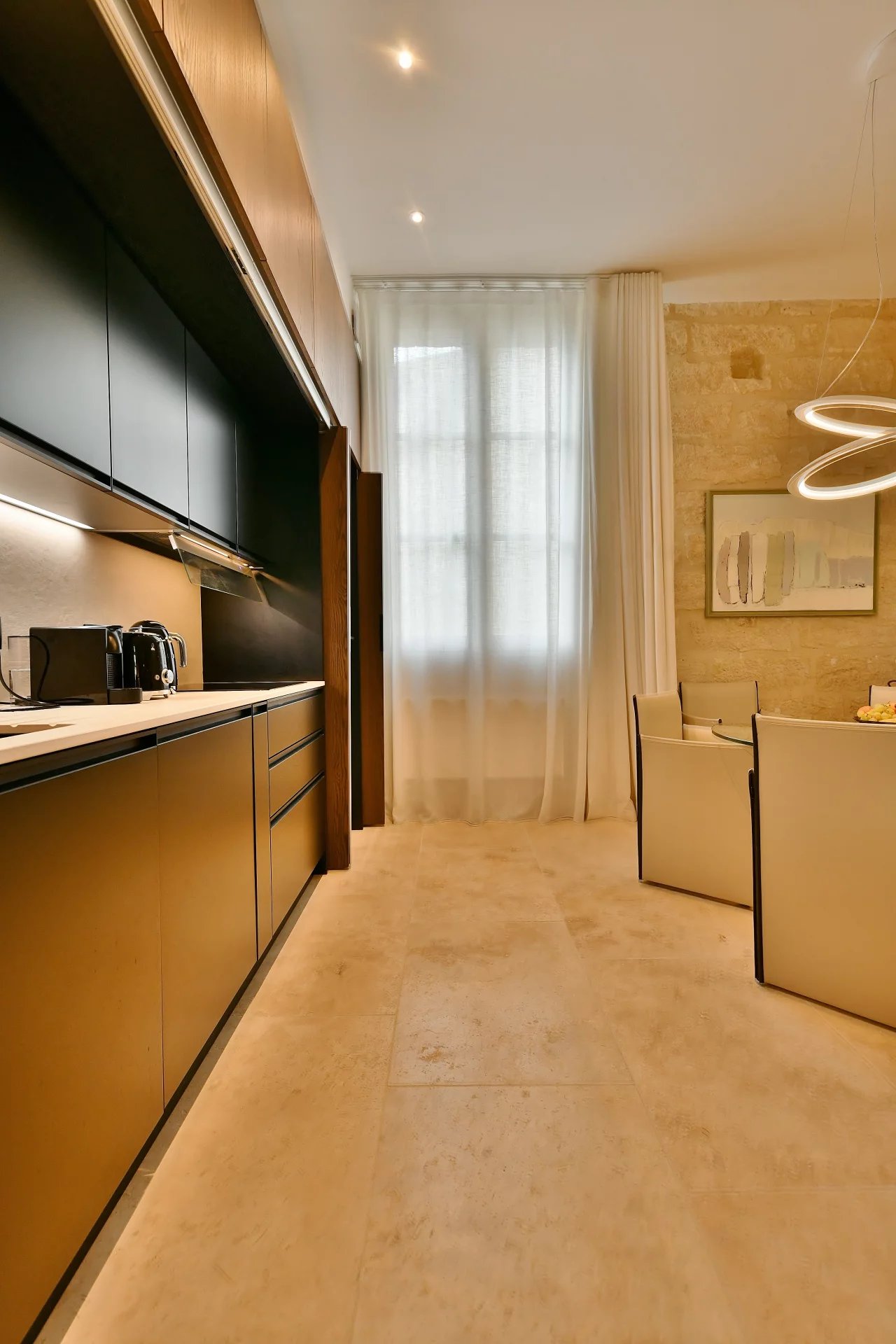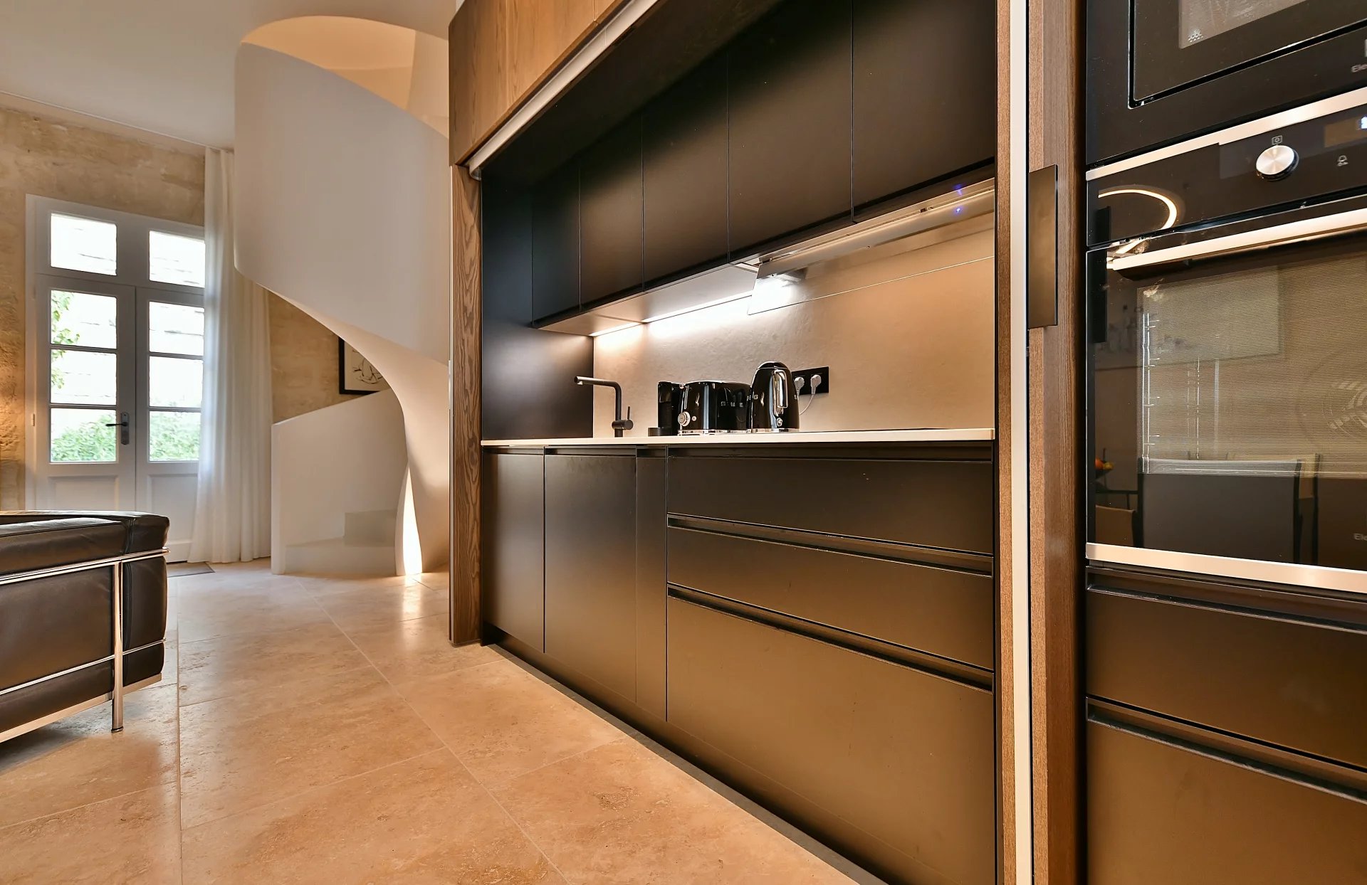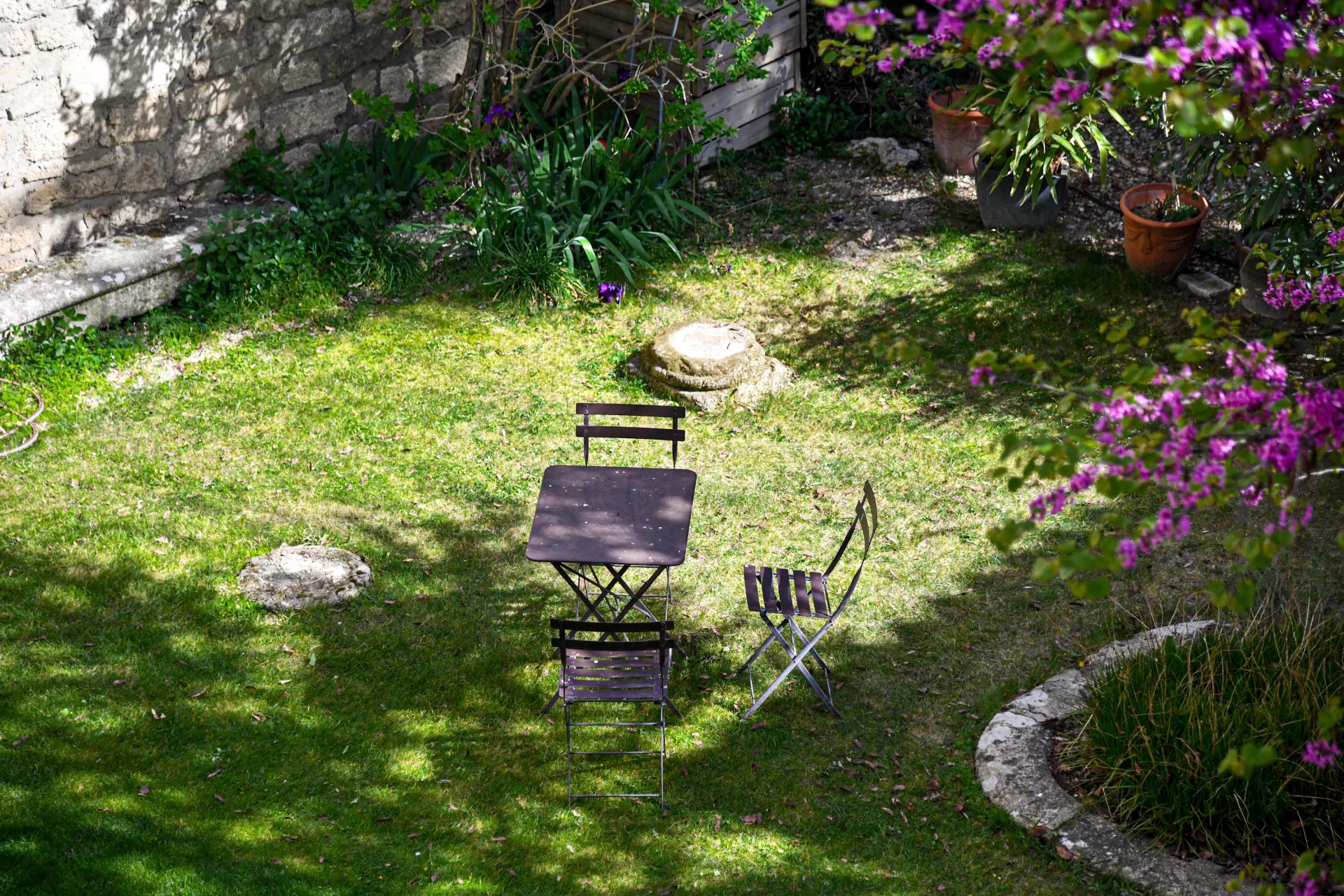 Restauration inspirée du plus grand raffinement Superbe pièce de vie avec cuisine intégrée Large chambre, bureau, salle de bains Jardin à usage privatif, cave, buanderie
