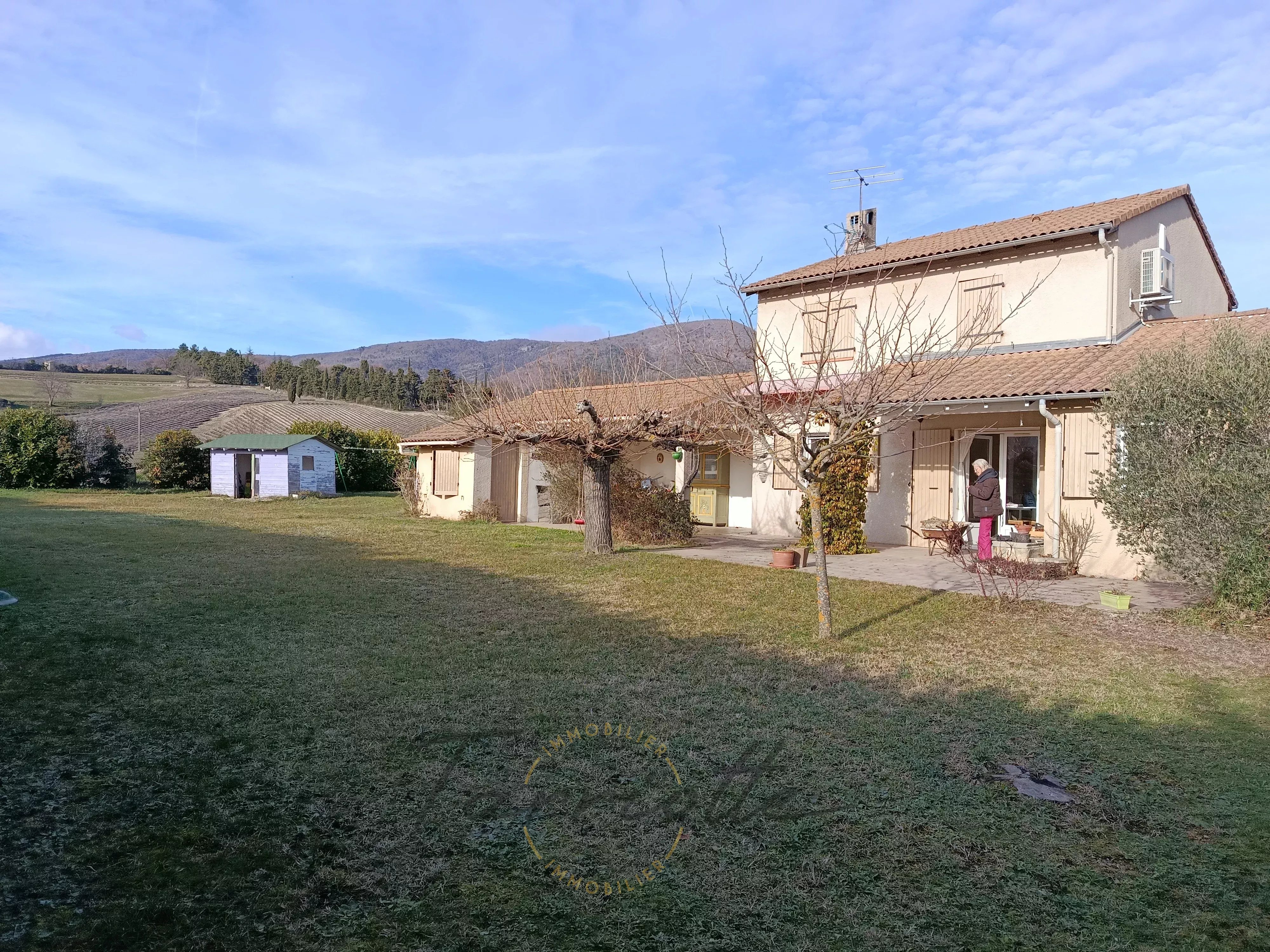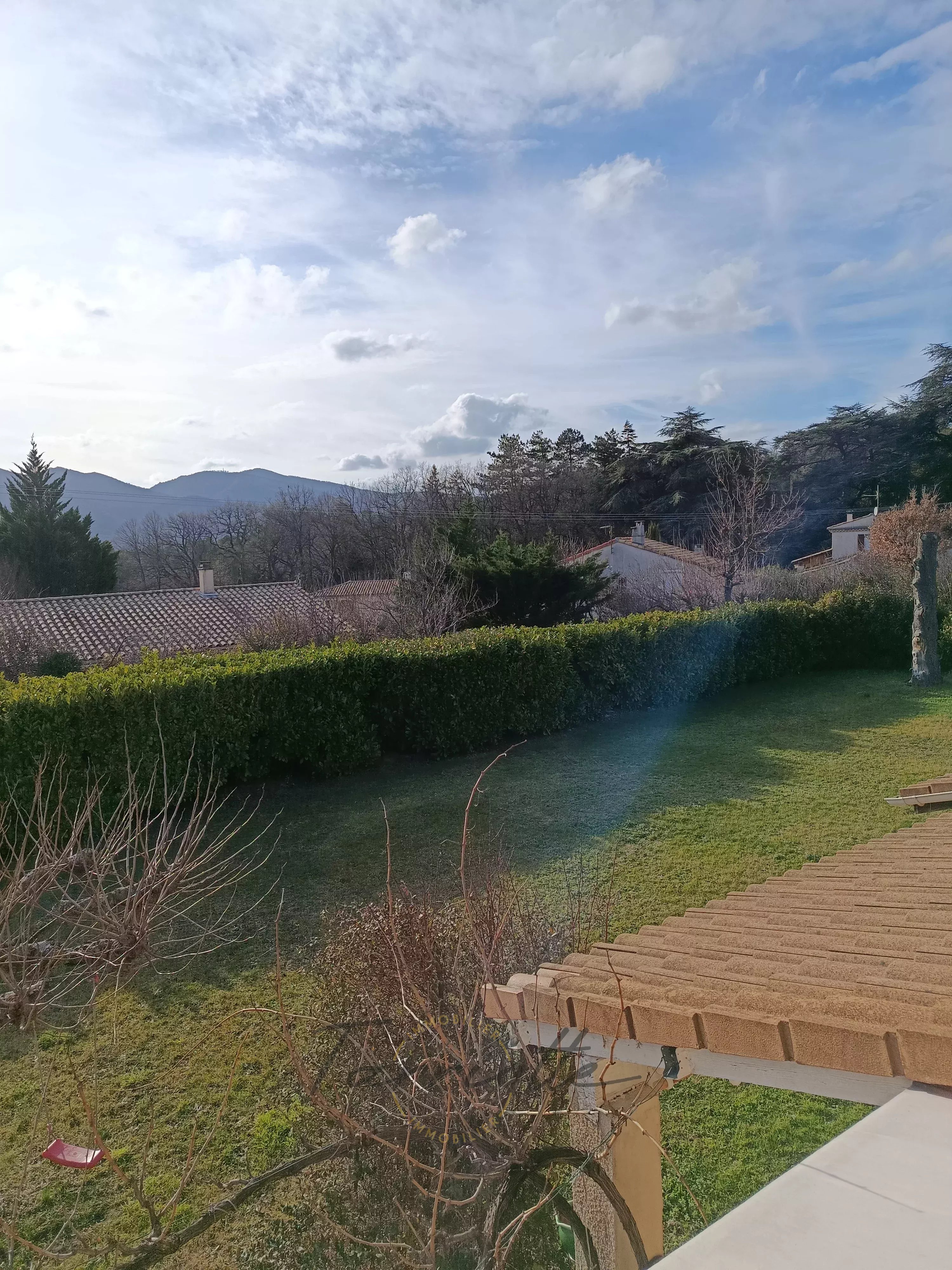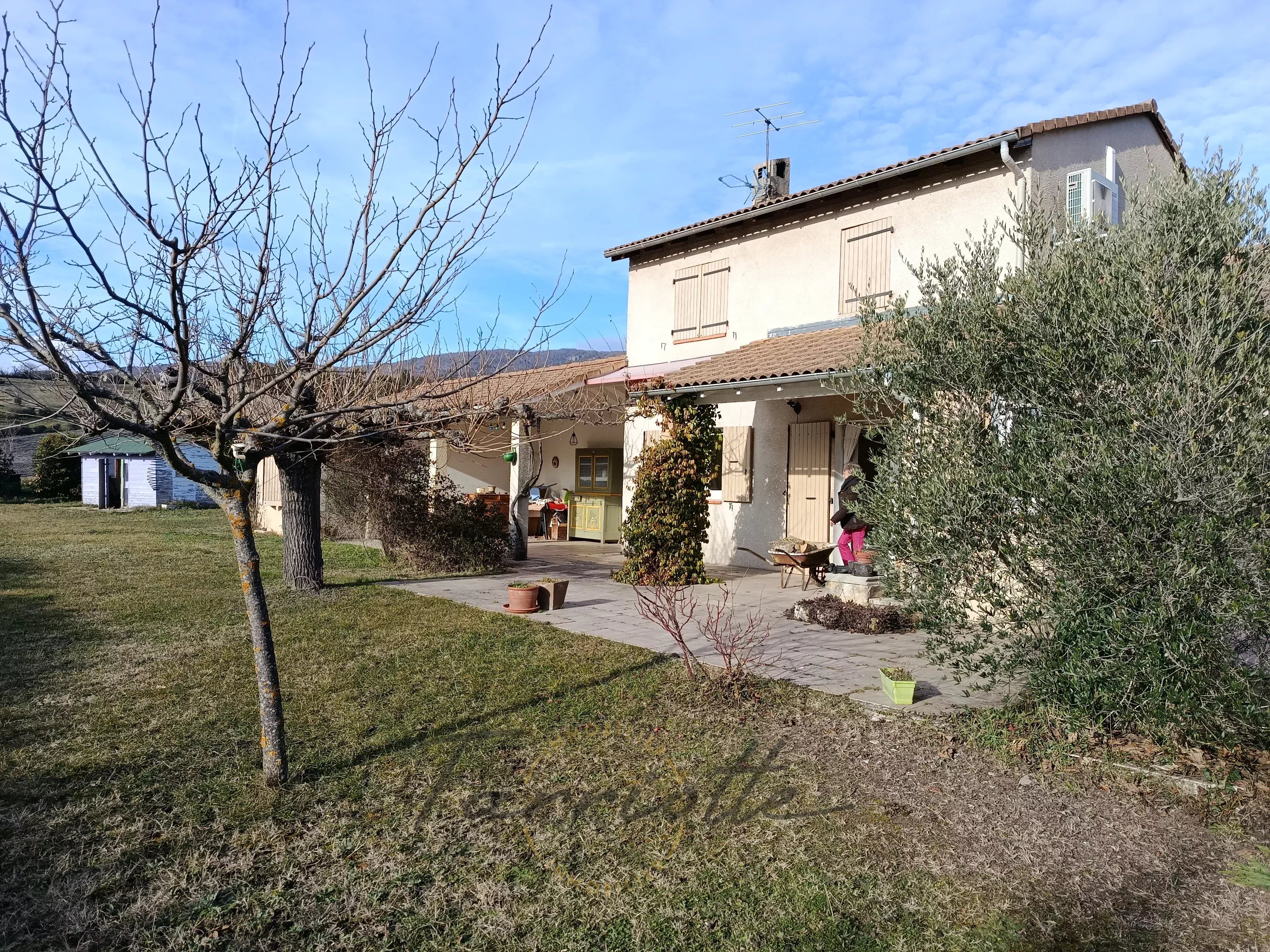 Dieulefit – Villa sur les hauteurs avec piscine et accès au centre à pied Implantée dans un environnement recherché, à seulement 15 minutes à pied du centre de Dieulefit et de ses commerces, cette villa de 1982 profite d’un cadre calme et verdoyant sur un terrain clos de 1 184 m². La maison développe environ 100 m² habitables et offre une belle pièce de vie baignée de lumière, réunissant séjour et cuisine ouverte, agrémentée d’un poêle à bois. L’espace nuit comprend quatre chambres, dont une de plain-pied, tandis que l’étage bénéficie de climatisations réversibles, garantissant un confort optimal toute l’année. À l’extérieur, tout est pensé pour profiter pleinement du cadre : une piscine semi-enterrée de 3 x 8 m, une grande terrasse couverte exposée plein sud, idéale pour les repas et les moments de détente, ainsi qu’un garage, un abri voiture et une cave. Le jardin paysager, sans vis-à-vis, renforce l’atmosphère paisible du lieu. Côté prestations, la villa bénéficie d’une toiture récemment isolée en ouate de cellulose et d’un raccordement au tout-à-l’égout. Un bien rare, alliant calme, proximité immédiate du village et prestations de qualité. À découvrir sans tarder. Prix : 365 000euros HAI , honoraires charges vendeur. Ref 10752 Classe énergie: D Tel : 06.60.88.52.35