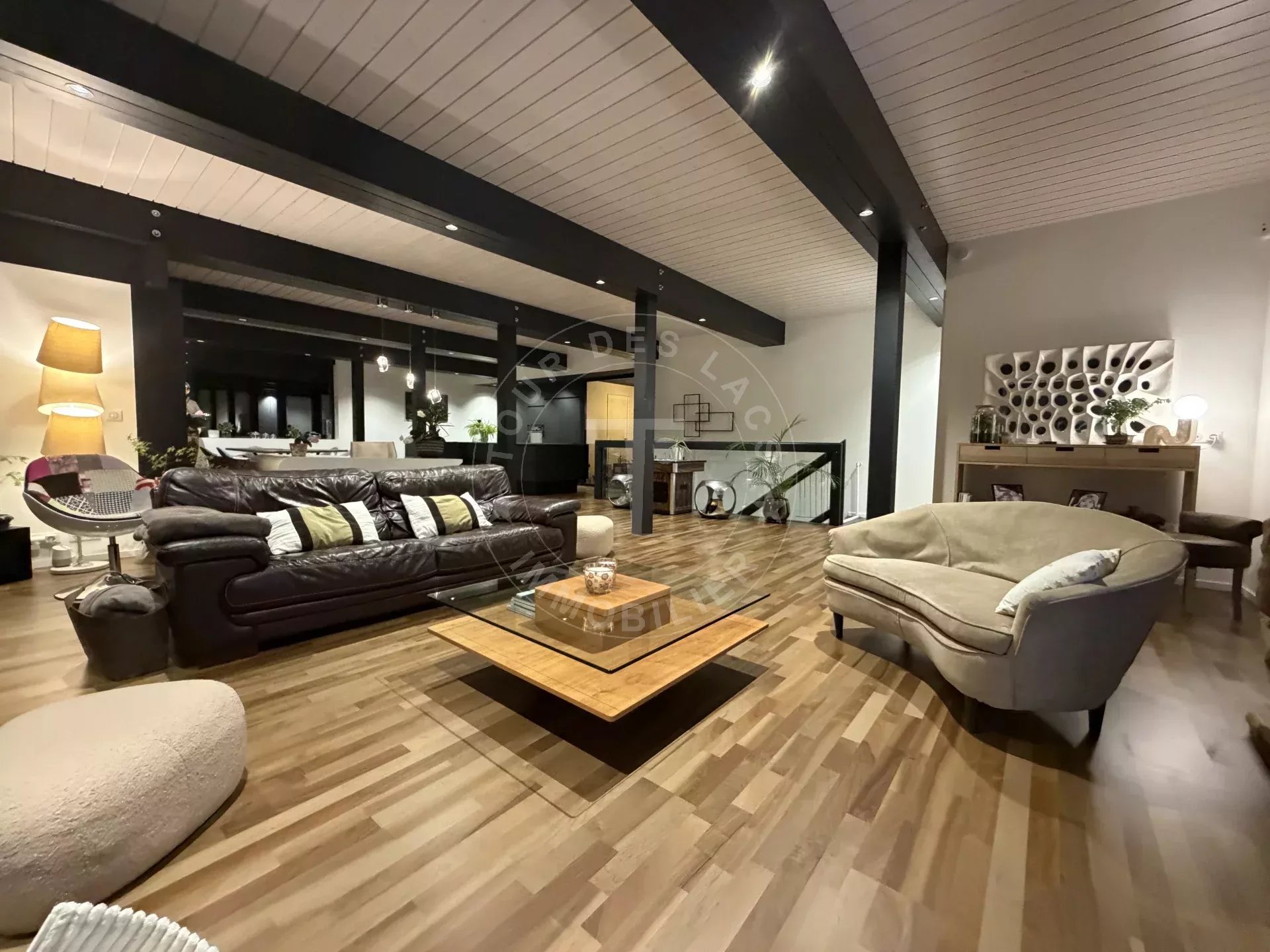 Grâce à ses grandes baies vitrées, elle est baignée de lumière toute la journée ! Sa pièce à vivre d'environ 95 m² se compose d'un salon, d'une salle à manger et d'une cuisine moderne entièrement équipée avec son îlot central et sa cave à vin pour un maximum de convivialité. Depuis ce niveau, vous pourrez accéder à une terrasse face au lac.