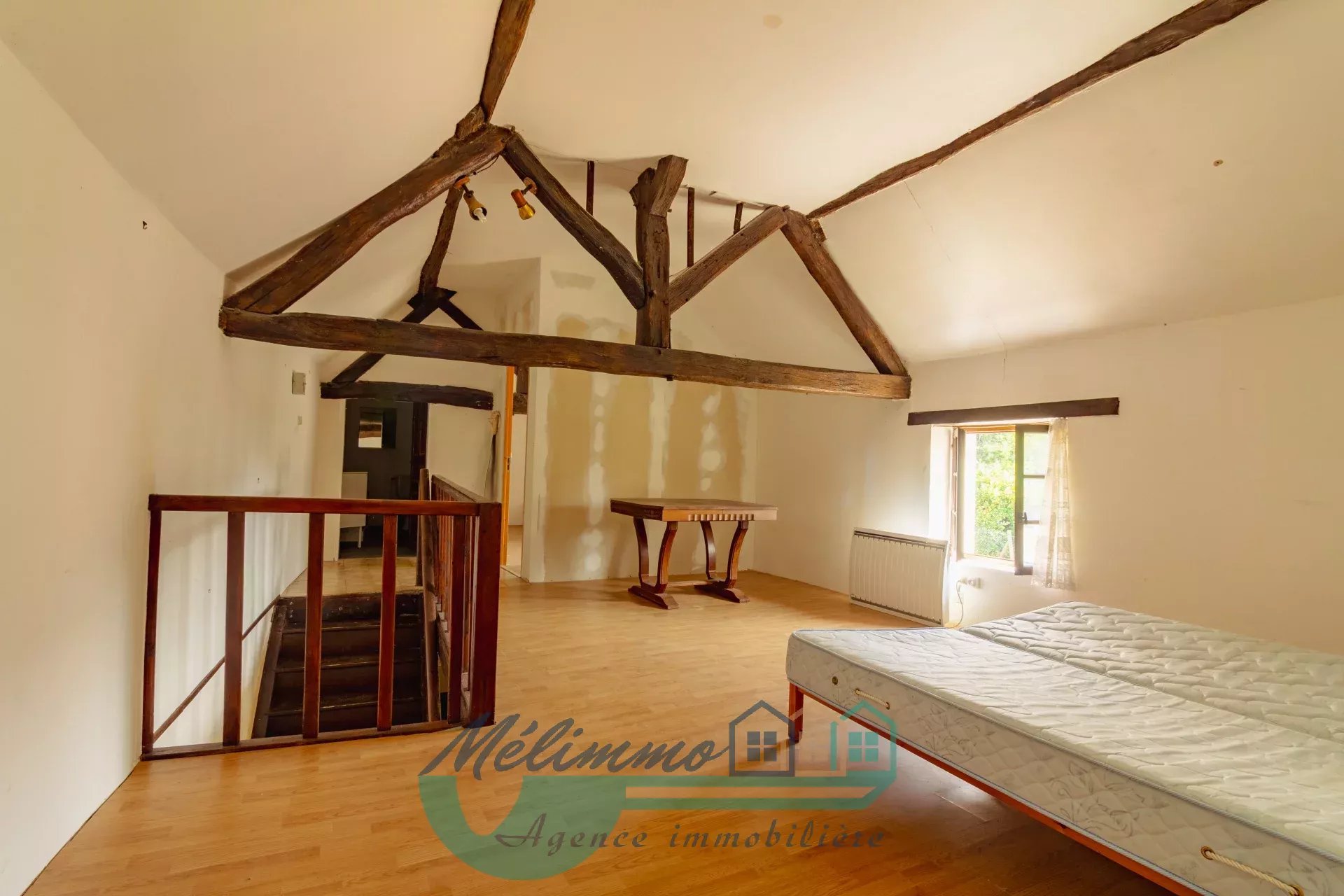 À l'étage une grande pièce palière dessert 2 chambres et une salle de bain avec WC.