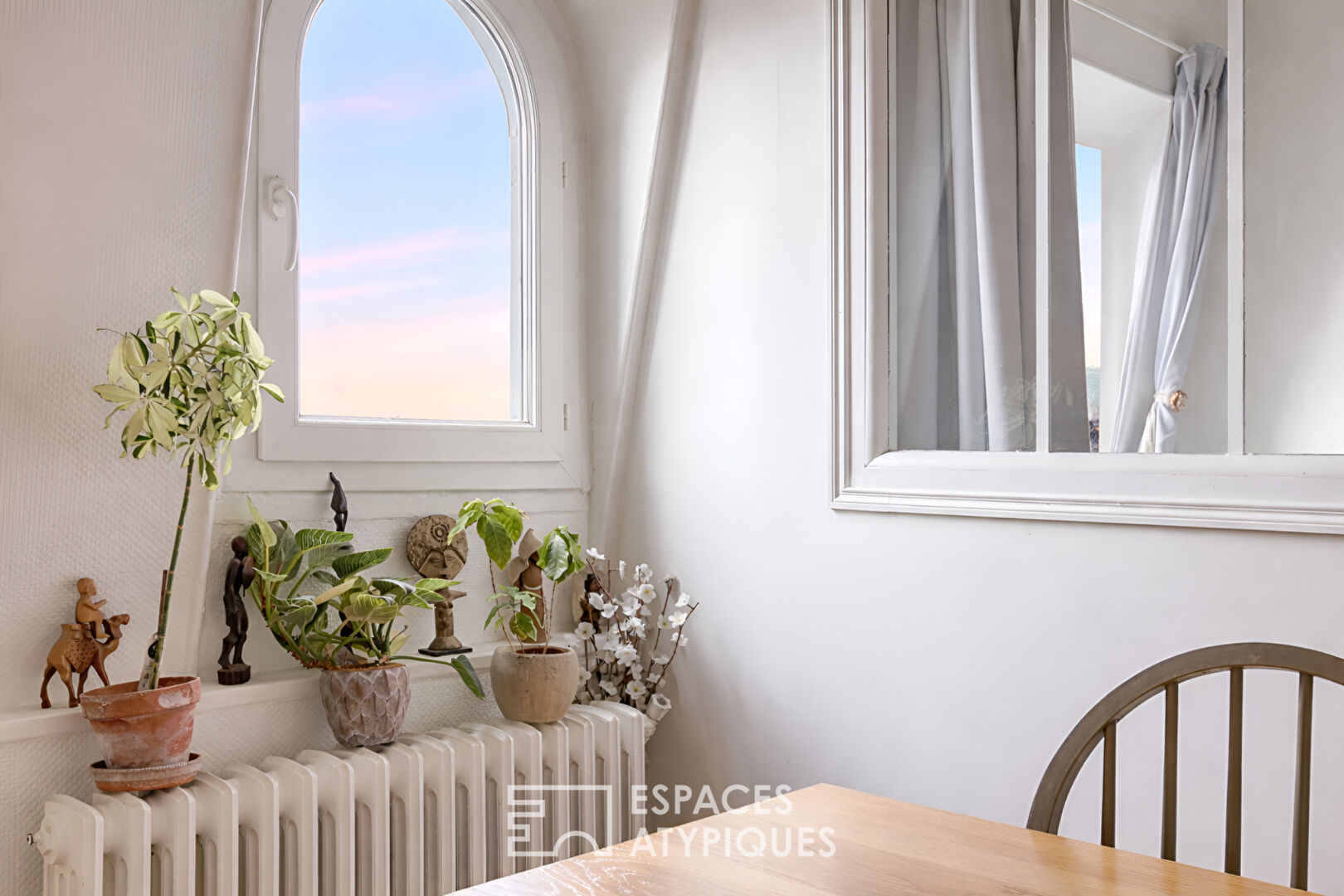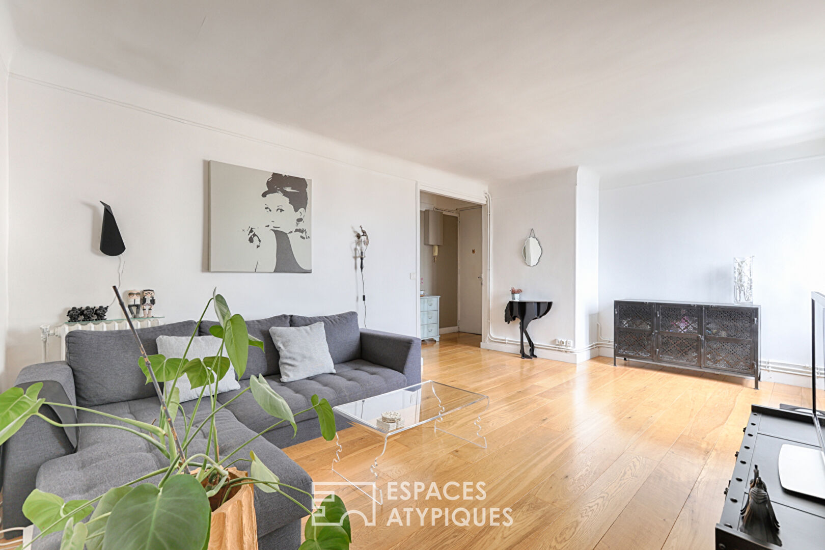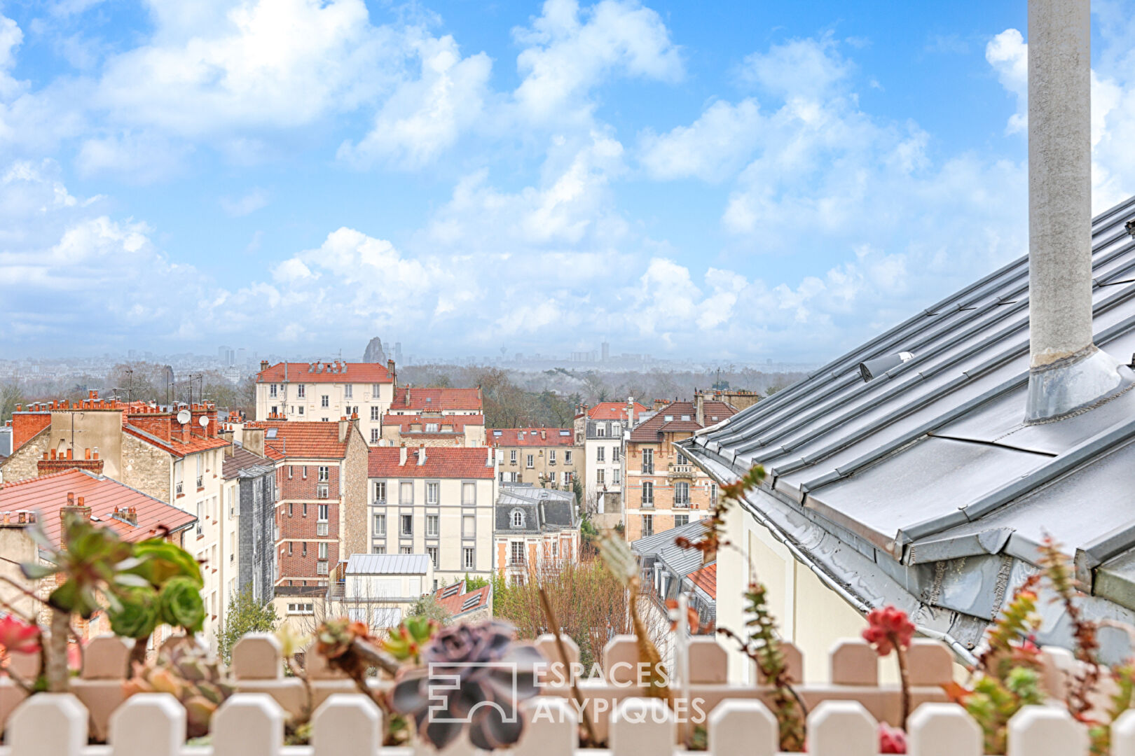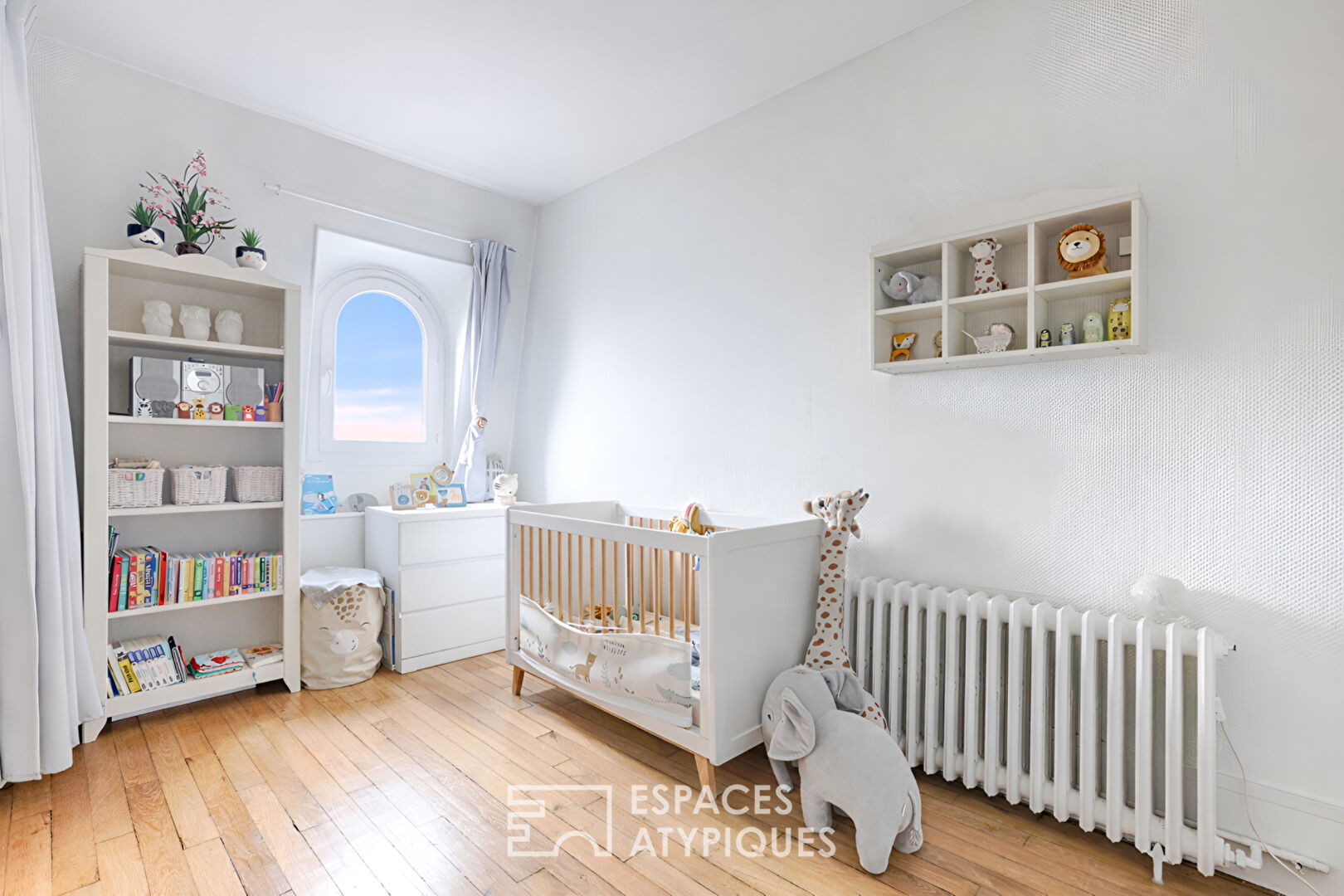 Au sommet du plus bel immeuble du Plateau de Saint-Maurice, édifié en 1896 par Georges Guyon, architecte majeur de la Belle Époque qui a façonné l'identité urbaine de la ville face au Bois de Vincennes, se déploie un appartement d'exception qui tient autant de l'écrin que de l'oeuvre. Une rareté où l'espace s'élève et se respire avec une évidence presque cinématique. A l'étage le plus haut, accessible par un ascenseur qui traverse des parties communes dignes d'un hôtel particulier, ce 64,27 m² Carrez (80 m² au sol) se révèle immédiatement traversant, offrant une vue panoramique inédite qui embrasse le vert profond du Bois de Vincennes, les volumes sculptés du Rocher, et l'horizon de Paris comme un paysage vivant. On entre dans une séquence d'espaces orchestrés avec précision: une entrée généreuse s'ouvre sur un couloir ponctué de rangements, une salle d'eau délicate, et une cuisine ouverte vaste et lumineuse, pensée comme un véritable lieu de partage. Non loin, la première chambre, aujourd'hui chambre d'enfant, capture la lumière d'un ciel changeant, une toile vivante. Puis le salon, véritable pièce maîtresse, s'étend face à cette vue imprenable, où chaque instant de la journée peint l'espace d'une lumière différente. Au bout de cet enchaînement, coiffée par le ciel, une chambre principale nichée sous les toits, dotée de rangements sur mesure réalisés par un menuisier d'exception, compose un refuge intime et parfaitement pensé. L'ensemble, parfaitement entretenu, ne nécessite aucun travaux et se vit comme un manifeste de l'élégance tranquille : une architecture qui dialogue avec la lumière, une orientation qui capte l'air et l'horizon, une sensation d'être suspendu au-dessus de la ville tout en restant ancré dans le quartier vivant et raffiné de Saint-Maurice Plateau. Une cave accompagne naturellement ce bien, un local vélo simplifie le quotidien, et au coeur de l'immeuble, un jardin intérieur offre une respiration inattendue. Un lieu discret où, parfois, se célèbrent des anniversaires entre les fleurs et les éclats de rire. A quelques pas, les commerces, le marché, le métro et les promenades dans le bois confèrent à cette adresse une respiration rare : la vitalité d'une commune prisée, à deux foulées de Paris, où le quotidien se mêle à la sérénité des espaces verts et à la douceur d'un art de vivre incomparable. Métro Charenton École: 5 min à pied Commerces : 1 min à pied Écoles : 2 à 5 min à pied CLASSE ÉNERGIE : E CLASSE CLIMAT : E Prix moyen des énergies indexés sur les années 2021,2022,2023 : 1720 euros et 2370 euros. Les informations sur les risques auxquels ce bien est exposé sont disponibles sur le site Géorisques : https://www.georisques.gouv.fr Contact : Mélanie Famuliak 07 69 44 20 88 - EI - Agent Commercial - RSAC: 907 896 245 Bobigny Copropriété de 21 lots - dont 9 lots habitation. (Pas de procédure en cours). Charges annuelles : 1700 euros. Mélanie FAMULIAK (EI) Agent Commercial - Numéro RSAC : 907 896 245 - Bobigny.