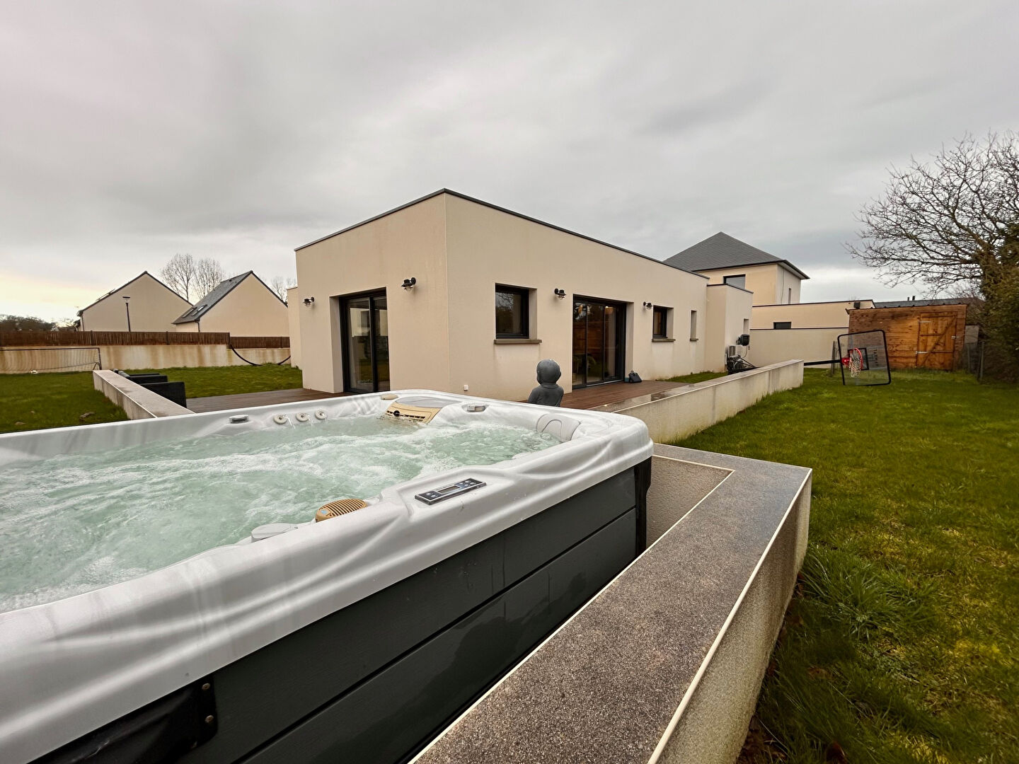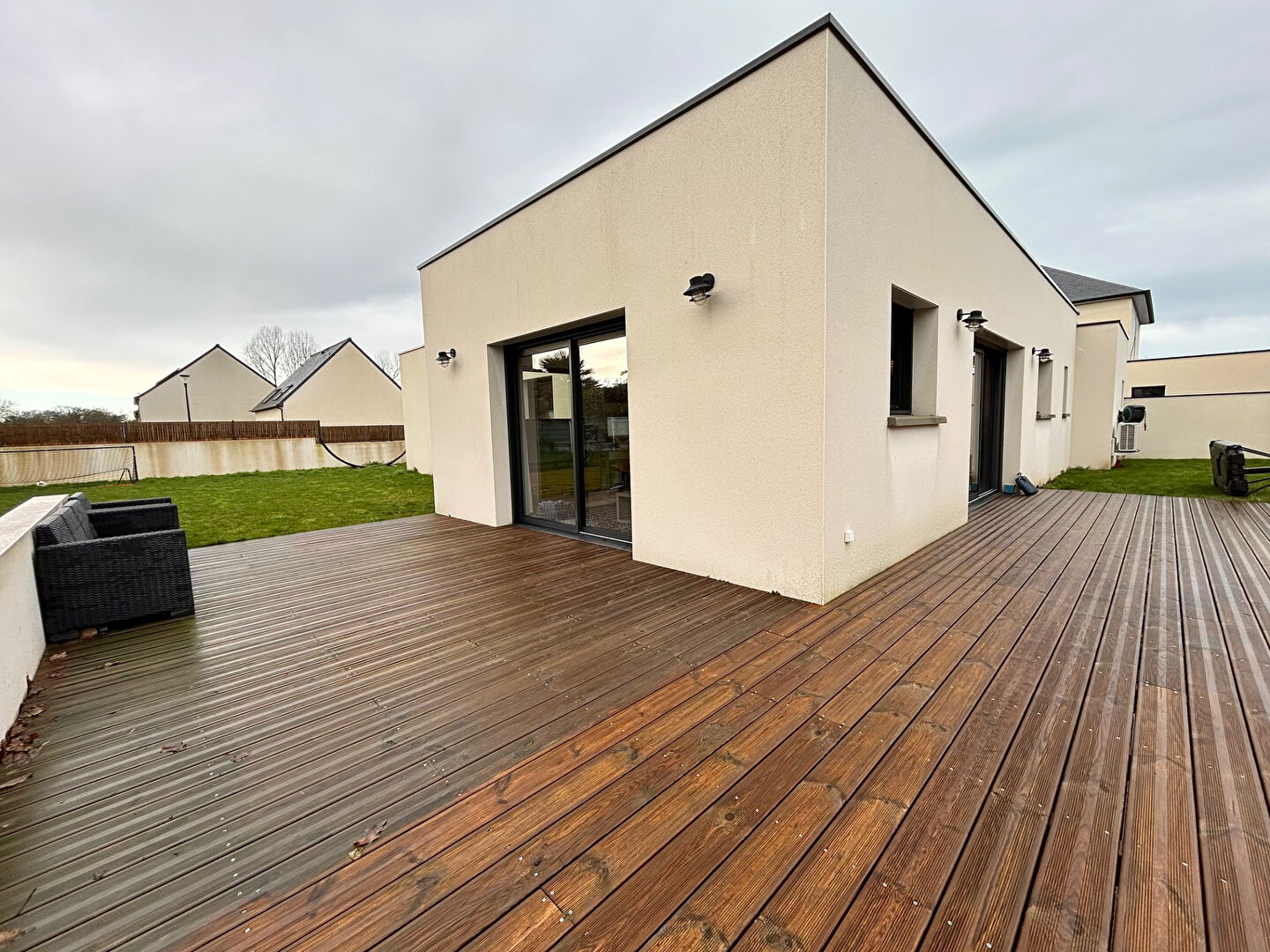 TREVENEUC, magnifique contemporaine neuve aux abords de Saint-Quay Portrieux, venez découvrir cette maison de plain-pied clé en main offrant de beaux volumes, comprenant : entrée avec placard, vaste pièce de vie baignée de lumière de près de 50 m² bénéficiant d'un accès direct sur une grande terrasse bois donnant sur le jardin, une jolie cuisine aménagée et équipée, dégagement, salle de bains, WC, chambre parentale avec dressing et salle d'eau privative, deux autres chambres avec placard intégré, une buanderie, WC. Beau jardin, jacuzzi, garage. NEUVE, PLAIN-PIED, LUMINEUSE, AU CALME, PROCHE MER, COUP DE COEUR... (4.00 % honoraires TTC à la charge de l'acquéreur.)