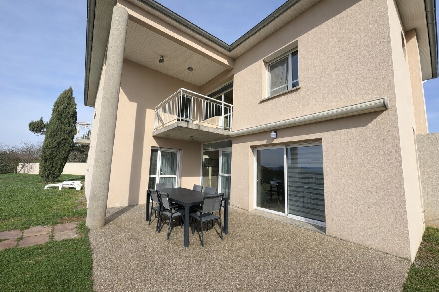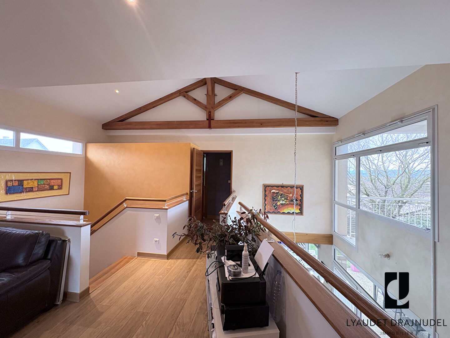 L'agence Lyaudet Drajnudel, spécialiste en immobilier d'entreprise et résidentiel, vous propose à la vente cette élégante maison d'architecte située à Pinay, dans un environnement calme et verdoyant, à seulement 20 min de Roanne et à proximité immédiate de la RN82 en direction de Lyon et Saint-Étienne. Développant environ 207 m² habitables sur une parcelle arborée de plus de 2 160 m², cette propriété séduit par ses volumes et sa luminosité. Le rez-de-chaussée offre une entrée avec rangements, un vaste séjour salon avec belles hauteurs sous plafond et cheminée à foyer fermé, un accès direct à la terrasse, une cuisine indépendante, une chambre avec salle d'eau et WC, ainsi qu'une buanderie et un double garage avec portes motorisés. A l'étage, une mezzanine dessert quatre chambres dont deux avec accès balcon/ terrasse, une salle de bains avec douche et baignoire et un WC indépendant. Le terrain clos et sécurisé accueille une piscine creusée et un cabanon de rangement. La maison dispose d'un chauffage au sol avec système rafraîchissant, d'une pompe à chaleur air/ eau, d'une isolation des combles récente, de double vitrage PVC et de 24 panneaux solaires permettant une autoconsommation, offrant ainsi un très bon DPE. Une maison familiale lumineuse et confortable, idéale pour ceux qui recherchent espace, modernité et qualité de vie. Pour plus d'informations sur les risques associés à ces biens, consultez le site Géorisques : http://www.georisques.gouv.fr