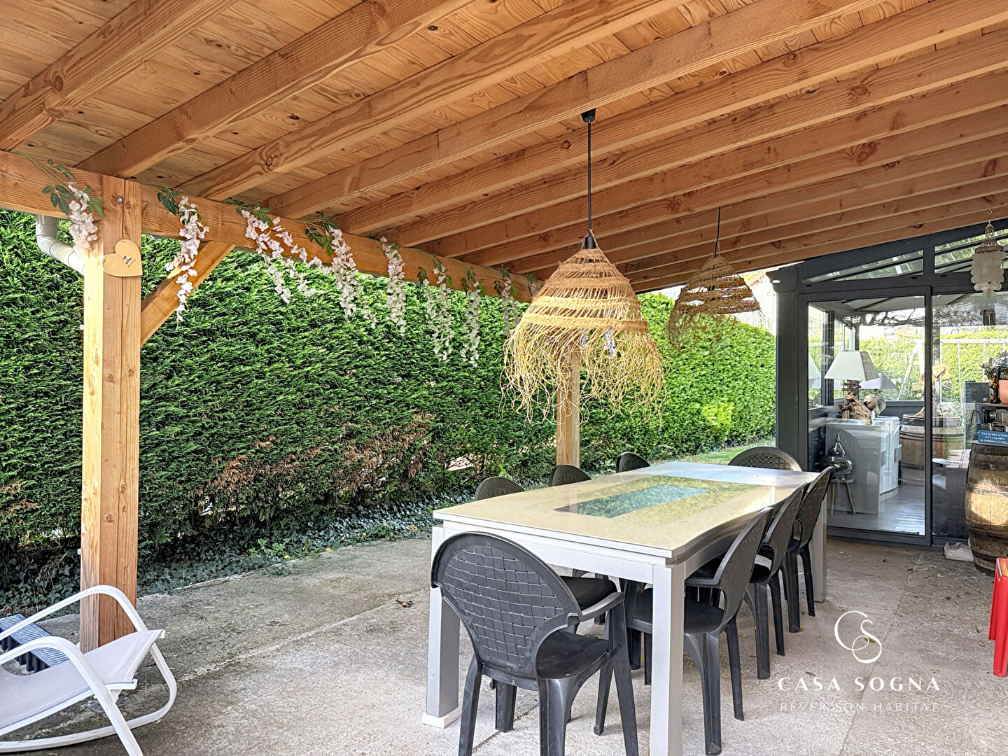 Casa Sogna vous présente en exclusivité cette belle maison jumelée située à Leyment, à seulement 7 minutes d'Ambérieu-en-Bugey, dans un environnement résidentiel, calme et très recherché, idéal pour une vie de famille. Avec plus de 154 m² habitables sur un terrain de 755 m², cette maison de 2005 offre de beaux volumes et une organisation parfaitement pensée. Au RDC, elle s'ouvre sur une entrée donnant sur une grande pièce de vie lumineuse traversante avec cuisine ouverte équipée, prolongée par une véranda de plus de 25 m², ajoutée en 2014, intégrée à la surface habitable, sans vis-à-vis, et offrant une belle vue sur les extérieurs. Cette véranda dessert directement la terrasse couverte ainsi que le jardin paysagé, créant une vraie continuité entre intérieur et extérieur. Un cellier/buanderie attenant à la cuisine et une chambre parentale avec coin d'eau et rangements, donnant sur une terrasse, des toilettes séparés ainsi qu'une deuxième chambre complètent ce niveau. A l'étage, un palier dessert 3 chambres, toilettes séparés et salle de bains avec douche et baignoire. A l'extérieur, vous profitez d'un cagibi (près de 9 m²), issu de l'aménagement d'une partie du garage en chambre parentale. L'ensemble s'accompagne d'une vaste cour pouvant accueillir jusqu'à 4 véhicules, prolongée par un chemin équipé d'un portail motorisé. Le terrain est entièrement aménagé et paysagé, comprenant une terrasse couverte, un coin cuisine d'été, une terrasse non couverte ainsi qu'une superbe piscine chauffée offrant un véritable espace de détente pour la belle saison. Le tout sans vis-à-vis notable et dans un secteur prisé pour sa tranquillité et sa proximité des commodités. Une maison familiale, chaleureuse, bien entretenue, hors copropriété et hors lotissement, prête à accueillir ses nouveaux propriétaires. Visite virtuelle sur demande! DPE: C / GES: C Prix moyens des énergies indexés sur les années 2021, 2022, 2023 (abonnements compris): entre 1800 euros et 2450 euros. Prix: 389 000 euros Honoraires Agence inclus à la charge du vendeur. Pour toute information complémentaire ou pour organiser une visite, contactez Sonia Dridi au 06 82 10 06 84 Agent immobilier immatriculé RCS 935 359 489 www.casa-sogna.immo 16 Rue Alexandre Bérard, 01500 Ambérieu-en-Bugey