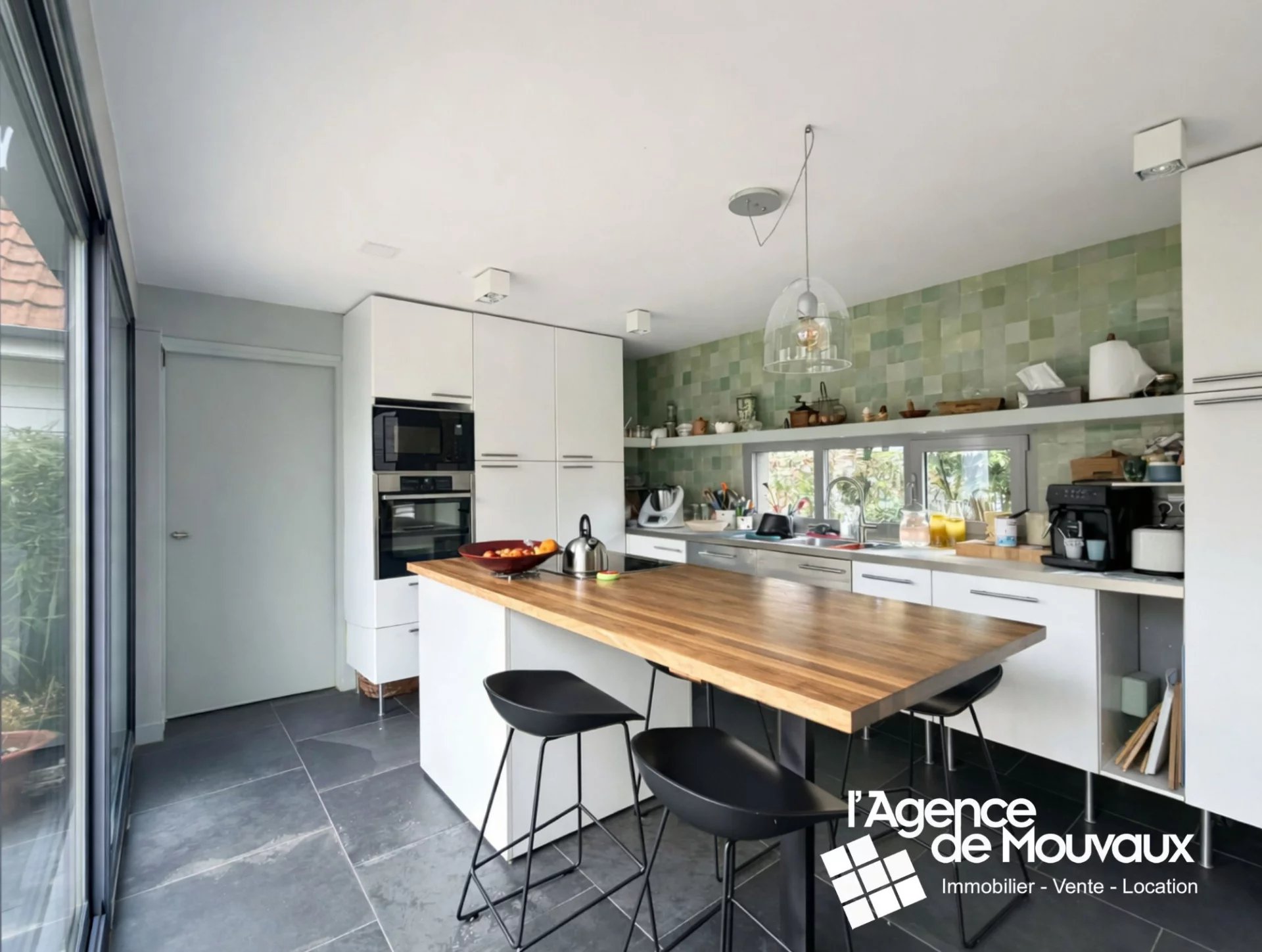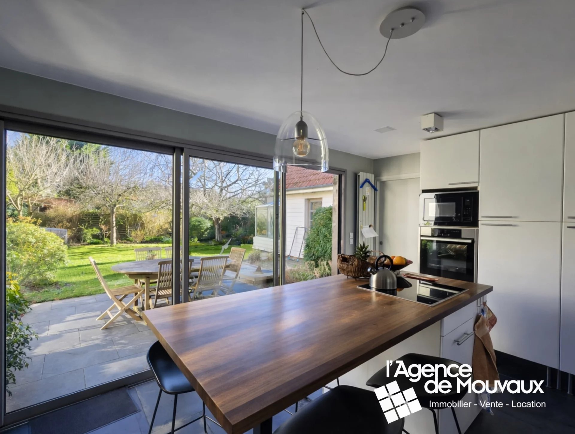 Elle offre de beaux espaces de vie comprenant une grande salle à manger, un salon, une salle TV ainsi qu’un bureau. La vaste cuisine équipée, conviviale et lumineuse, s’ouvre grâce à une large baie vitrée sur un grand jardin exposé plein sud.