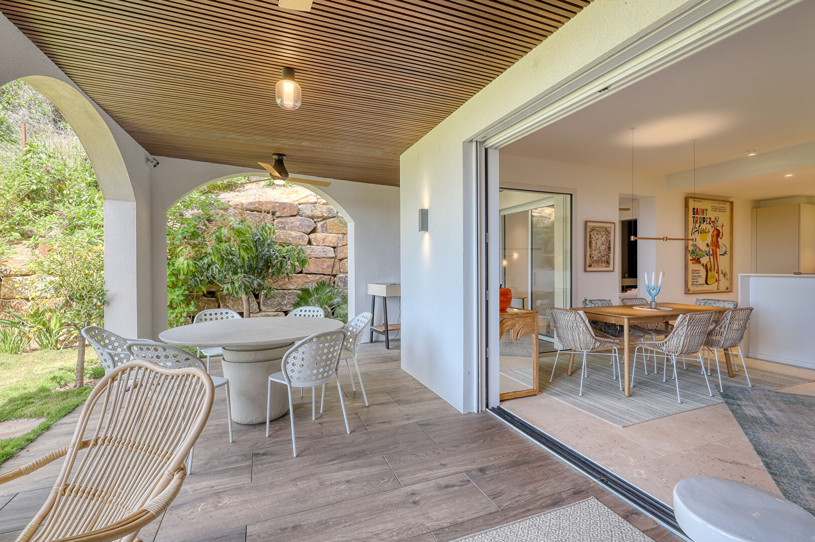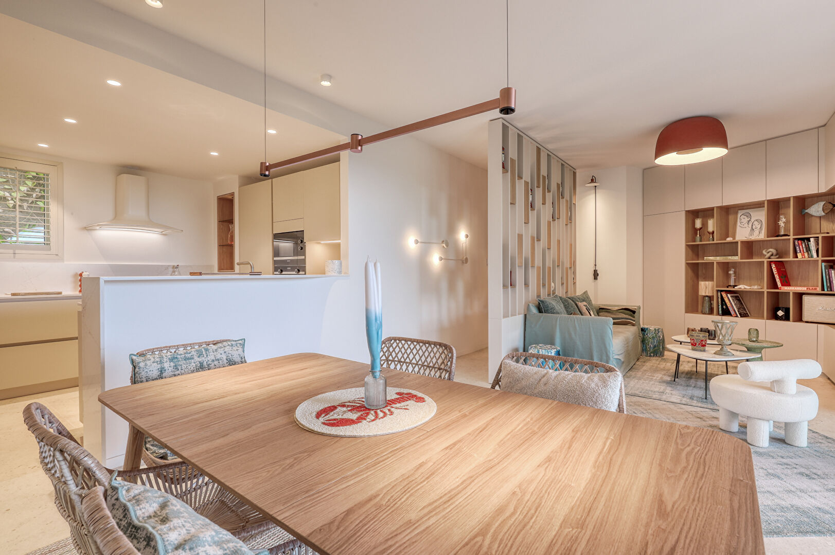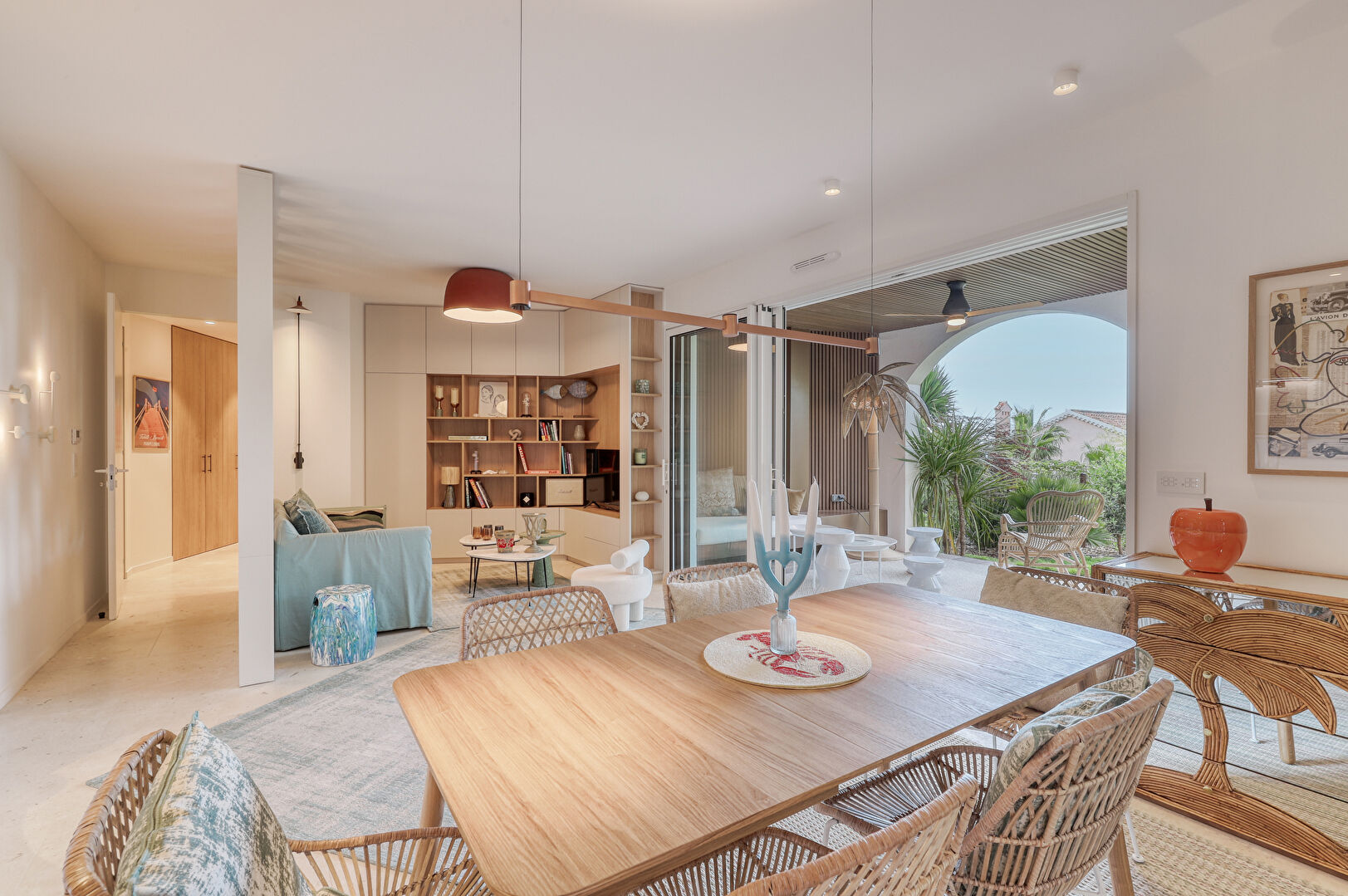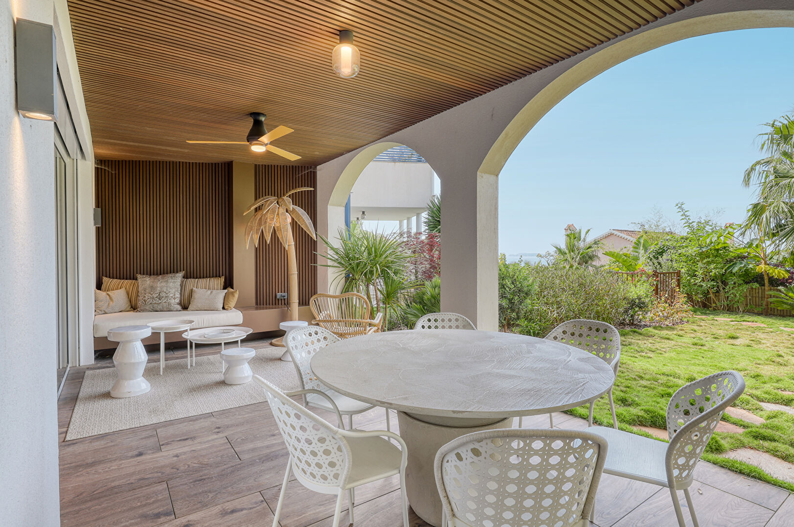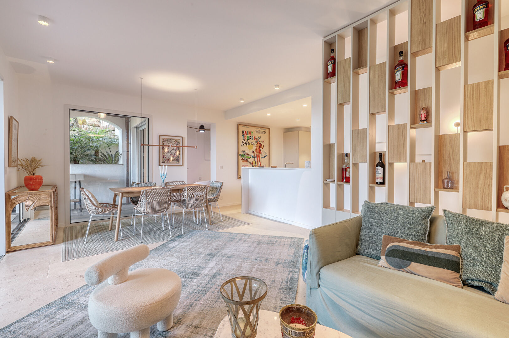 83820 RAYOL CANADEL. VUE MER. UNIQUE Situé dans une résidence prestigieuse 2022. GRAND STANDING. Appartement type 5P 107 m² habitable + 160 m² de JARDIN. Entrée privative. salon + salle à manger 40 m² donnant sur loggia 20 m² et un jardin privatif 160 m², paysagé avec des essences exotiques et une magnifique VUE SUR MER + cuisine équipée ( haut de gamme° avec bar US,3 chambres (donnant sur végétation tropicale et jardin tropicale) , chacune avec salle d'eau, dont une MASTER BEDROOM avec dressing, salle de eau WC japonais, nombreux rangements, toilettes invités. PISCINE . BOX Fermé avec rideau électrique. PRESTATION HAUT DE GAMME (4.00 % honoraires TTC à la charge de l'acquéreur.) Copropriété de 20 lots - dont 10 lots habitation. Charges annuelles : 6000 euros.