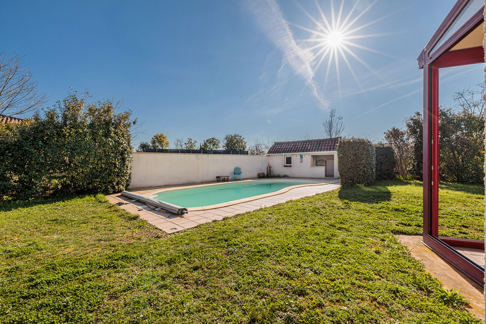 Exclusivité et visite virtuelle immersive 3D disponible ! Bel emplacement pour cette maison familiale en R+1 de type 5 d'une superficie d'environ 157 m² sur belle parcelle de 1 038 m². Ce bien se compose au rez-de-chaussée d'un hall d'entrée avec placard sous escalier, un séjour équipé d'un poêle à bois chauffant l'intégralité de la maison, une cuisine avec accès sur une belle terrasse couverte d'une part, et sur une véranda d'autre part, un coin télé intimiste, un WC ainsi qu'une suite parentale. A l'étage, un spacieux pallier dessert les WC, une salle d'eau avec une douche italienne ainsi que trois chambres. Un espace bureau ou détente peut être aménagé sur le pallier de l'étage. A l'extérieur: piscine au sel 9.50 x 4.10 avec son pool house et sa douche extérieure solaire, local vélo fermé à clé, abri de stockage de bois, appentis permettant de garer des véhicules. Equipements : chauffe-eau solaire, volets roulants électriques, buanderie avec mezzanine. (4.39 % honoraires TTC à la charge de l'acquéreur.) Typhaine CALMELS (EI) Agent Commercial - Numéro RSAC : 978340206 - TOULOUSE.
