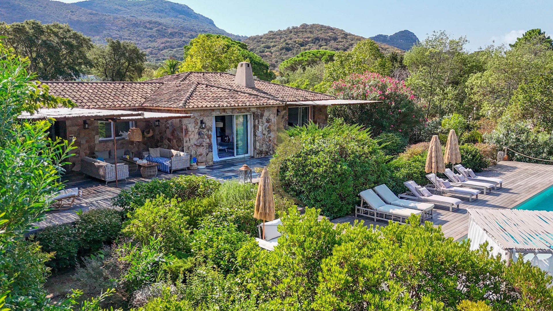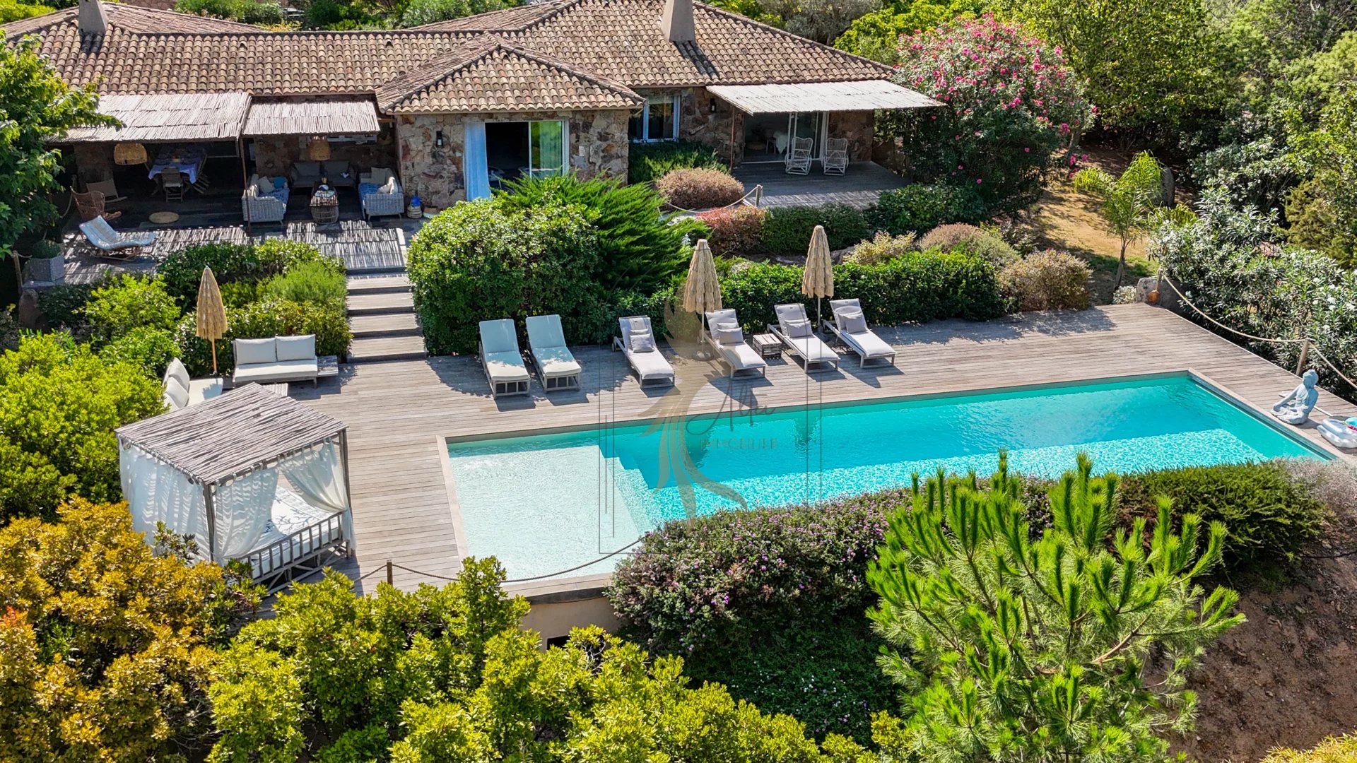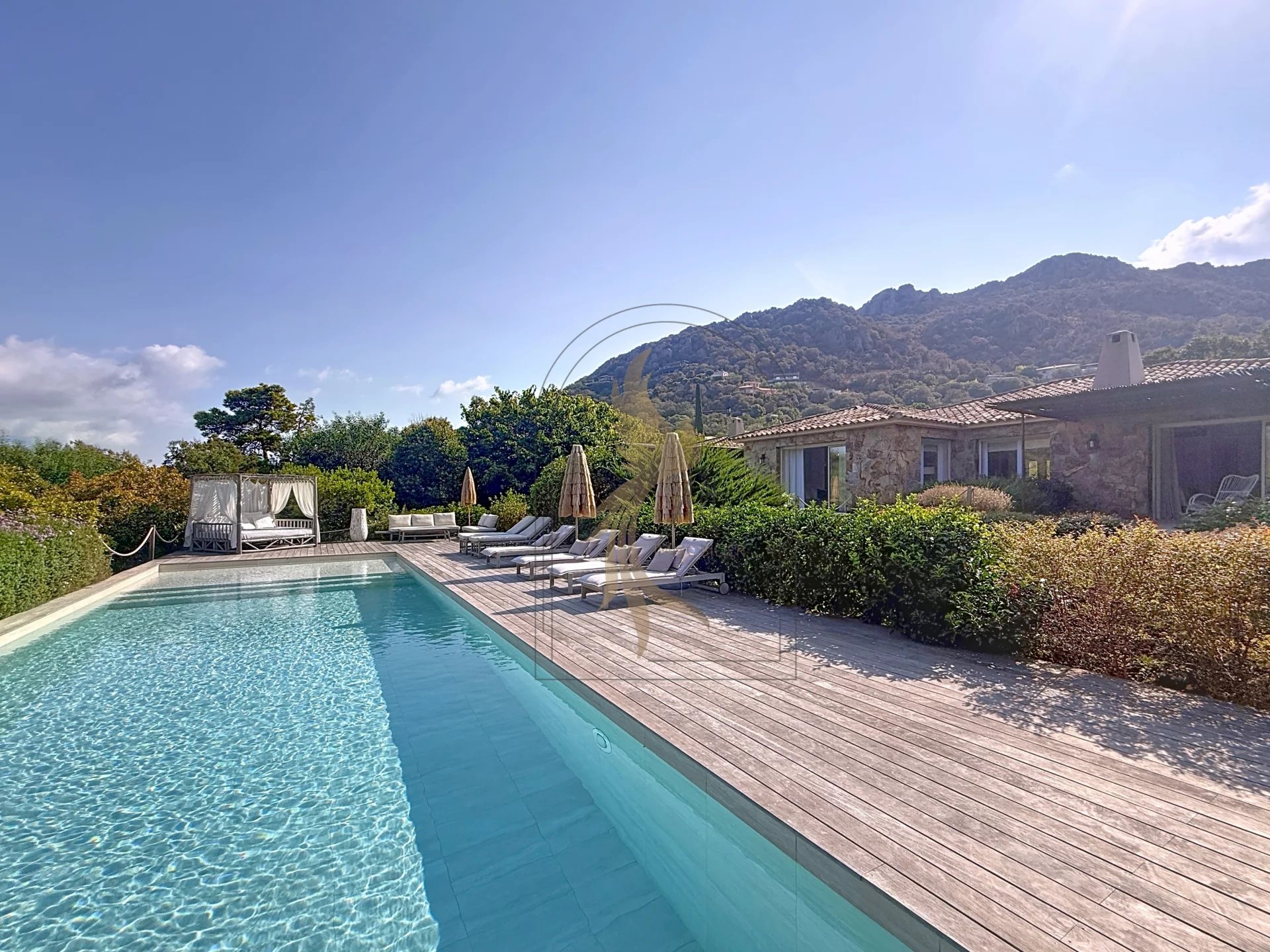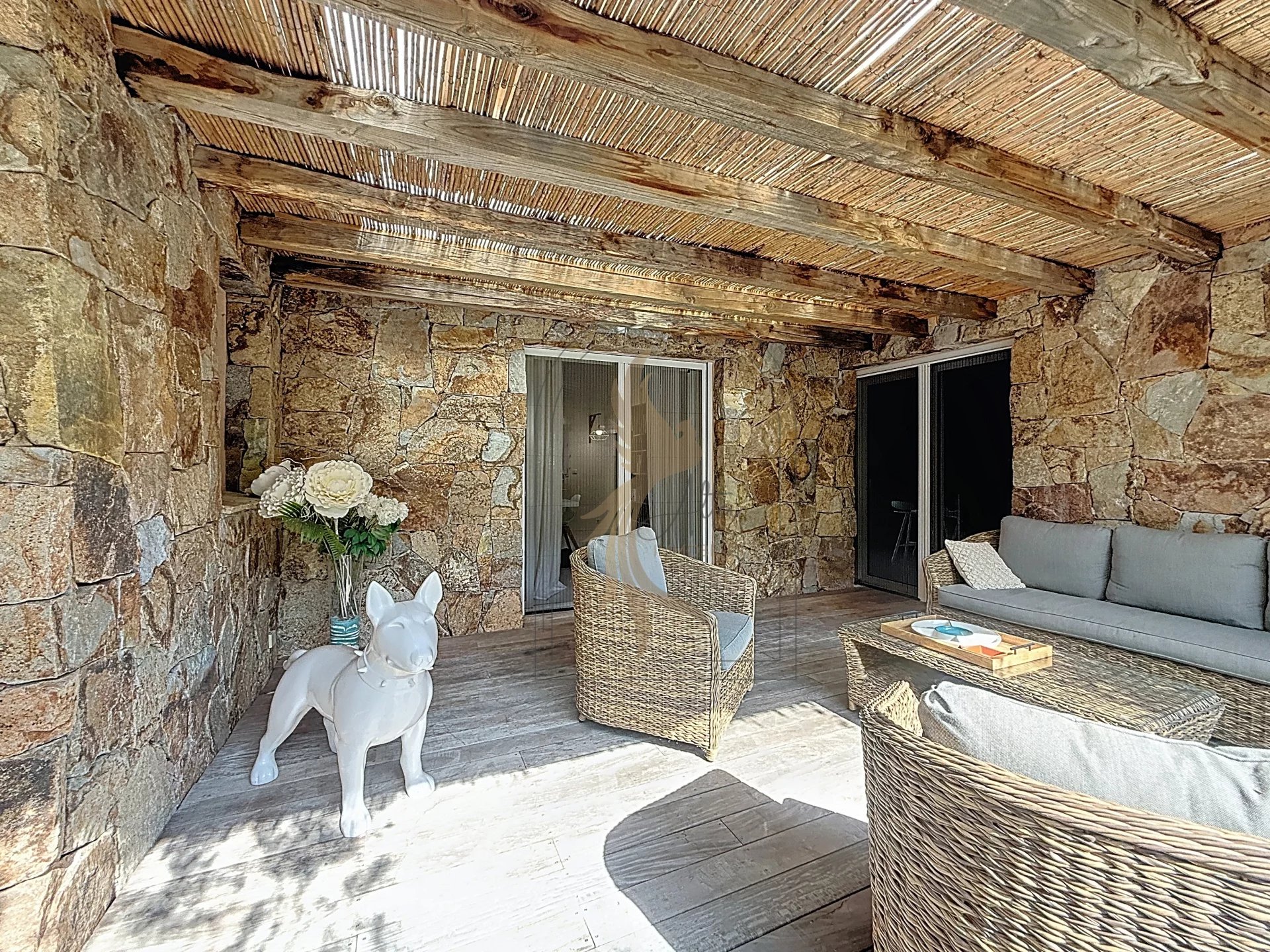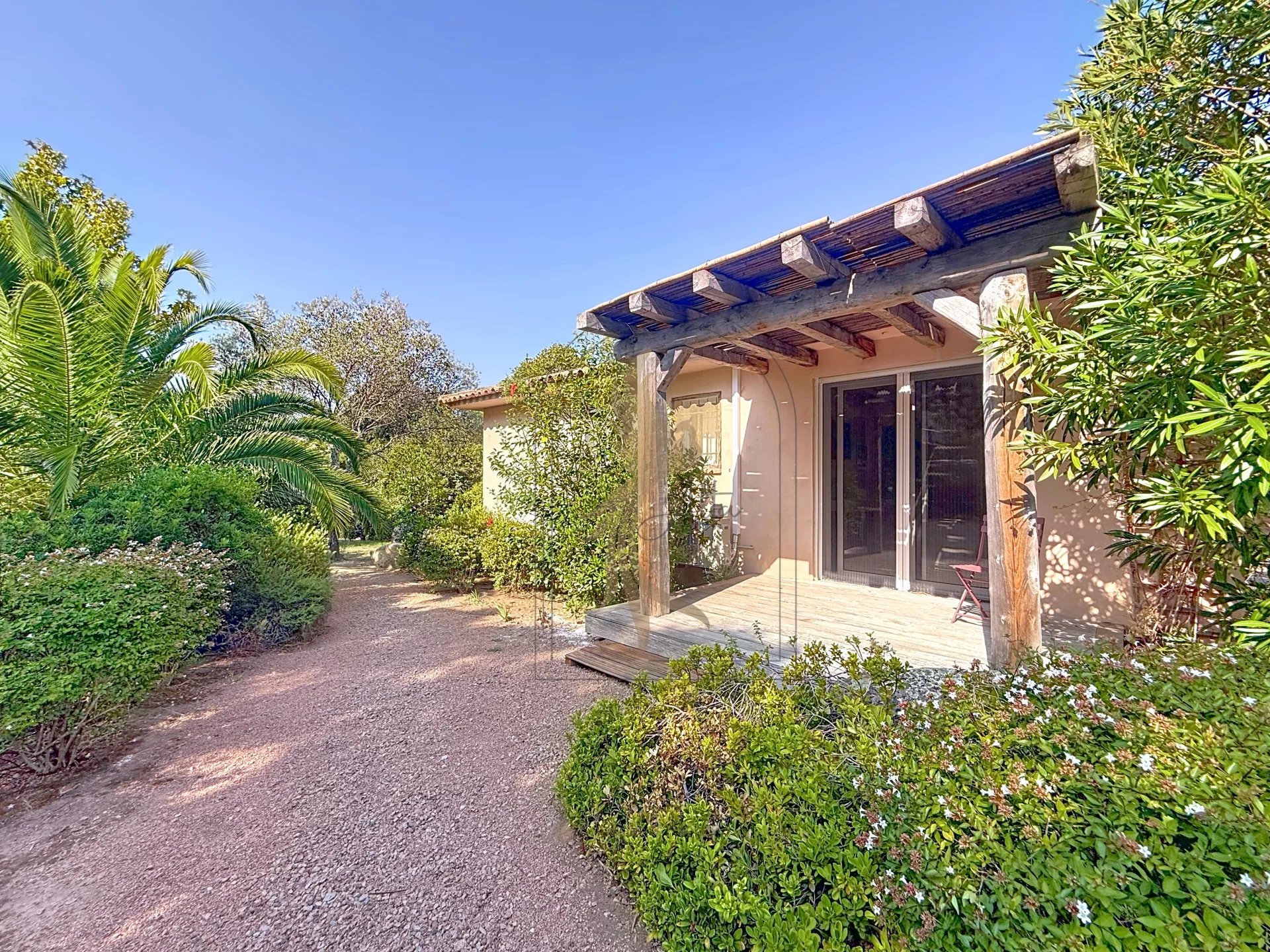 Située dans l’environnement privilégié de Piccovaggia, à proximité des plages de Palombaggia, cette charmante maison de plain-pied offre un cadre de vie paisible et verdoyant. D’une superficie confortable, elle se compose de trois chambres ainsi que d’un studio indépendant, idéal pour recevoir ou pour un usage locatif. La pièce de vie spacieuse séduit immédiatement par son toit cathédrale, sa luminosité exceptionnelle et son atmosphère chaleureuse. Rénovée en 2015, la maison bénéficie de prestations de qualité : habillage en pierre, menuiseries soignées, grands volumes et belle harmonie des matériaux. À l’extérieur, le terrain arboré, parfaitement entretenu et entièrement clos, accueille une grande piscine invitant à la détente, le tout avec une agréable vue sur les montagnes environnantes. Nichée dans un écrin de verdure, cette propriété conjugue charme, tranquillité et confort moderne, faisant d’elle un bien rare sur le secteur.