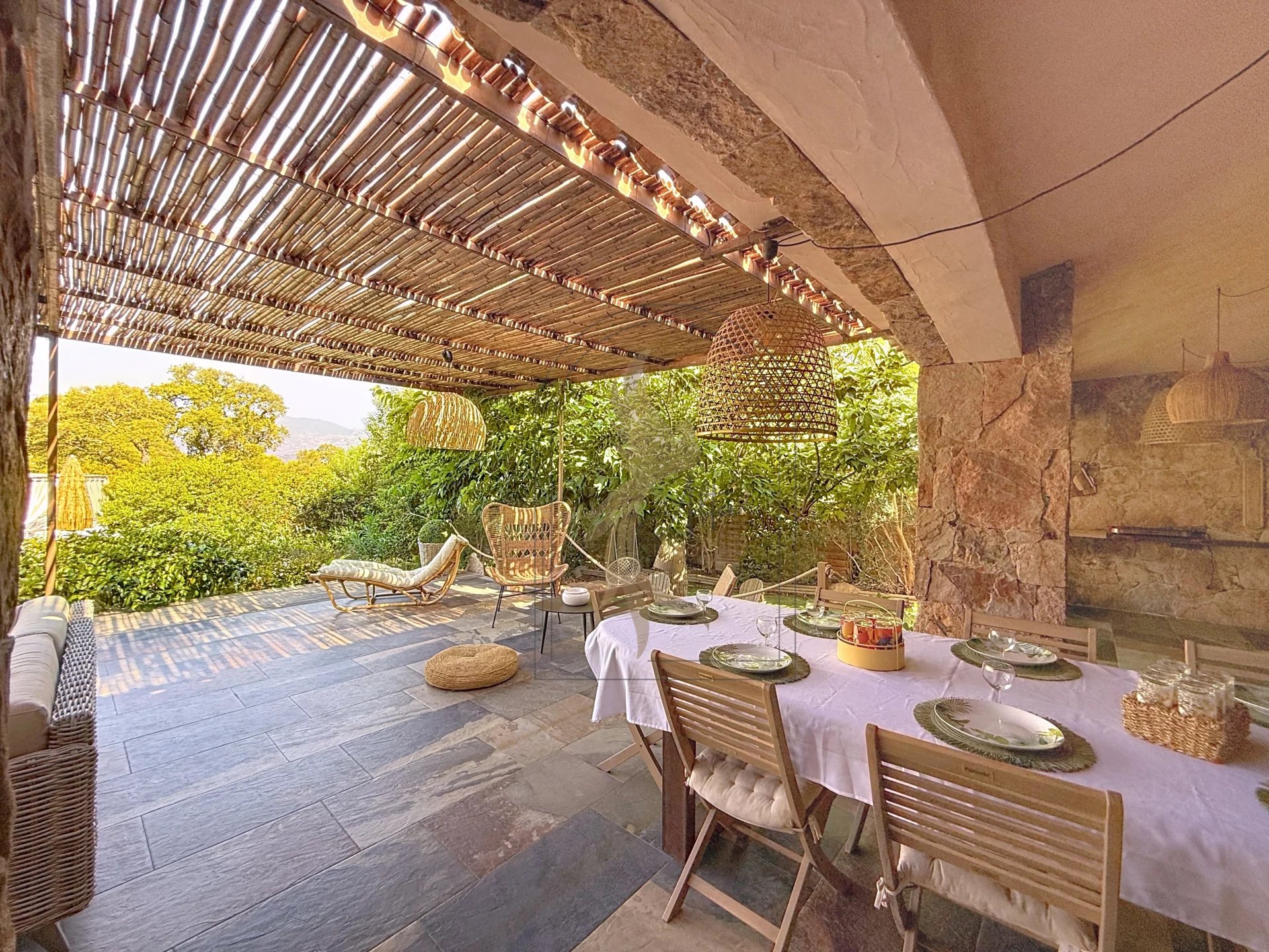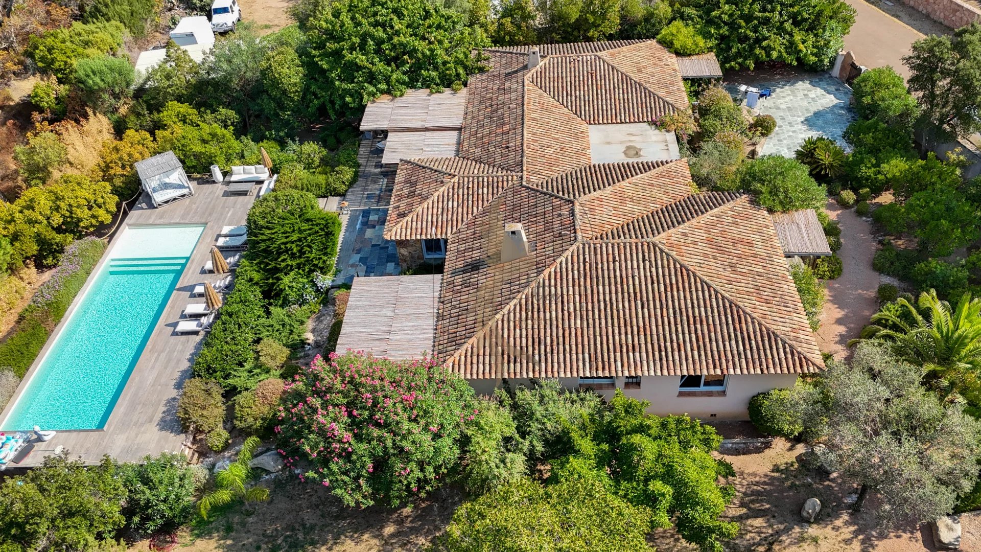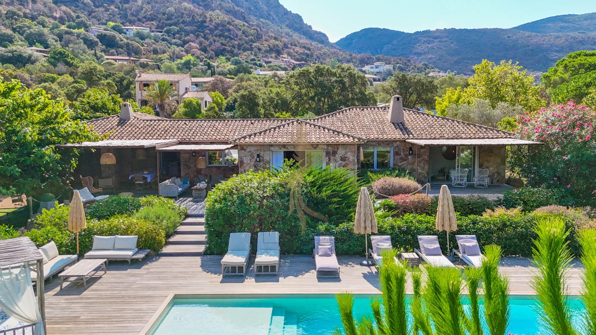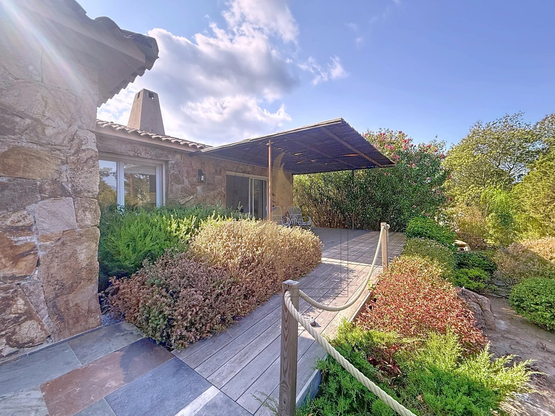 Située dans l’environnement privilégié de Piccovaggia, à proximité des plages de Palombaggia, cette charmante maison de plain-pied offre un cadre de vie paisible et verdoyant. D’une superficie confortable, elle se compose de trois chambres ainsi que d’un studio indépendant, idéal pour recevoir ou pour un usage locatif. La pièce de vie spacieuse séduit immédiatement par son toit cathédrale, sa luminosité exceptionnelle et son atmosphère chaleureuse. Rénovée en 2015, la maison bénéficie de prestations de qualité : habillage en pierre, menuiseries soignées, grands volumes et belle harmonie des matériaux. À l’extérieur, le terrain arboré, parfaitement entretenu et entièrement clos, accueille une grande piscine invitant à la détente, le tout avec une agréable vue sur les montagnes environnantes. Nichée dans un écrin de verdure, cette propriété conjugue charme, tranquillité et confort moderne, faisant d’elle un bien rare sur le secteur.