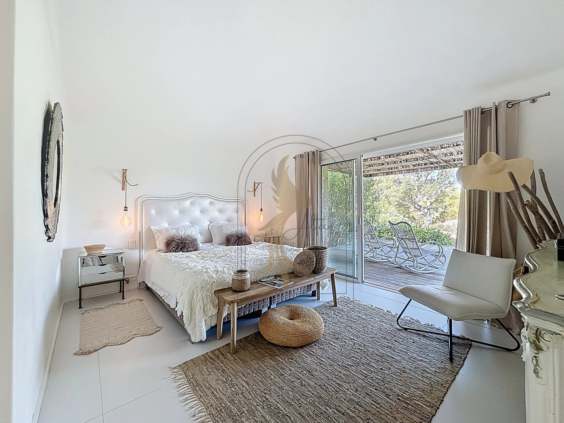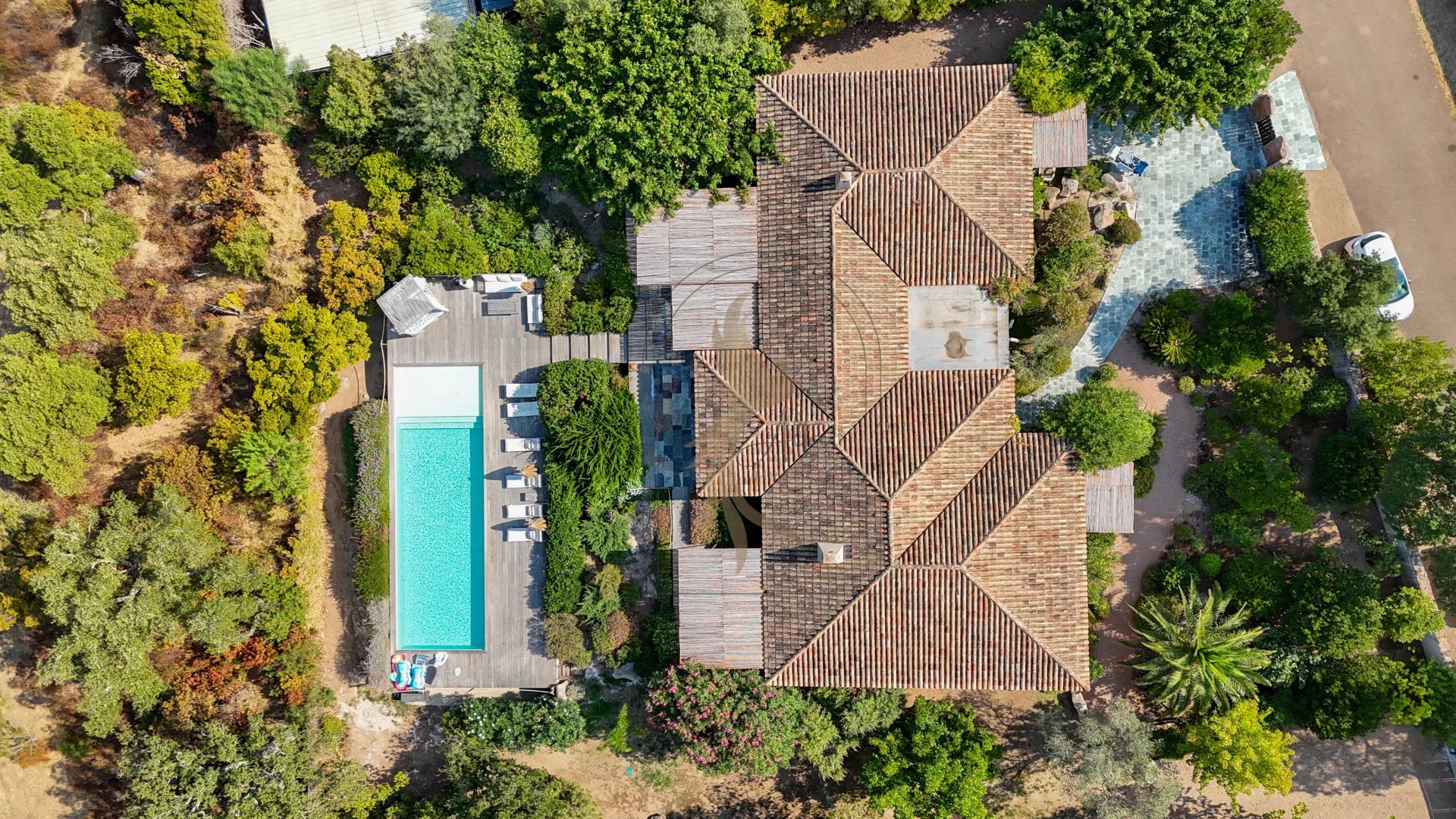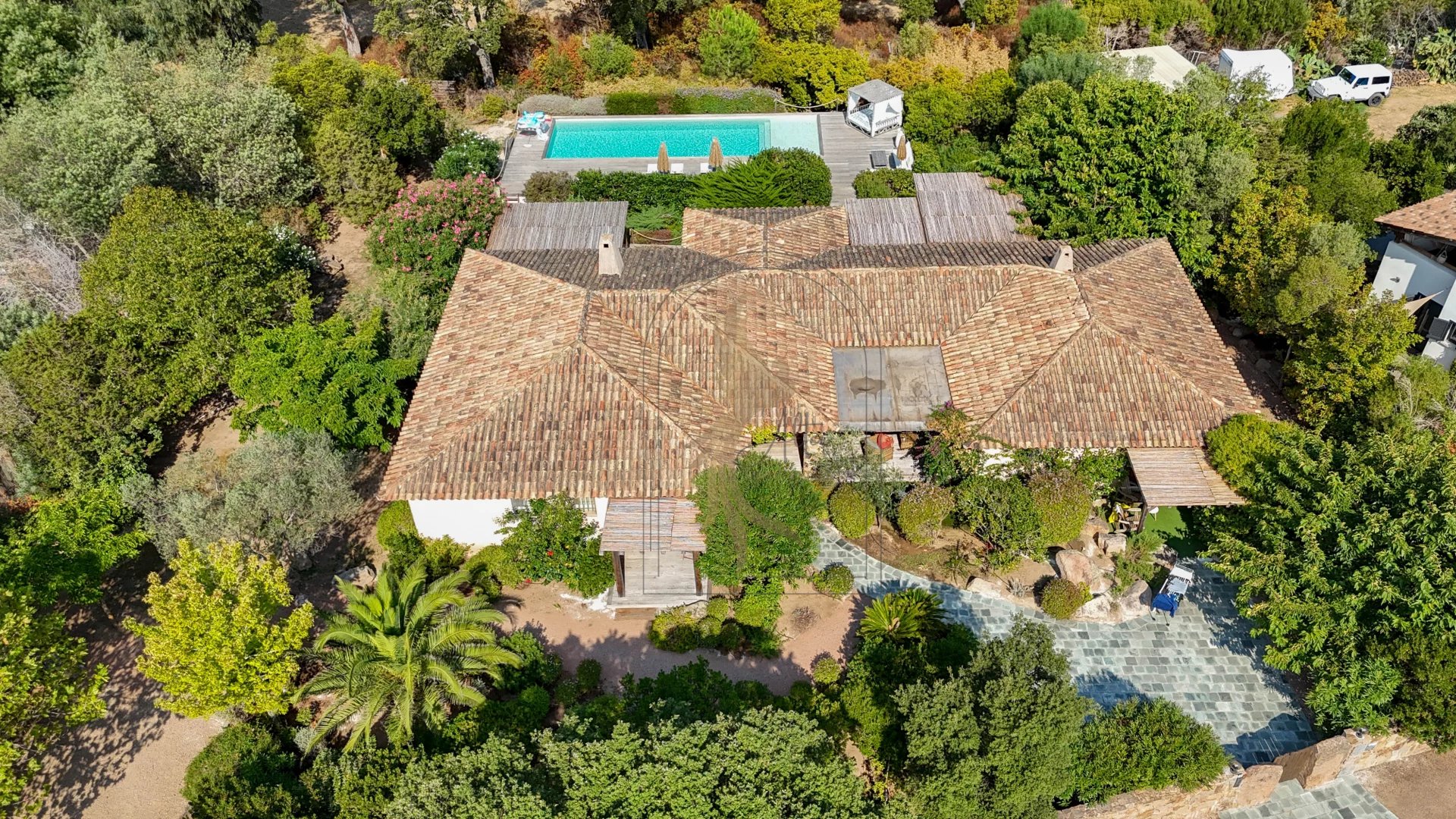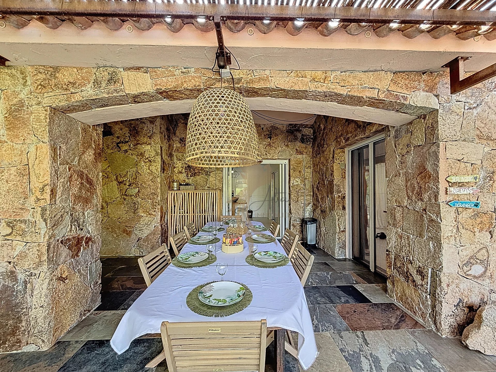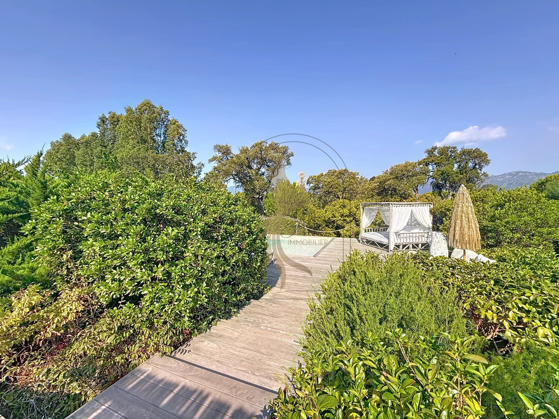Située dans l’environnement privilégié de Piccovaggia, à proximité des plages de Palombaggia, cette charmante maison de plain-pied offre un cadre de vie paisible et verdoyant. D’une superficie confortable, elle se compose de trois chambres ainsi que d’un studio indépendant, idéal pour recevoir ou pour un usage locatif. La pièce de vie spacieuse séduit immédiatement par son toit cathédrale, sa luminosité exceptionnelle et son atmosphère chaleureuse. Rénovée en 2015, la maison bénéficie de prestations de qualité : habillage en pierre, menuiseries soignées, grands volumes et belle harmonie des matériaux. À l’extérieur, le terrain arboré, parfaitement entretenu et entièrement clos, accueille une grande piscine invitant à la détente, le tout avec une agréable vue sur les montagnes environnantes. Nichée dans un écrin de verdure, cette propriété conjugue charme, tranquillité et confort moderne, faisant d’elle un bien rare sur le secteur.