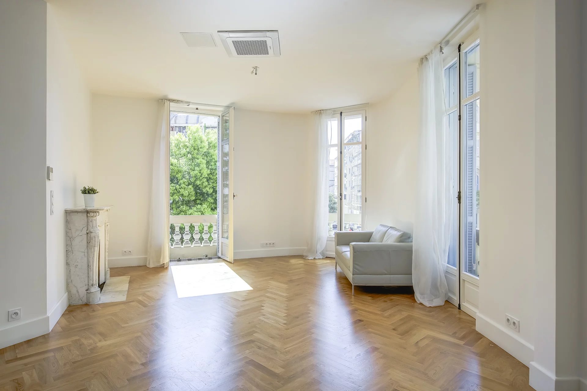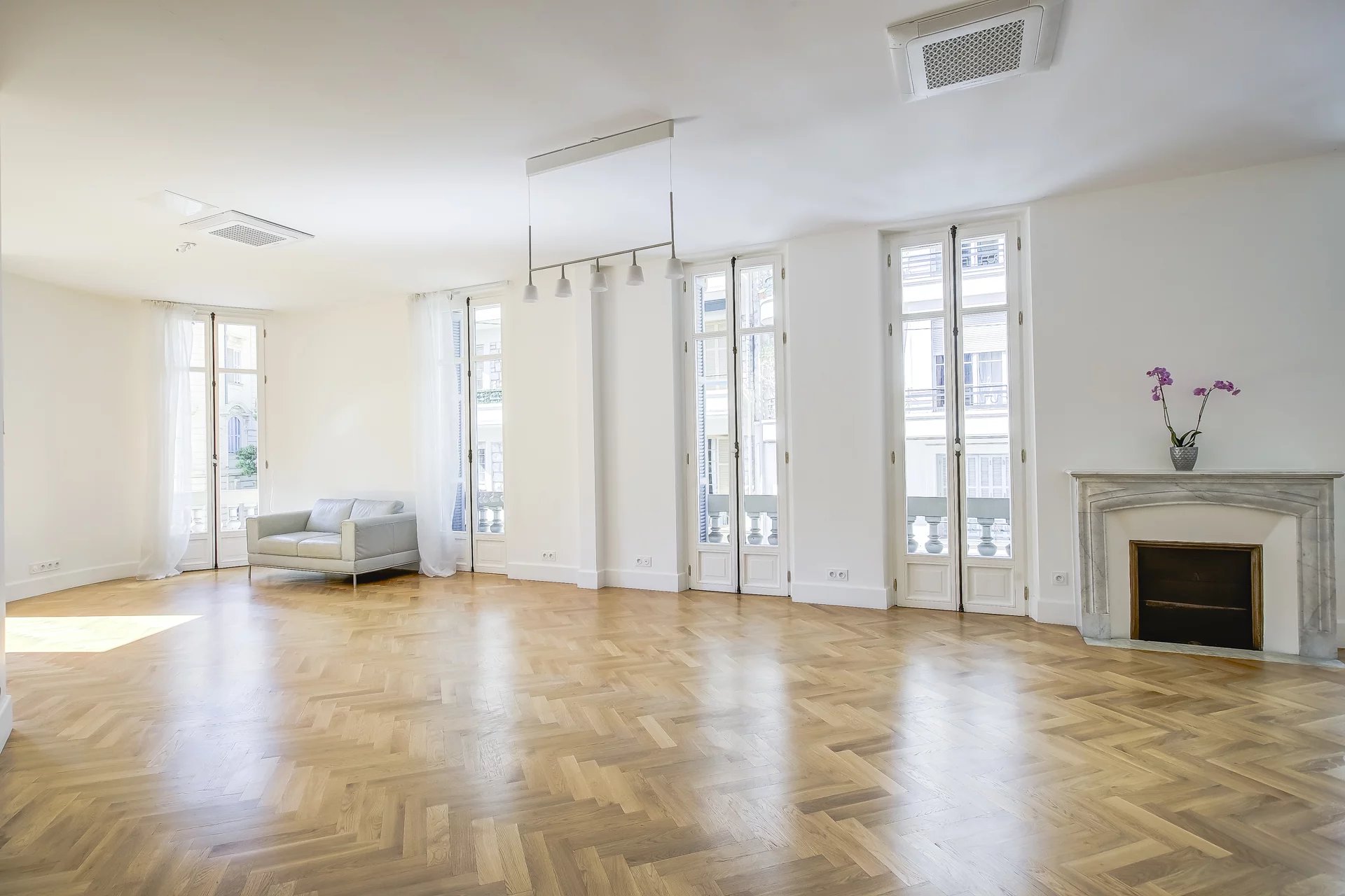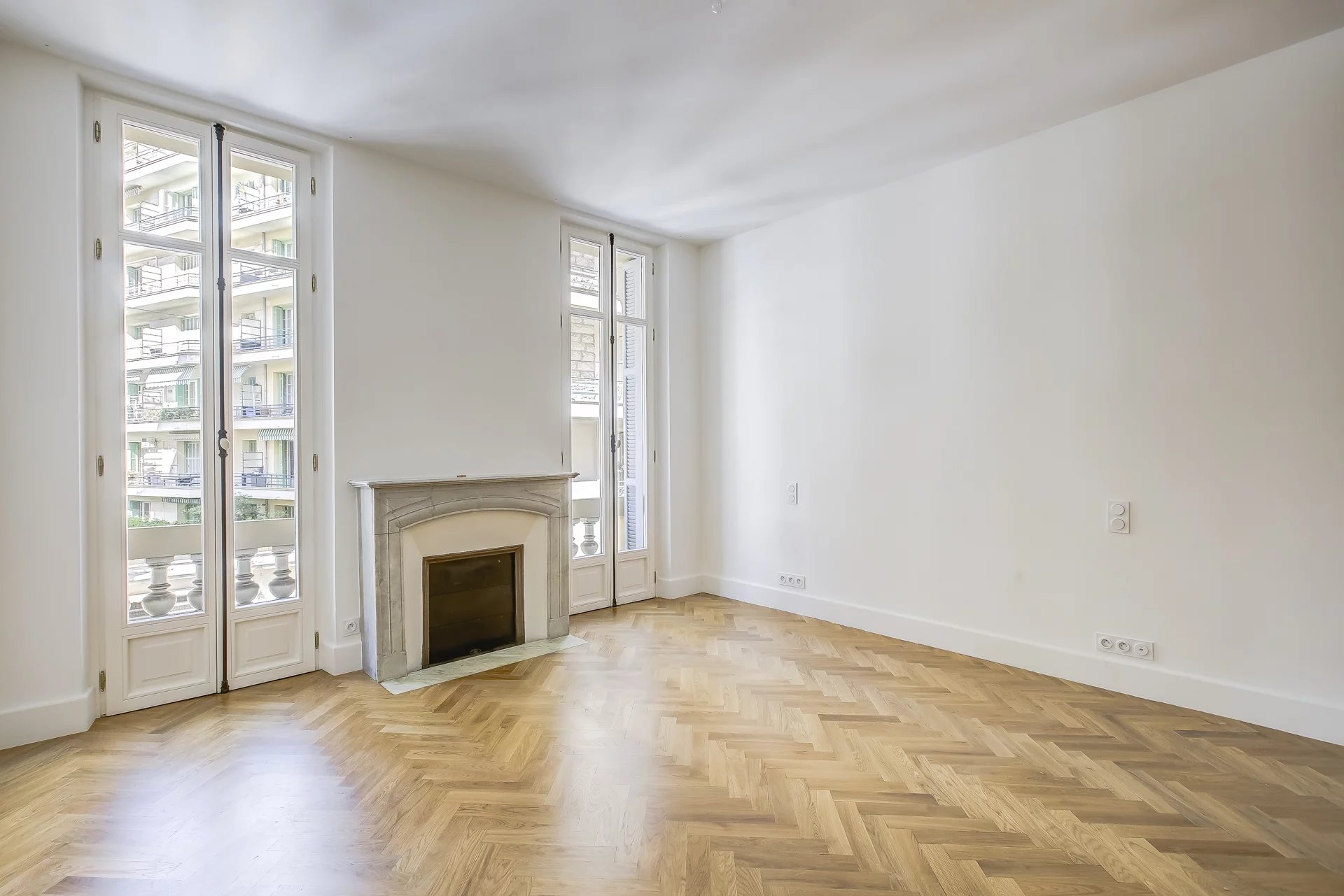 Idéalement situé en plein centre du très recherché Carré d’Or à Nice, cet appartement de luxe de environ 129,27 m²loi careez et environ 133,52 surface habitable bénéficie d’une exposition sud-ouest et offre un cadre de vie rare, alliant prestige, tranquillité et proximité immédiate de toutes les commodités. Il est situé au premier étage avec ascenseur, mais grâce aux hauts plafonds du bâtiment datant de la Belle Époque, on a l'impression d'être au deuxième étage et les nombreuses fenêtres laissent entrer le soleil. C´est bien lumineux et particulièrement calme séduit par la qualité de sa rénovation et son agencement harmonieux. L’appartement se compose de 4 pièces. Avec son très grand salon avec cheminée et sa salle à manger attenante, il a le caractère d'un 5 pièces. La cuisine haut de gamme entièrement équipée invite à cuisiner. Trois chambres élégantes dans deux avec cheminée complètent cet appartement de rêve. Beaucoup d'espace de rangement dans toutes les pièces. Il y a également un WC séparés pour les invités. Climatisation rèversible qui est aussi chauffage. Appartement a été entièrement rénové avec des matériaux de grande qualité. Parquets massifs haut de gamme dans toutes les pièces de vie, finitions soignées et équipements premium dans la cuisine et la salle de bains : chaque détail a été pensé avec goût et exigence. Une cave complète ce bien. La mer et ses plages se trouvent à quelques pas, tout comme de nombreux commerces, restaurants réputés et transports en commun. L’emplacement est tout simplement exceptionnel. Appartement en parfait état – vous pouvez emménager immédiatement. Confort, élégance et qualité de vie garantis