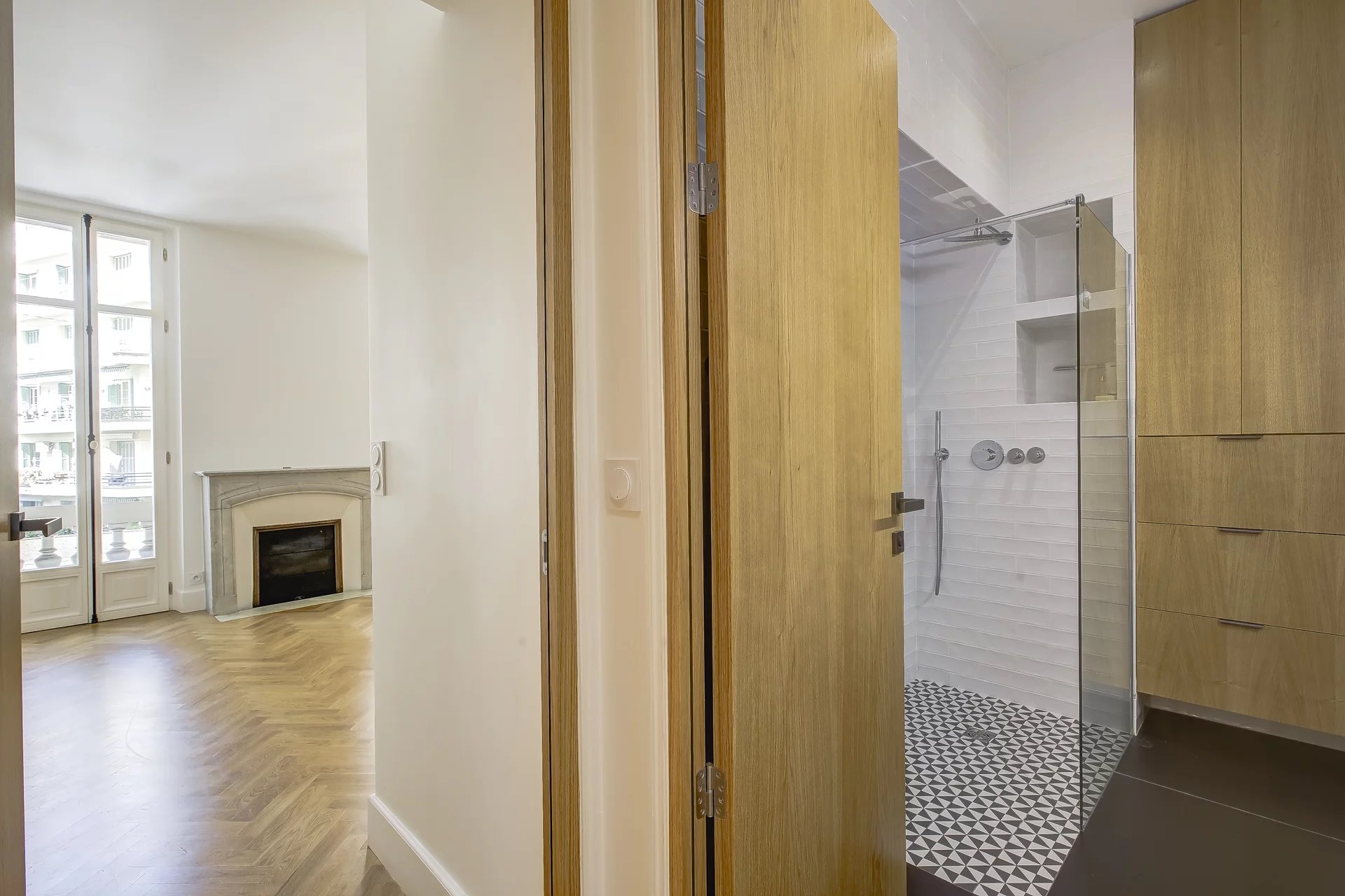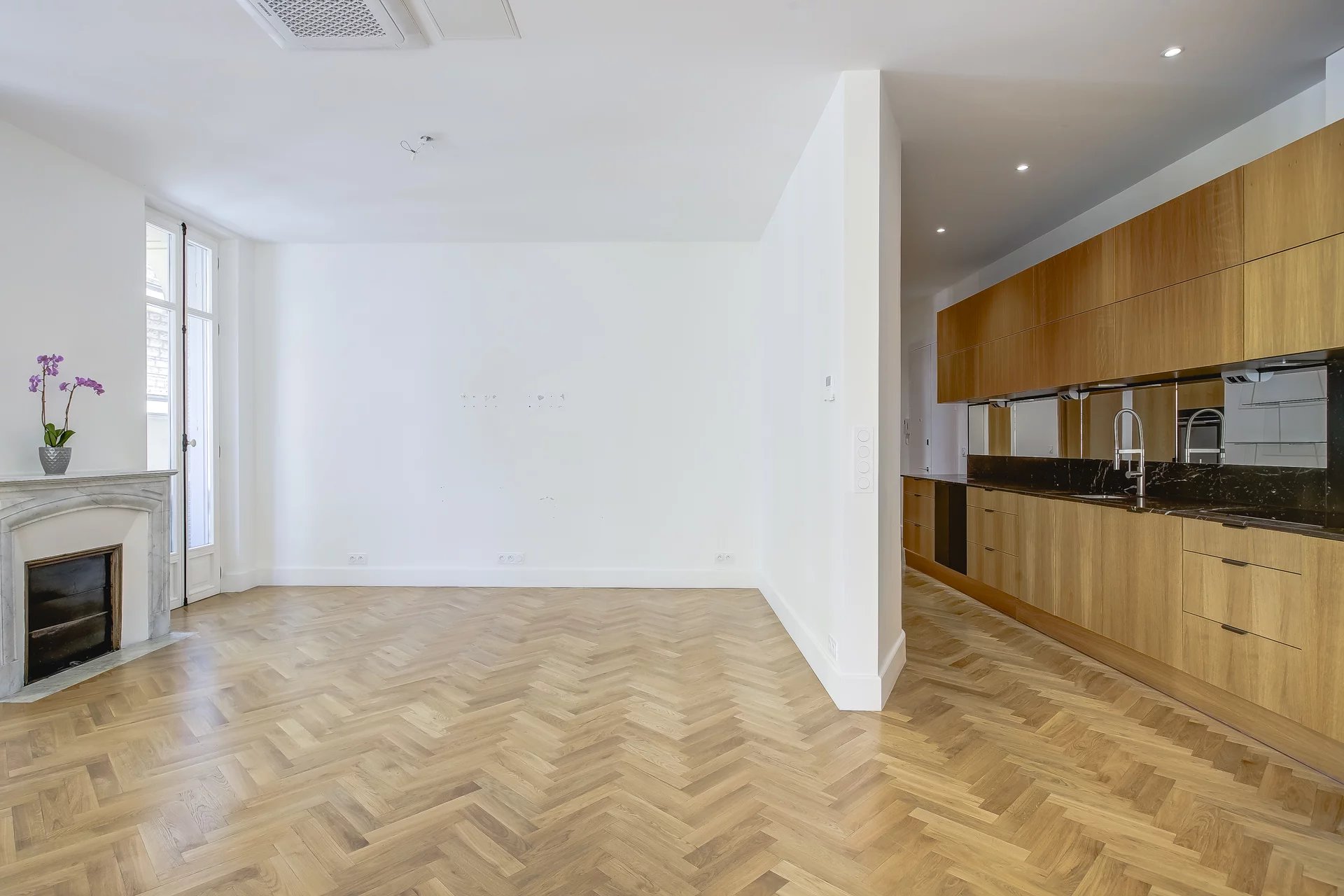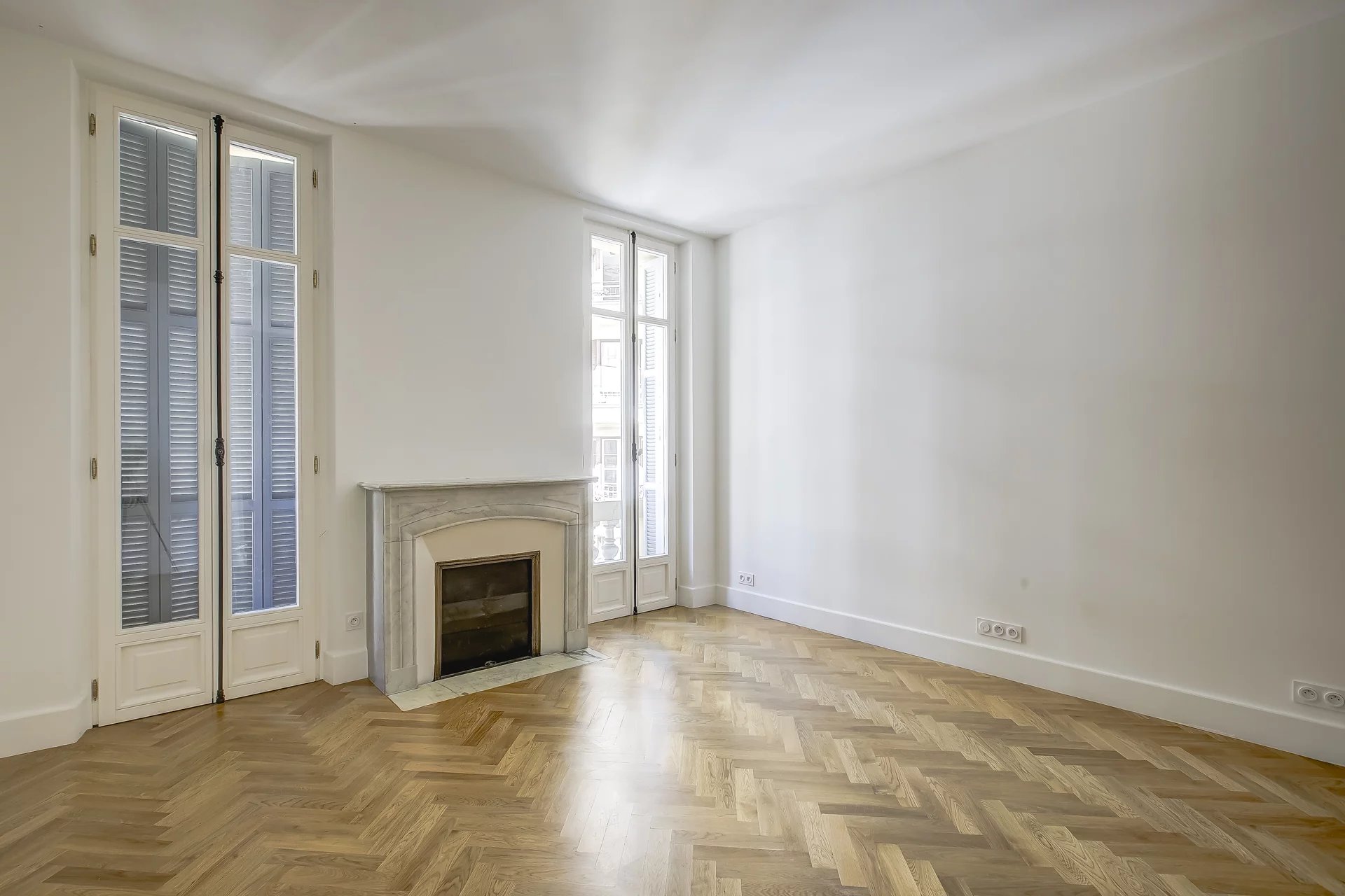 Idéalement situé en plein centre du très recherché Carré d’Or à Nice, cet appartement de luxe de environ 129,27 m²loi careez et environ 133,52 surface habitable bénéficie d’une exposition sud-ouest et offre un cadre de vie rare, alliant prestige, tranquillité et proximité immédiate de toutes les commodités. Il est situé au premier étage avec ascenseur, mais grâce aux hauts plafonds du bâtiment datant de la Belle Époque, on a l'impression d'être au deuxième étage et les nombreuses fenêtres laissent entrer le soleil. C´est bien lumineux et particulièrement calme séduit par la qualité de sa rénovation et son agencement harmonieux. L’appartement se compose de 4 pièces. Avec son très grand salon avec cheminée et sa salle à manger attenante, il a le caractère d'un 5 pièces. La cuisine haut de gamme entièrement équipée invite à cuisiner. Trois chambres élégantes dans deux avec cheminée complètent cet appartement de rêve. Beaucoup d'espace de rangement dans toutes les pièces. Il y a également un WC séparés pour les invités. Climatisation rèversible qui est aussi chauffage. Appartement a été entièrement rénové avec des matériaux de grande qualité. Parquets massifs haut de gamme dans toutes les pièces de vie, finitions soignées et équipements premium dans la cuisine et la salle de bains : chaque détail a été pensé avec goût et exigence. Une cave complète ce bien. La mer et ses plages se trouvent à quelques pas, tout comme de nombreux commerces, restaurants réputés et transports en commun. L’emplacement est tout simplement exceptionnel. Appartement en parfait état – vous pouvez emménager immédiatement. Confort, élégance et qualité de vie garantis
