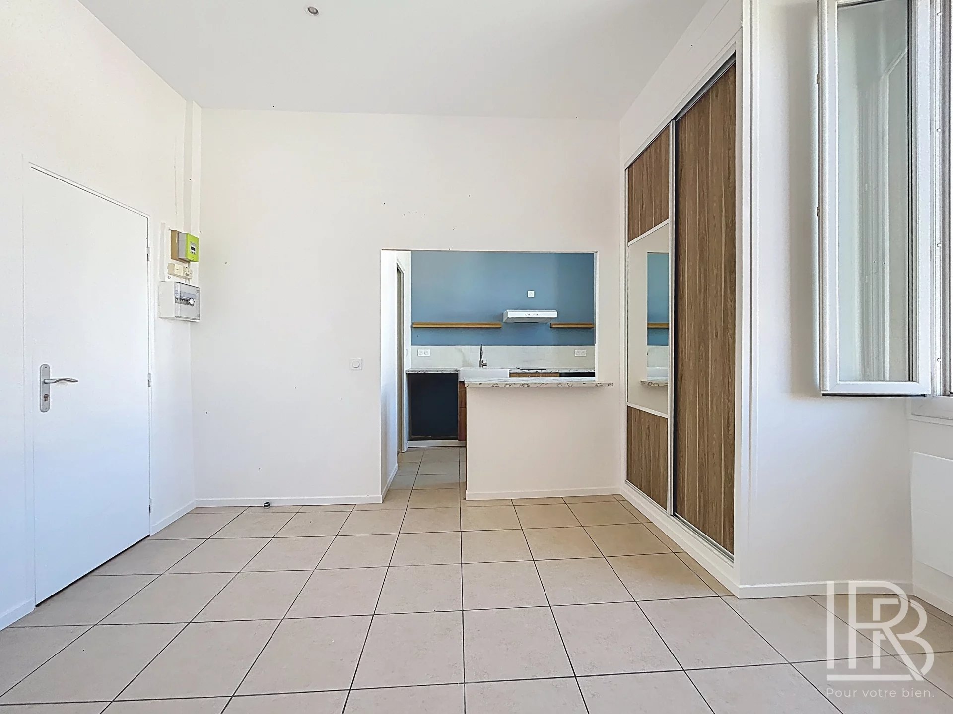 La pièce principale est lumineuse et agréable à vivre. L’espace est simple et fonctionnel, avec un séjour ouvert sur une cuisine partiellement équipée.
