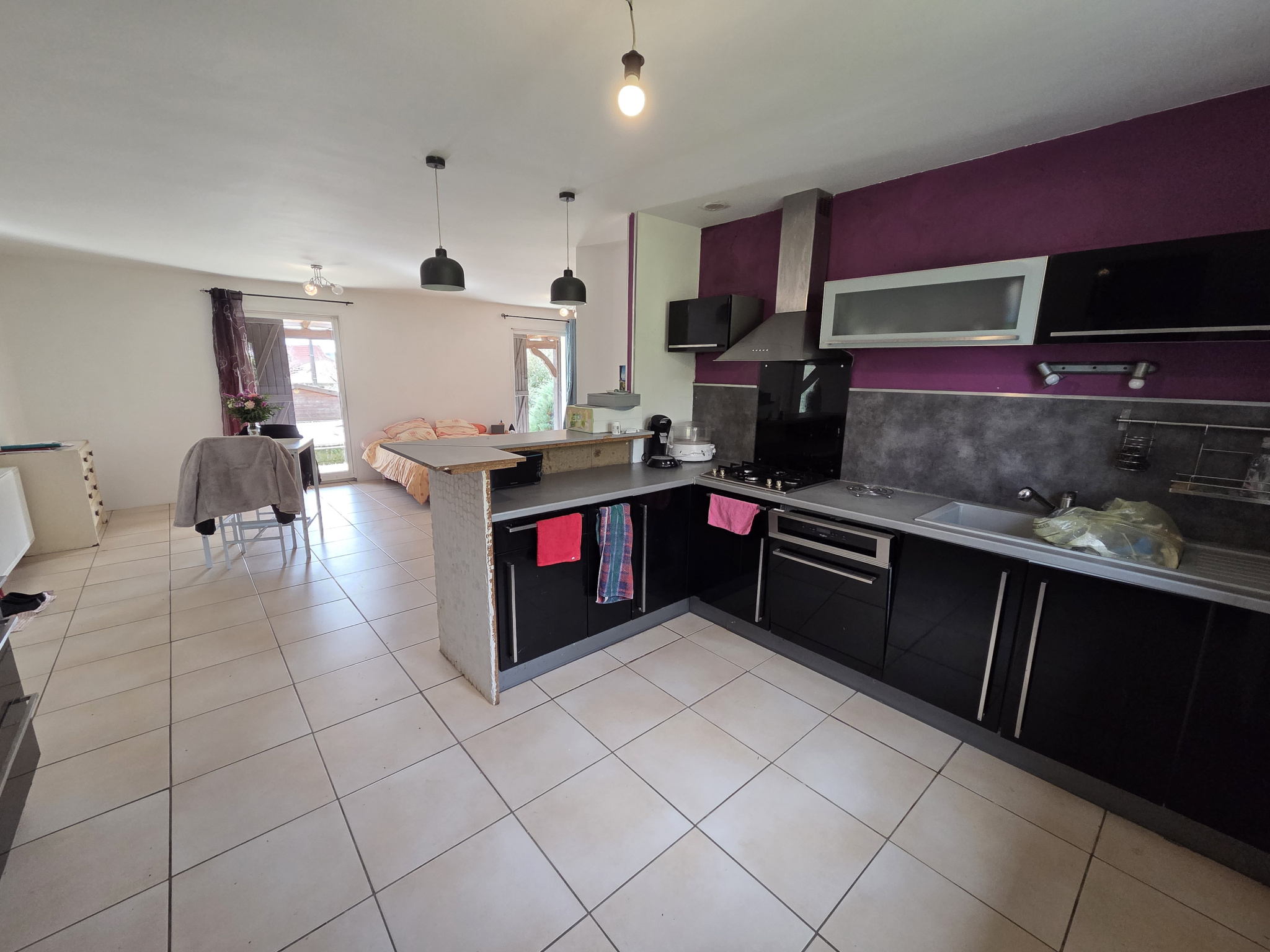 Grand séjour avec coin cuisine ouverte aménagée et équipée, 3 chambres, une salle d'eau, un wc indépendant et un garage. Véranda.
