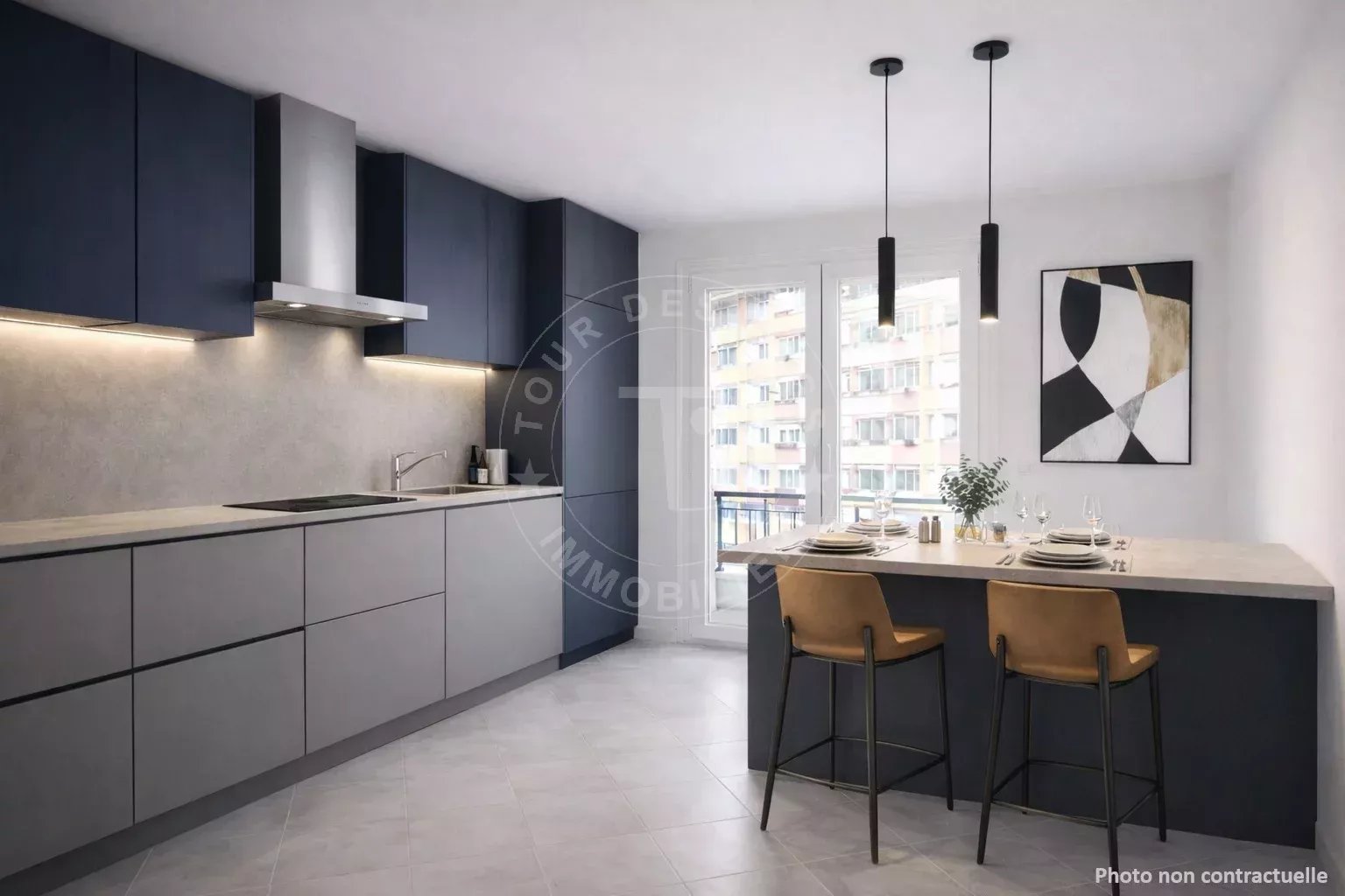 Le séjour s’ouvre sur un balcon exposé sud-ouest, tandis que la cuisine indépendante dispose également d’un accès à un second balcon. Trois chambres, une salle de bains et des WC séparés complètent l’agencement du bien.