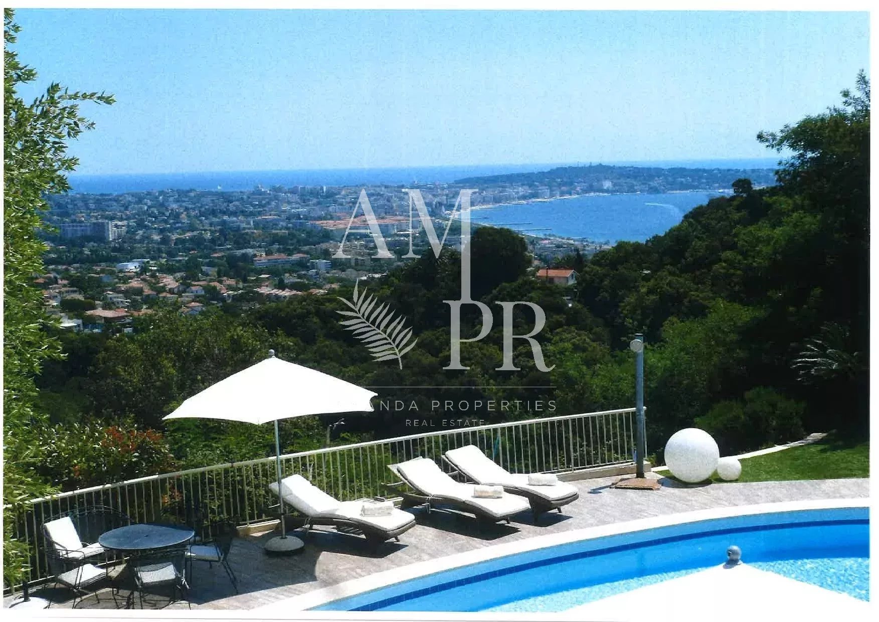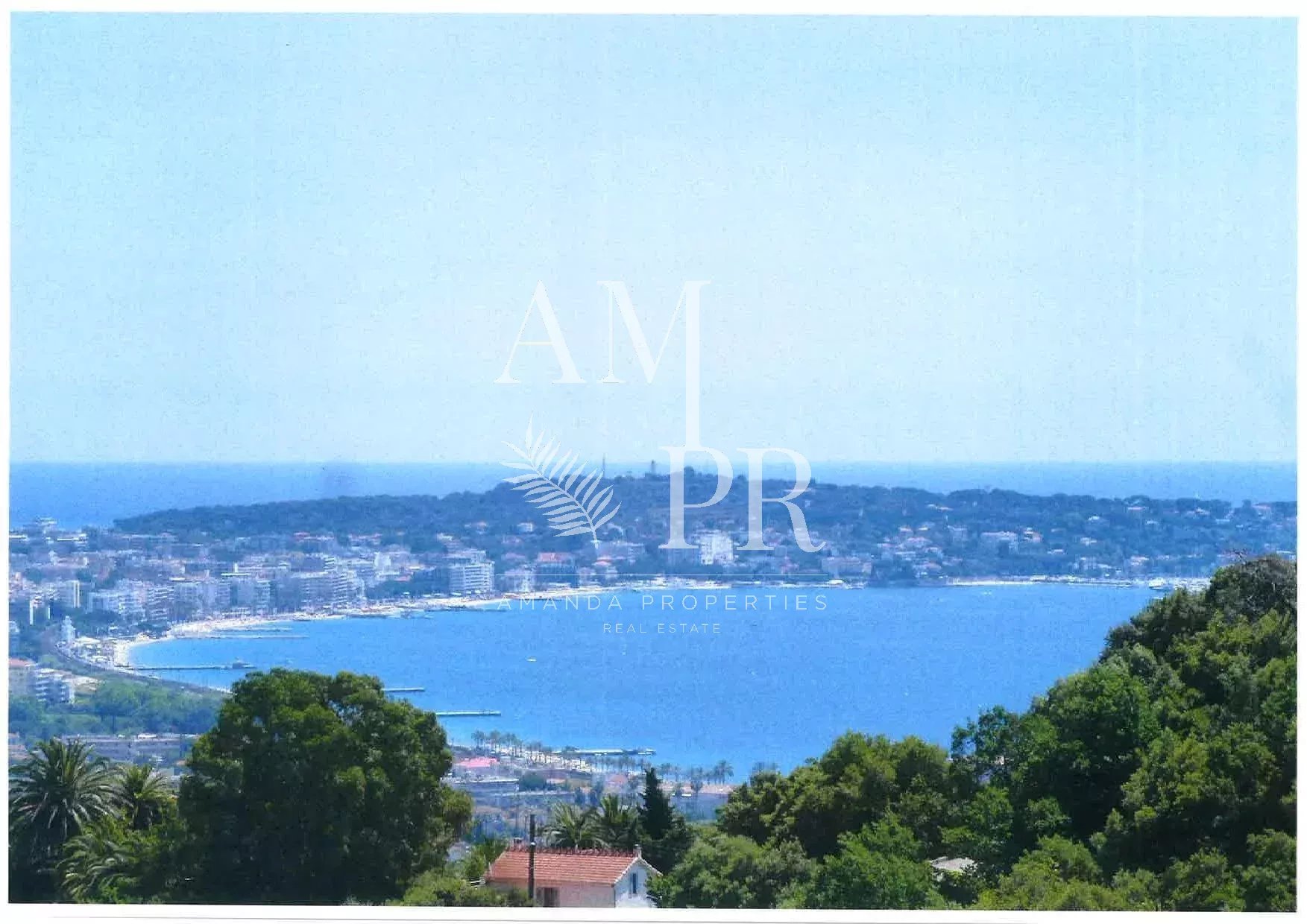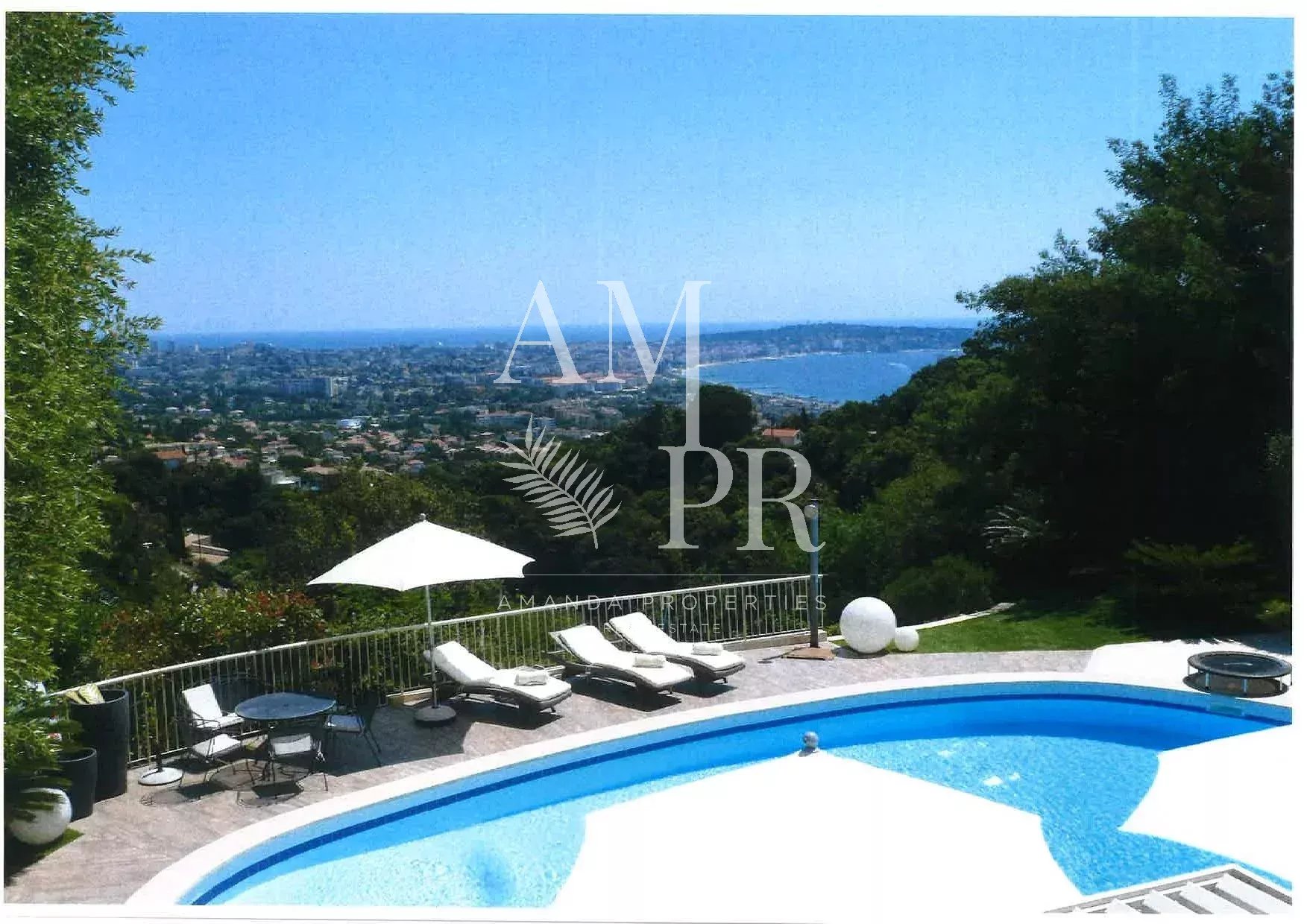 Sur les hauteurs de Cannes, dans le domaine du Super Cannes, superbe villa contemporaine avec vue mer panoramique Surface habitable de 265,47m² Séjour avec cheminée 4 chambres avec salles de bains en suite Bureau Jardin paysagé d'environ 3500m² avec piscine Garage pour 4 voitures