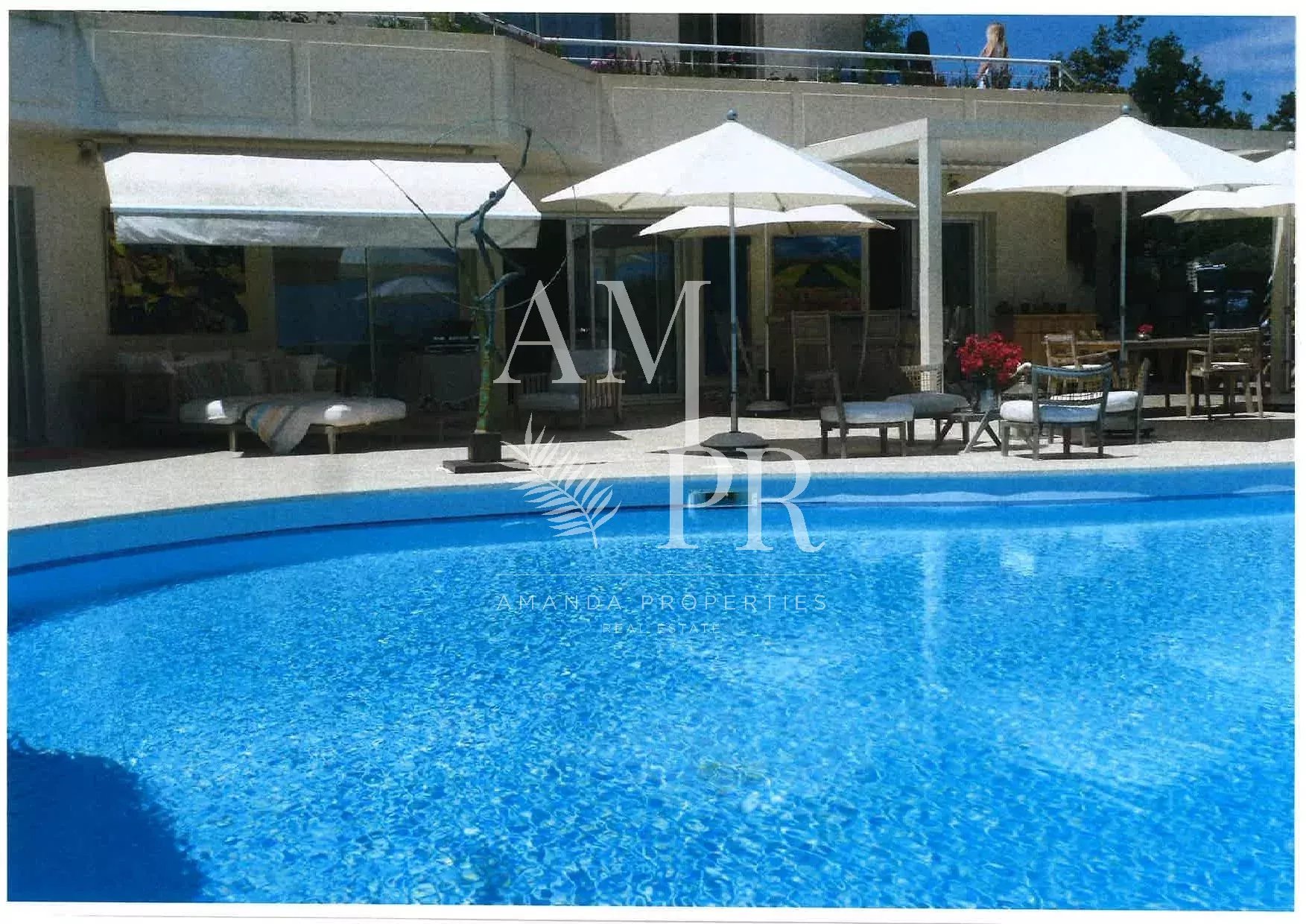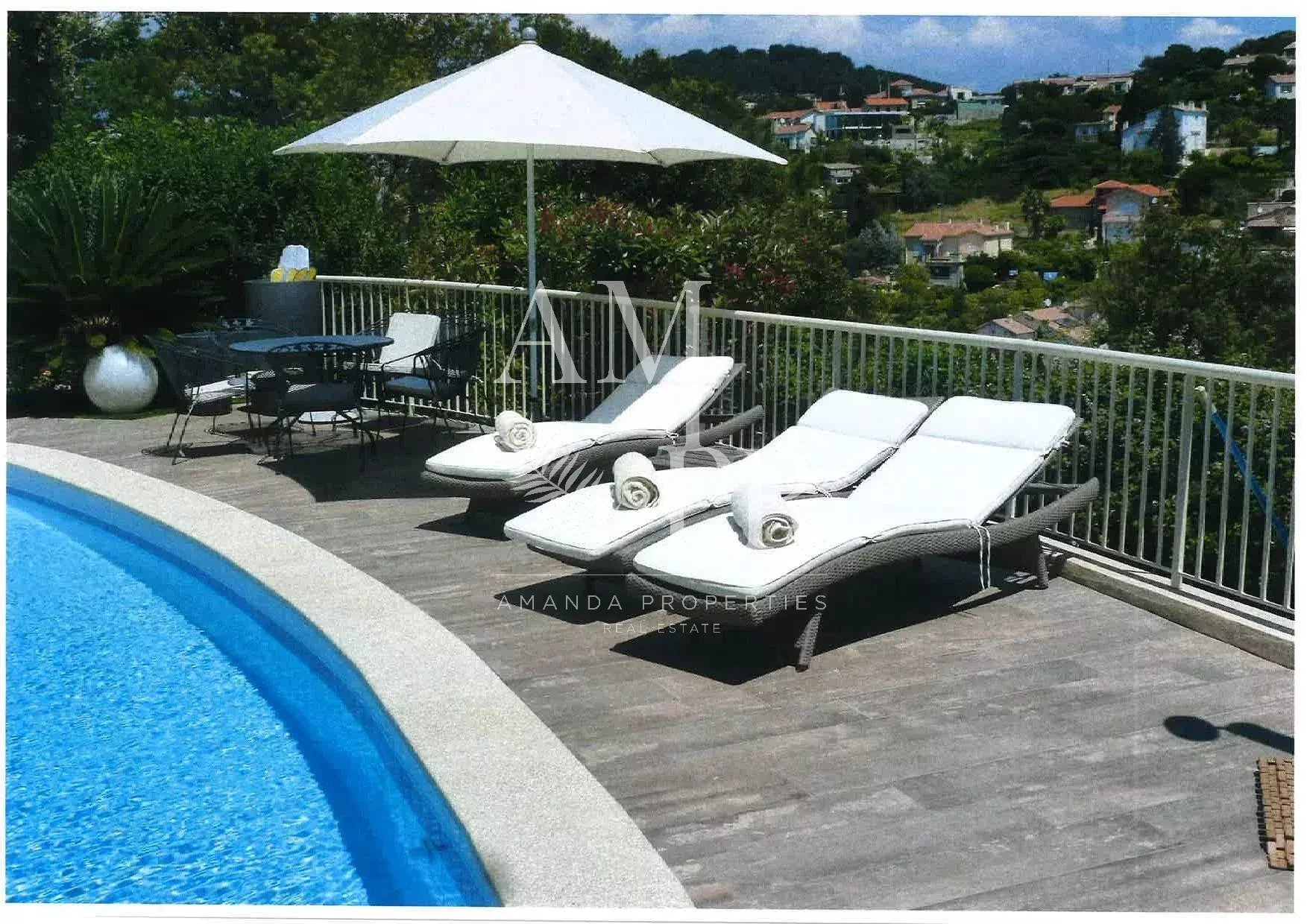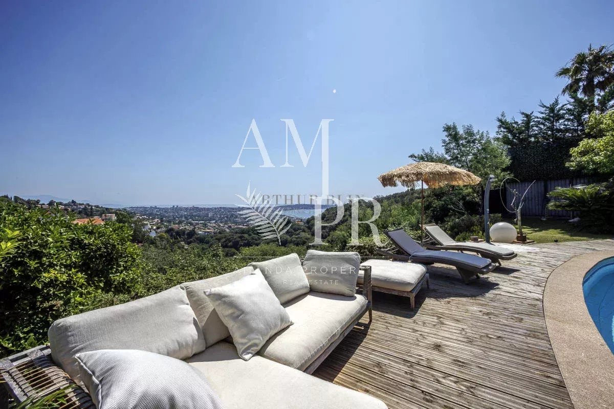 Sur les hauteurs de Cannes, dans le domaine du Super Cannes, superbe villa contemporaine avec vue mer panoramique Surface habitable de 265,47m² Séjour avec cheminée 4 chambres avec salles de bains en suite Bureau Jardin paysagé d'environ 3500m² avec piscine Garage pour 4 voitures