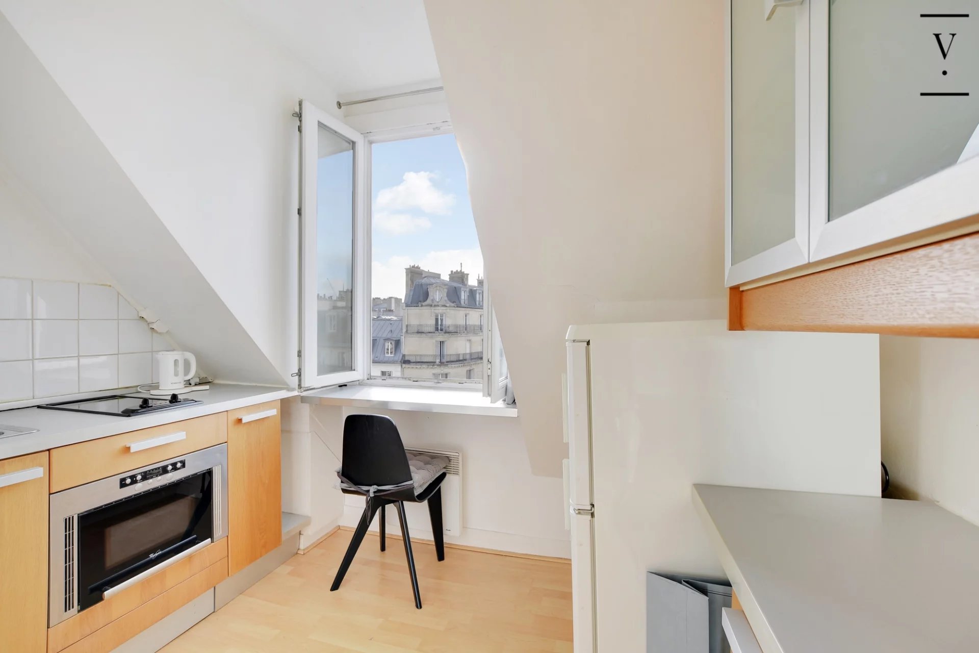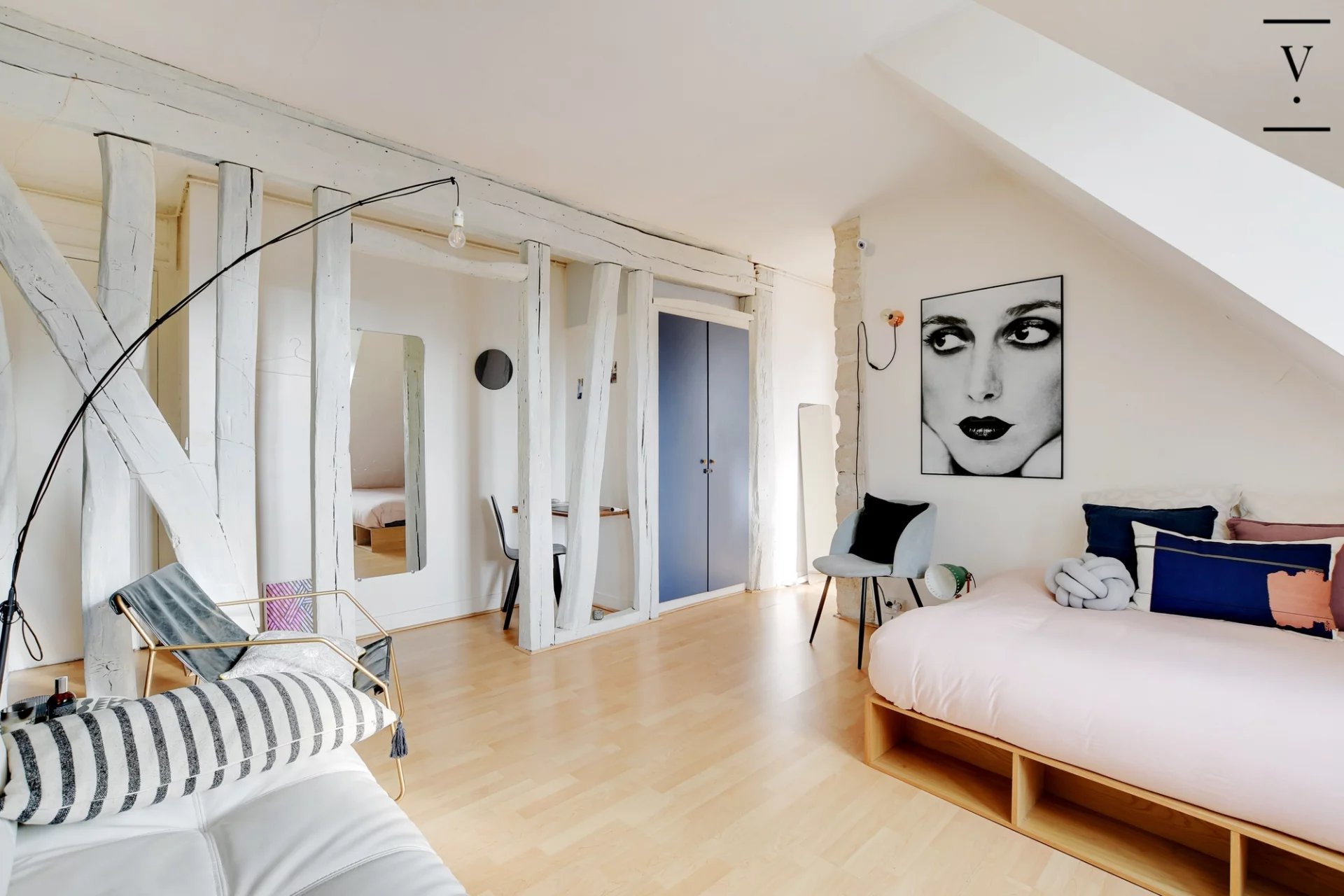 Métro Saint Paul, rue de Rivoli, au 6ème et dernier étage par l'escalier principal d'un bel immeuble parisien, l'agence Villlaret Marais vous propose en exclusivité un charmant studio vendu entièrement meublé avec jolie vue dégagée plein sud sur les toits de Paris. Il est composé d'une entrée avec coin bureau, d'un séjour avec jolis colombages, d'une cuisine séparée équipée et d'une salle de bains avec wc. Double vitrage.