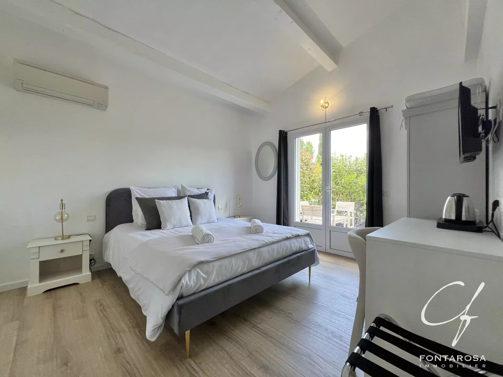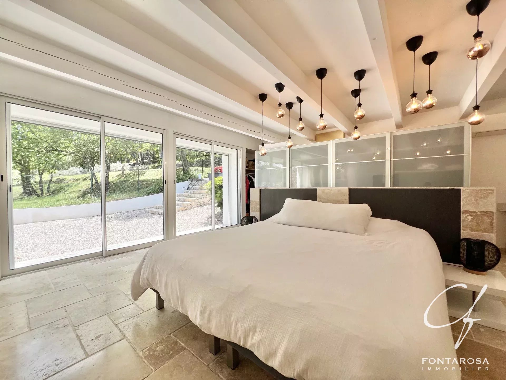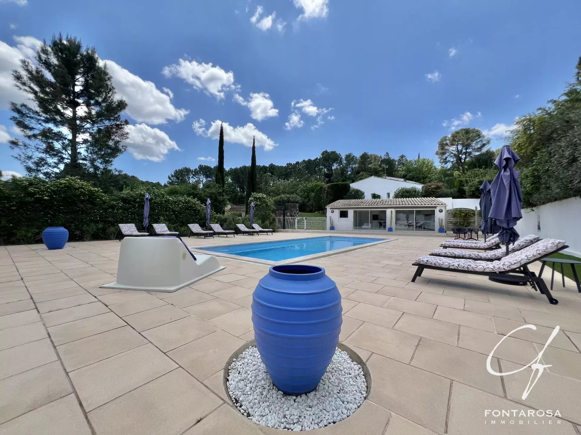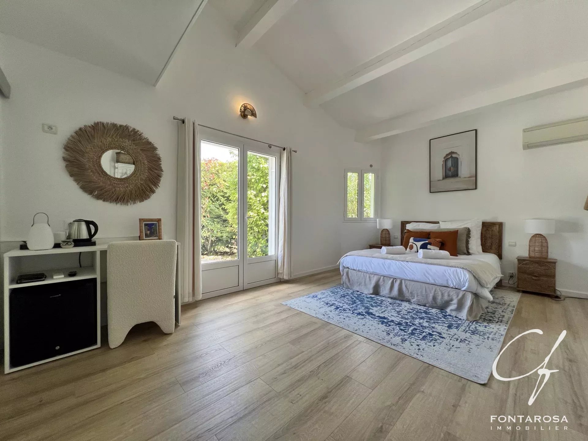 Immersa in un parco di 3.000 m², comprende una casa principale su un unico livello con un ampio soggiorno, una suite padronale, un ufficio, una cucina attrezzata e spazi separati, oltre a cinque camere da letto, ciascuna con bagno e terrazza.