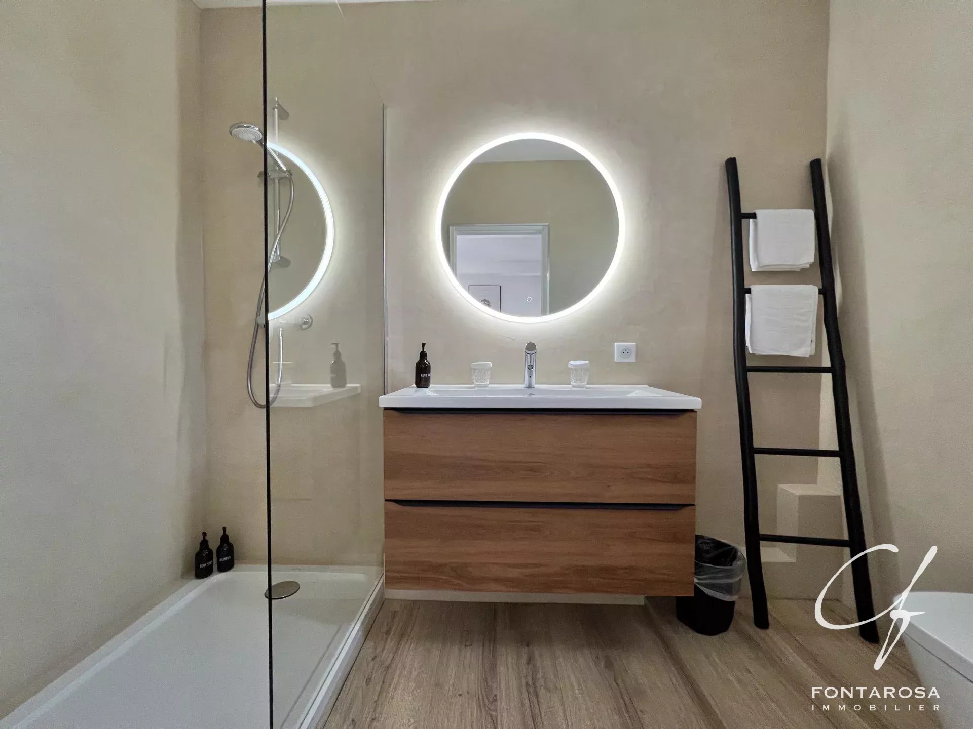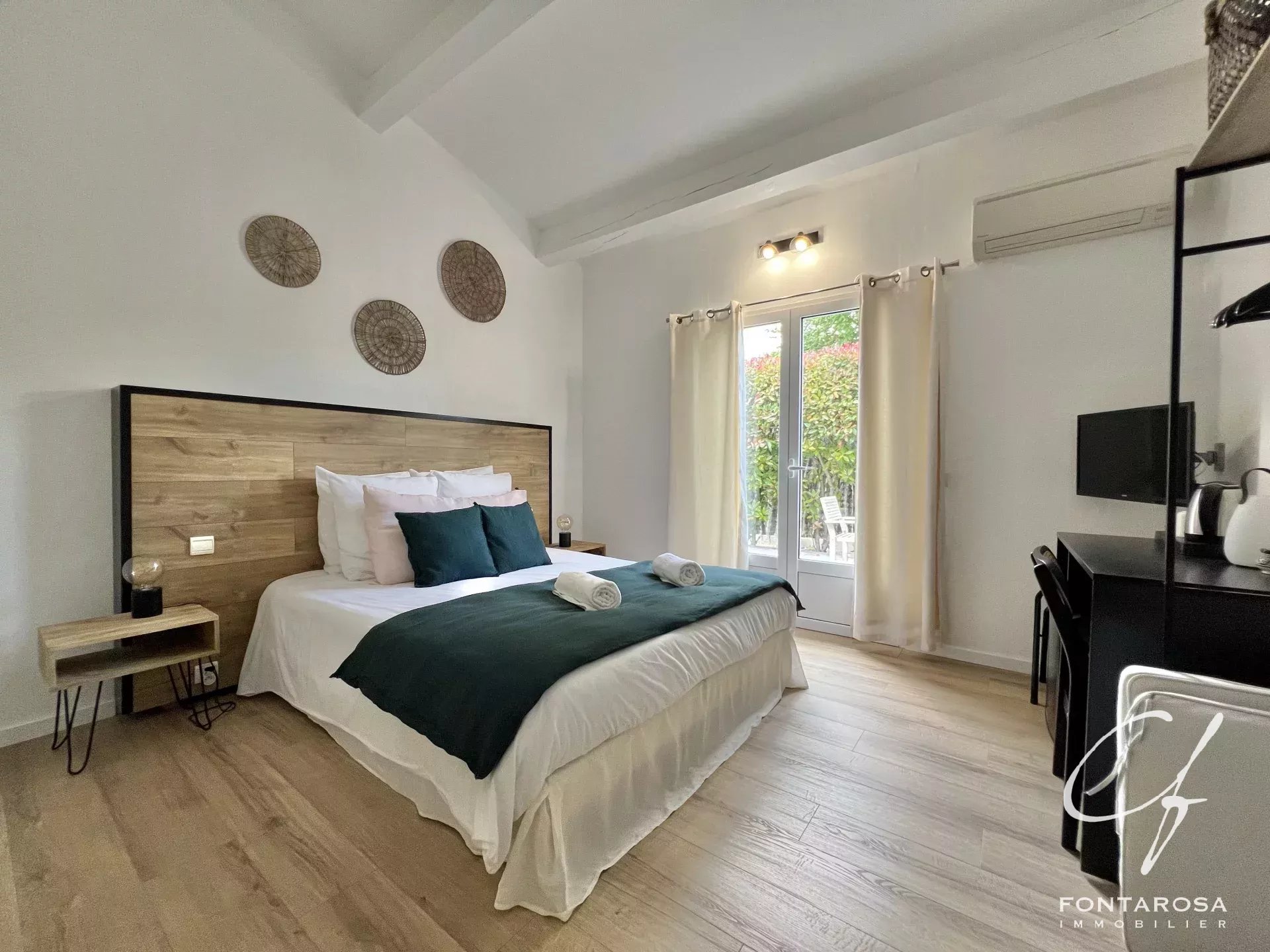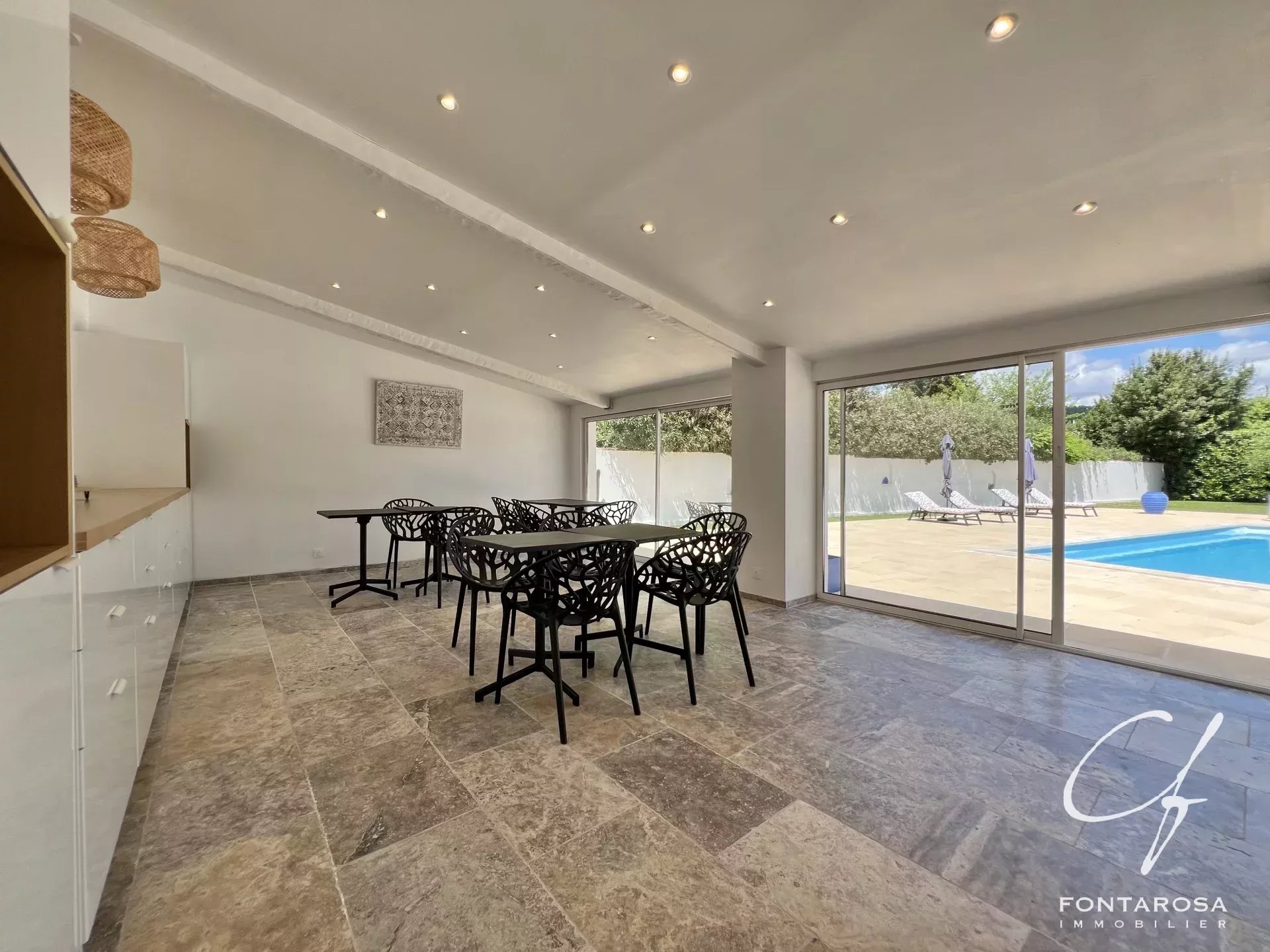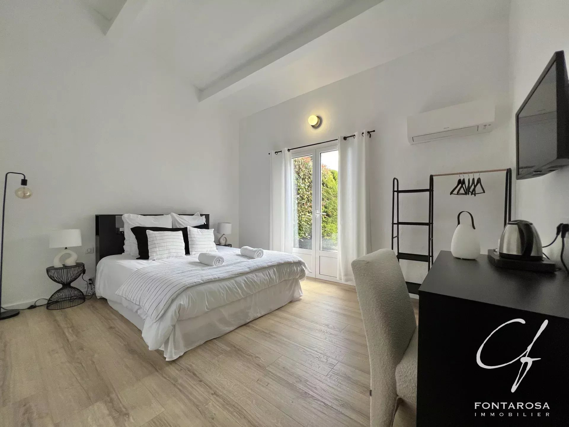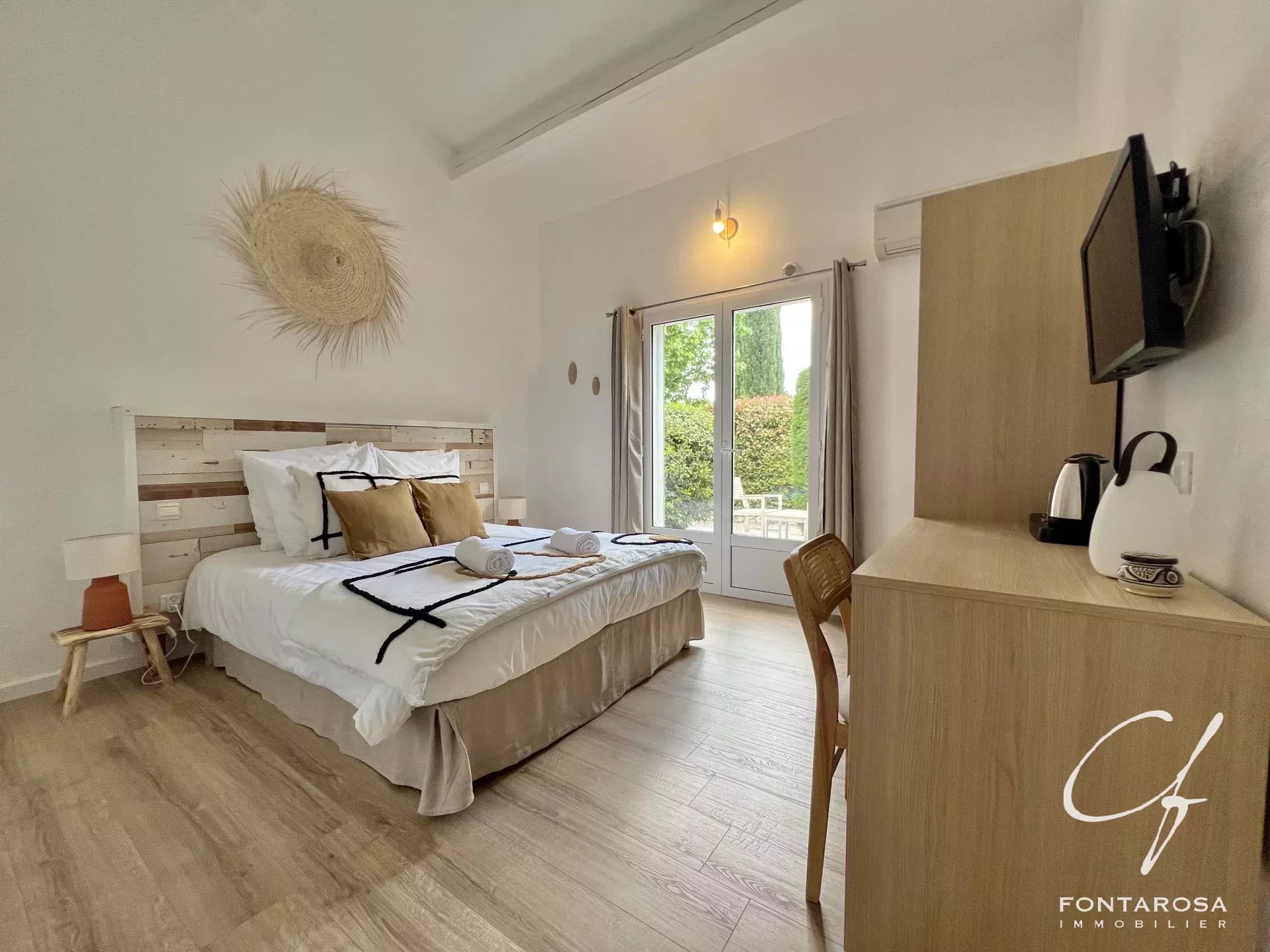 Immersa in un parco di 3.000 m², comprende una casa principale su un unico livello con un ampio soggiorno, una suite padronale, un ufficio, una cucina attrezzata e spazi separati, oltre a cinque camere da letto, ciascuna con bagno e terrazza.
