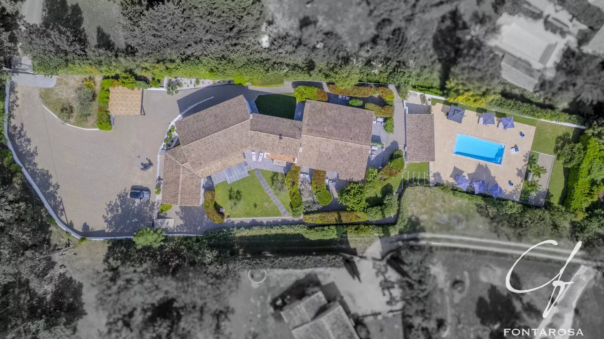 Due appartamenti indipendenti al primo piano, piscina, pool house, terrazze, campo da bocce, ampio parcheggio e posto auto coperto: tutto ciò che serve per un'attività familiare, alberghiera o professionale.
