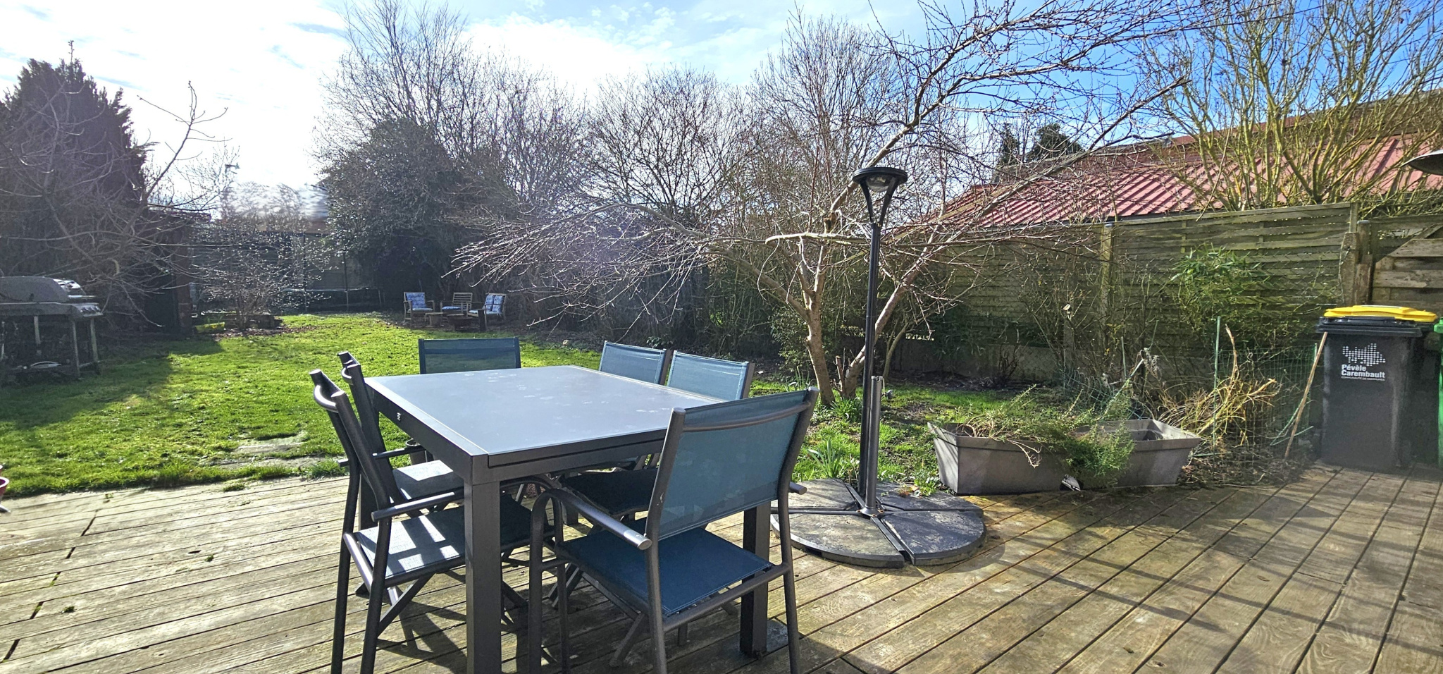 jardin cloturé et bien planté aux multiples essences avec terrasse