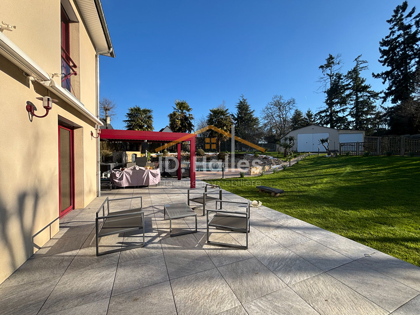 Située à Bourgbarré, à proximité immédiate du centre et nichée au coeur d'un parc arboré d'environ 3 200 m² avec piscine chauffée de 2019, cette belle propriété construite en 2003 séduit par la qualité de ses matériaux et le soin apporté à son entretien. Au rez-de-chaussée, vous découvrirez un hall d'entrée, un lumineux séjour-salon avec insert, ainsi qu'une cuisine aménagée et équipée ouvrant sur une terrasse carrelée exposée sud-Ouest. Une véranda réalisée en 2018 complète agréablement l'espace de vie. L'espace parental comprend un dégagement, un bureau, une chambre, une salle de bains avec douche et un dressing. Un garage attenant d'environ 30 m² avec grenier et cave vient parfaire ce niveau. A l'étage, trois chambres spacieuses de plus de 12 m², une salle d'eau et des sanitaires indépendants composent l'espace nuit. En complément, quatre studios indépendants et meublés génèrent un revenu locatif mensuel d'environ 1 400 euros. Une vaste dépendance à usage de garage-atelier d'environ 150 m² permet le stationnement de plusieurs véhicules et offre d'importantes capacités de rangement. Infos : 8 panneaux photovoltaïque installés en 2018 , puits sur le terrain. Un bien rare aux prestations soignées, idéal pour conjuguer cadre de vie privilégié et investissement locatif. Pour plus d'informations sur cette propriété ou une visite, n'hésitez pas à contacter Emeline REGEREAU au 02 43 70 12 66. « Les informations sur les risques auxquels ce bien est exposé sont disponibles sur le site Géorisques : www.georisques.gouv.fr » Retrouvez tous nos biens sur notre site : https://renaze.id-halles.fr/