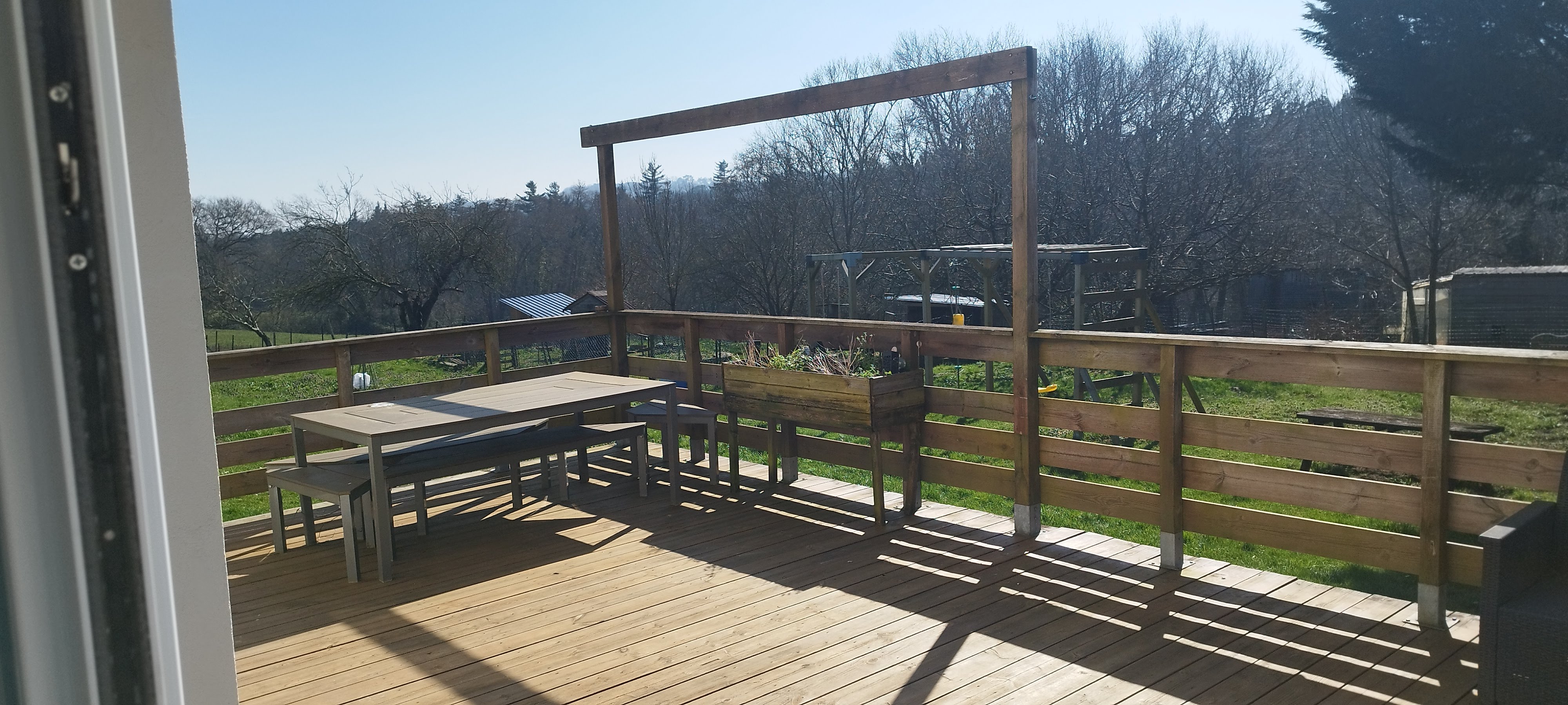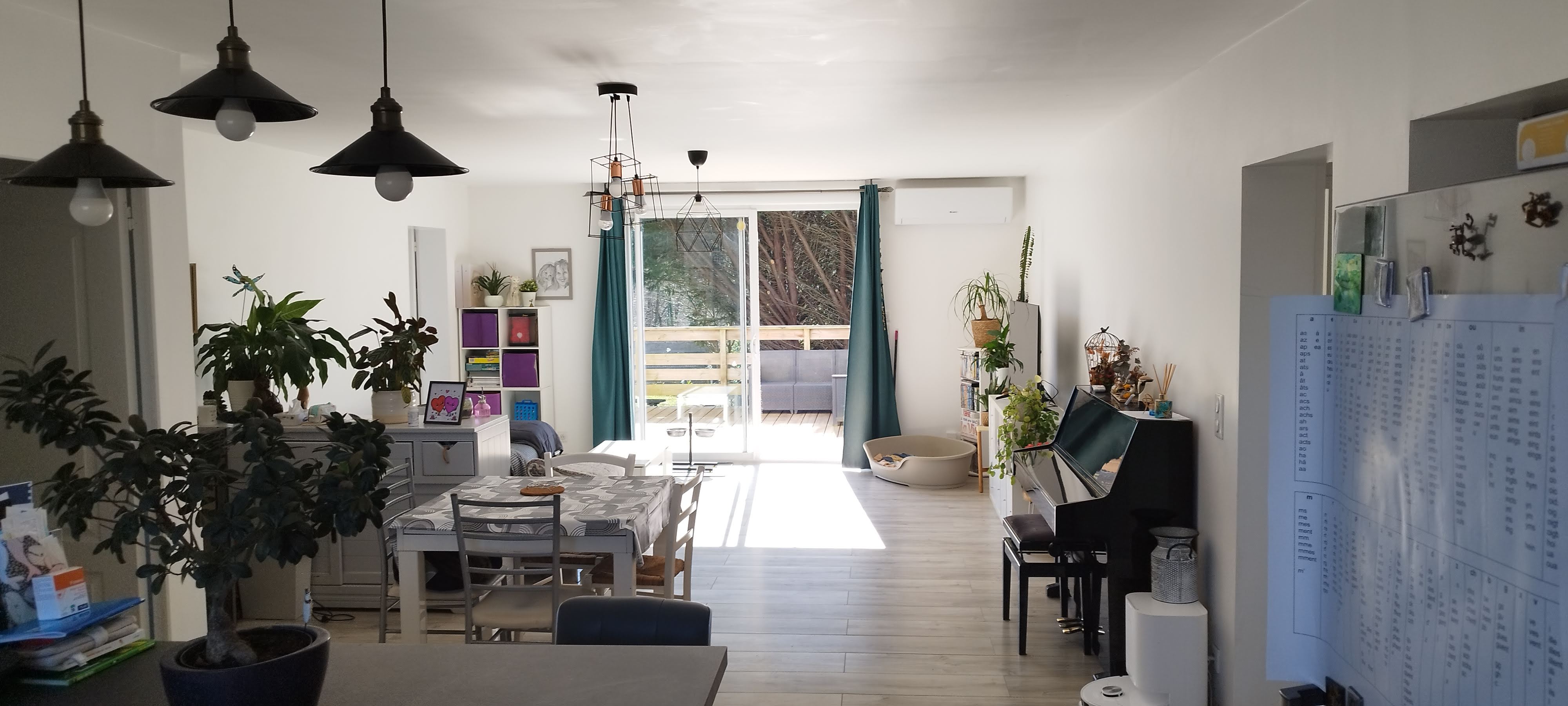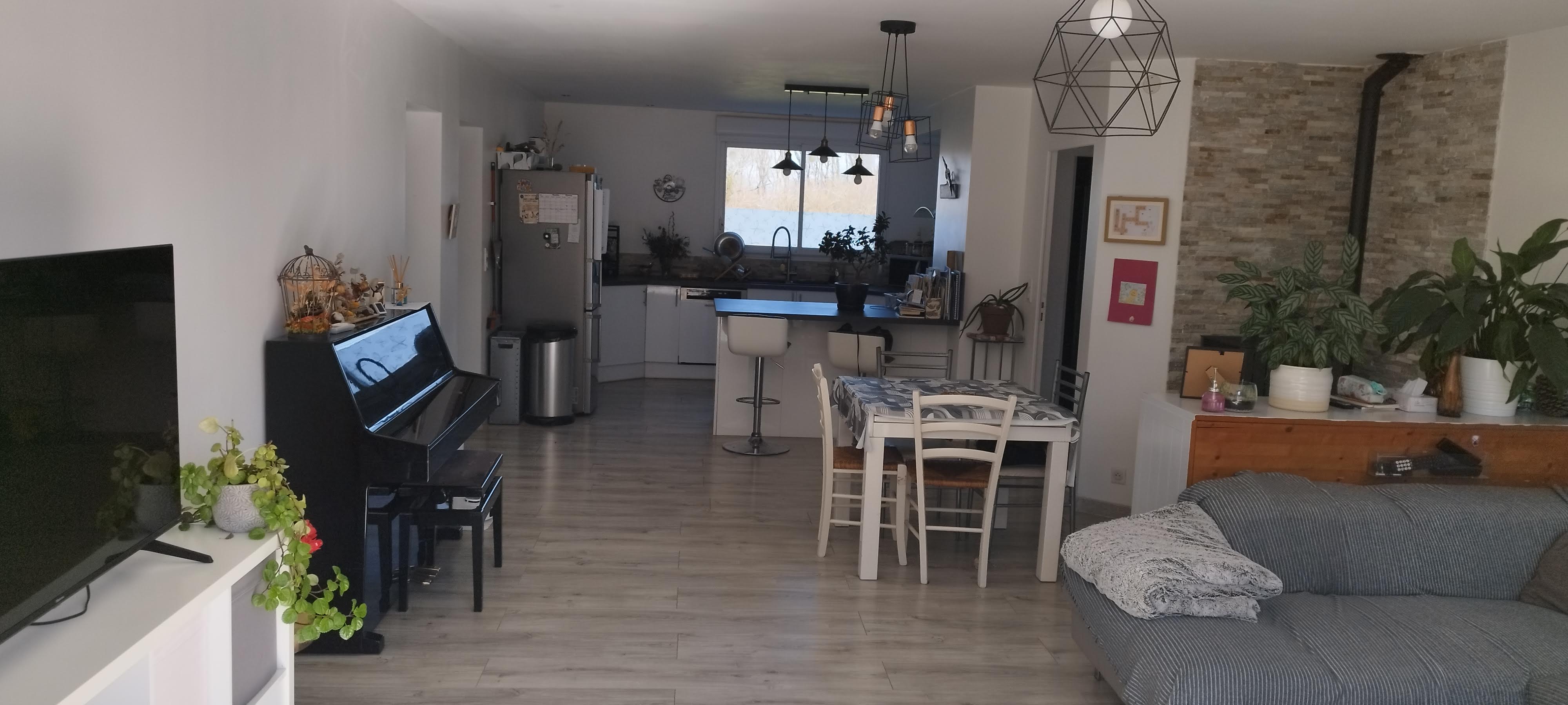Rez-de-chaussée comprenant un grand séjour avec cuisine américaine donnant sur une grande terrasse bois exposée sud (climatisation et poêle à granulés), 4 chambres de 12m2 chacune, salle d'eau, salle de bain et toilettes.