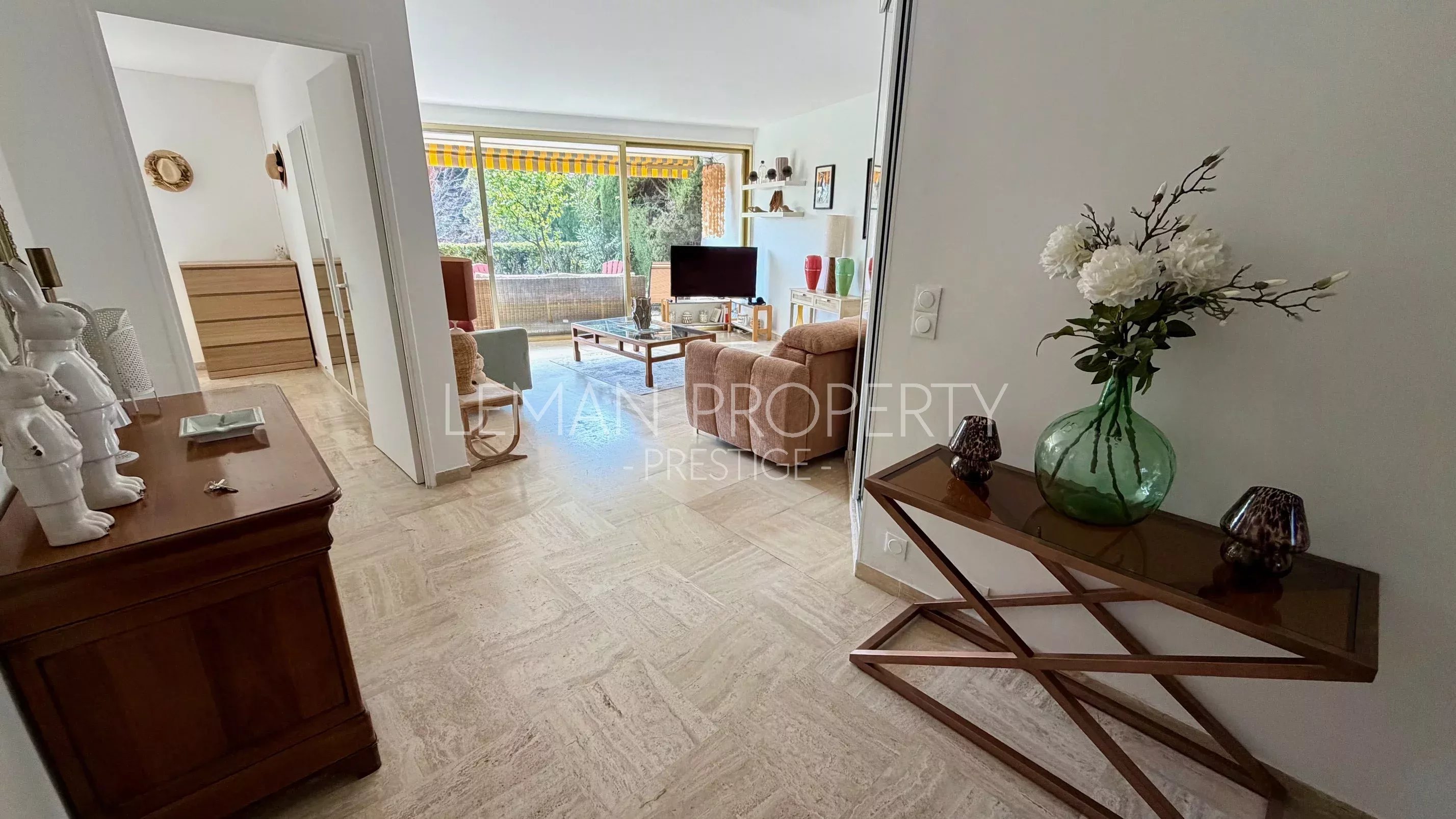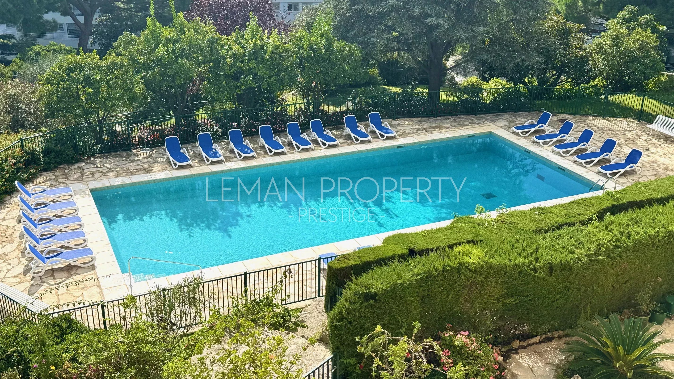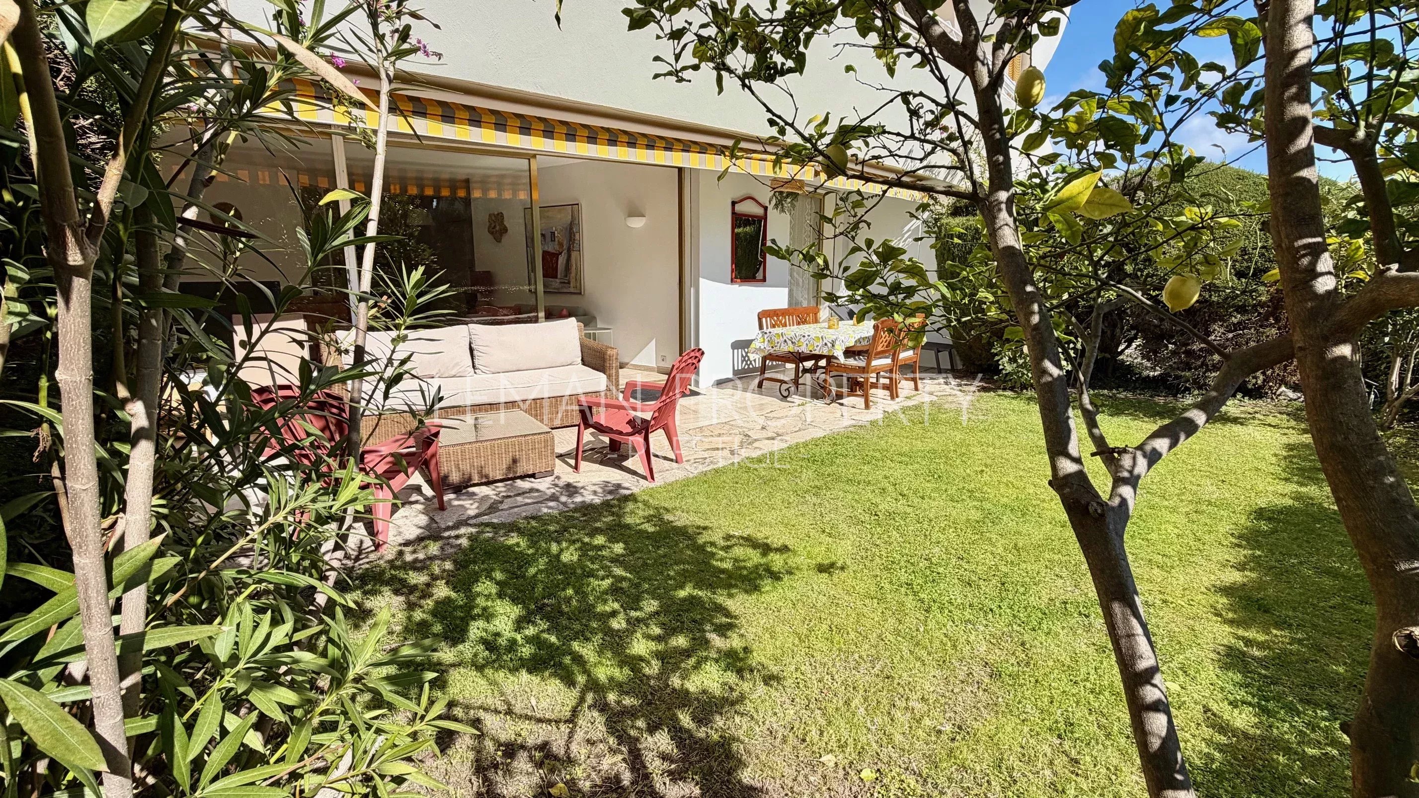 Au sein d'une luxueuse résidence fermée avec régisseur et services, parc paysager de 4 hectares, piscine, tennis et terrain de pétanque, très bel appartement 2 pièces traversant de 53,64 m2. Le bien comprend une entrée, une cuisine équipée, un séjour et une chambre possédant de grandes baies vitrées donnant sur une belle terrasse de 14 m2 et un jardin privatif de 51 m2, une salle de douche et des toilettes séparées. Vendu avec 1 cave en sous-sol. Places de parking sécurisées dans la résidence, possibilité de louer un box. Proche mer à pied. Charges de 260 euros par mois, incluant l’eau et le chauffage.