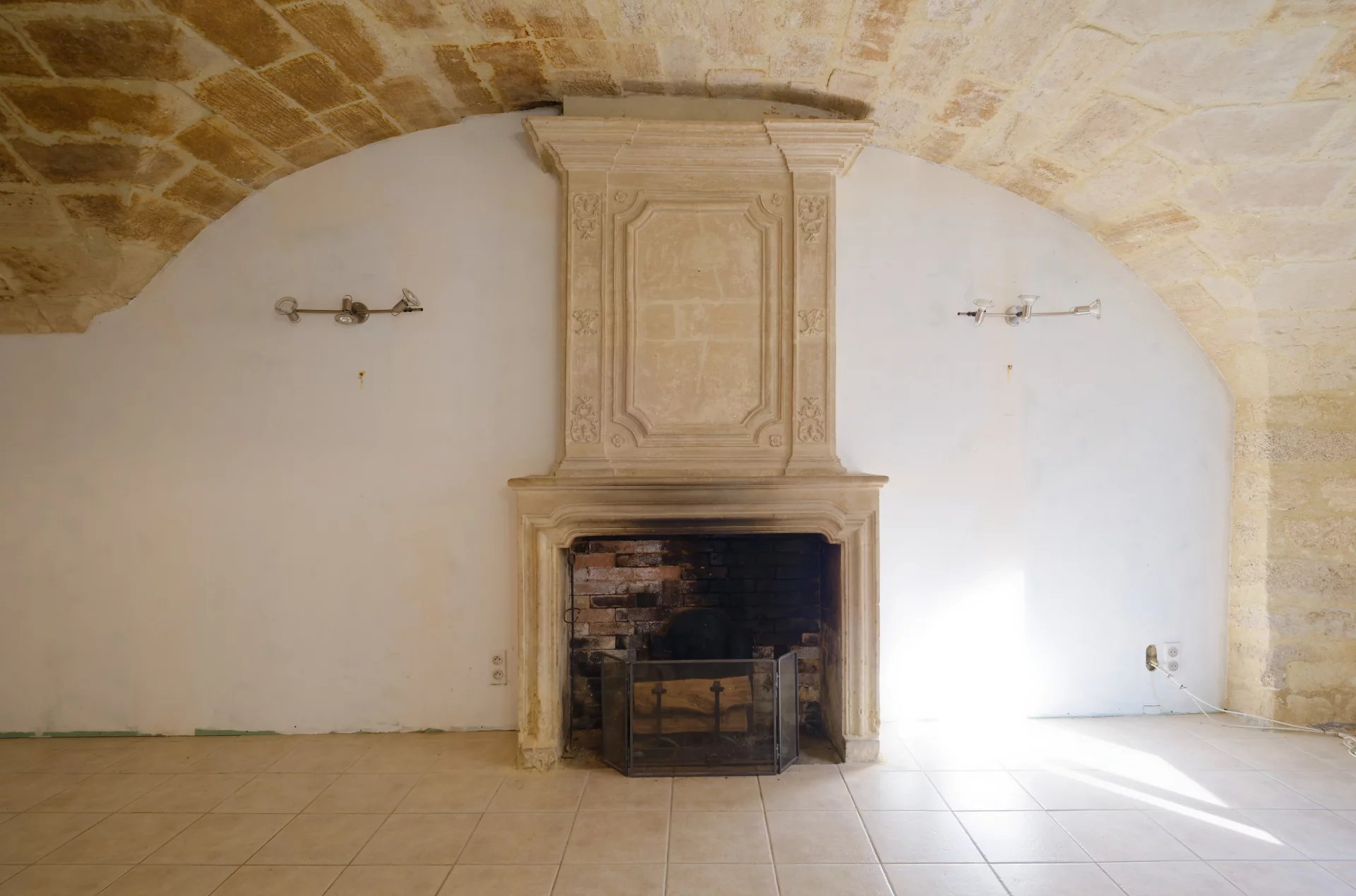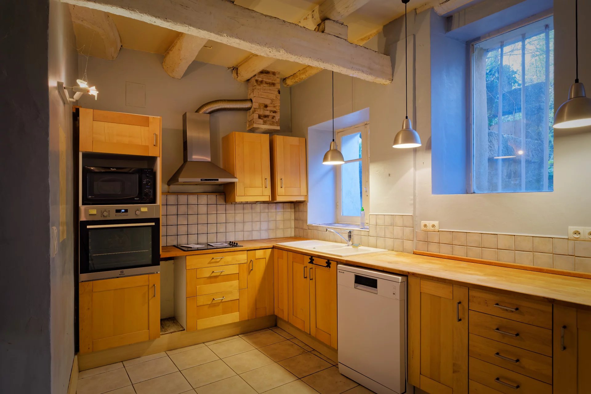 Au rez-de-chaussée environ 59m2 : un salon voûté en pierre de taille avec une cheminée, une cuisine équipée avec accès au jardin, un cellier et un wc séparé.