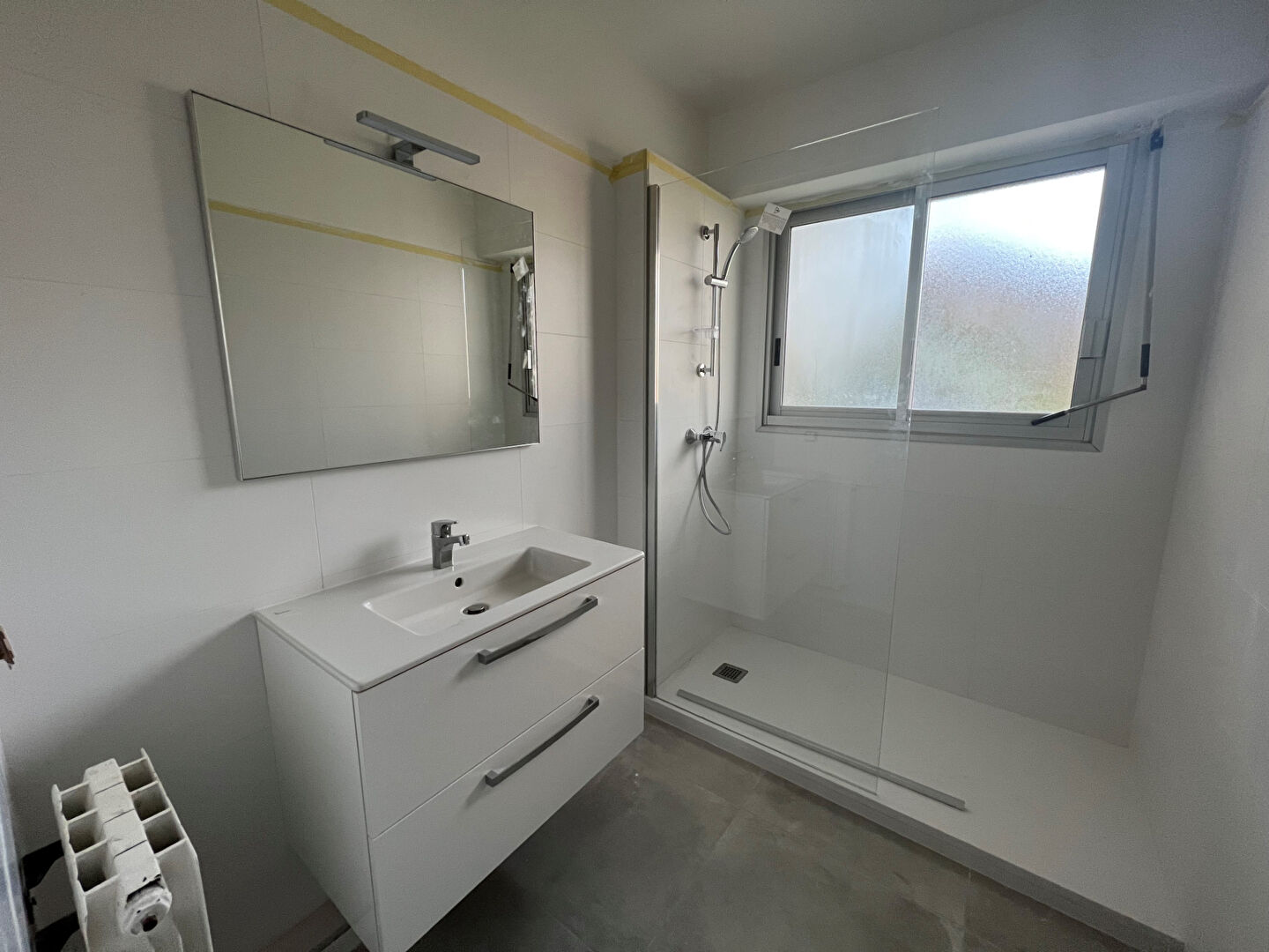 Appartement de Type 4 composé d'une entrée, une cuisine équipée (éléments hauts et bas, four, plaque, hotte), un salon/séjour, un dégagement, un wc, 3 chambres avec placards aménagés, une salle de bains avec wc, une salle d'eau, 3 terrasses et un garage en sous-sol.
