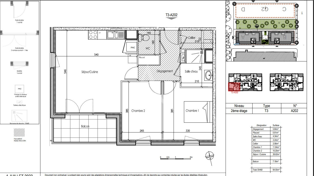 Composée de trois étages, la résidence adopte un style contemporain qui s'intègre naturellement dans le quartier de la Manufacture des Allumettes. Son architecture s'inspire de l'esprit industriel du secteur, avec une toiture inclinée en zinc et des ouvertures qui animent les façades. La cage d'escalier, également habillée de zinc, ainsi que des éléments métalliques décoratifs, rappellent ce caractère industriel. Le rez-de-chaussée, en teinte gris foncé, évoque la couleur de l'ardoise. Les logements sont ouverts sur l'extérieur et disposent de balcons, et pour certains, de terrasses situées au premier étage ou au dernier niveau. La résidesnce comprend 34 appartements, du T2 au T3, avec des places de stationnement accessibles au rez-de-chaussée. A VENDRE type T3 neuf de 64,55m² situé au 2ème étage dans cette nouvelle résidence contemporaine comprenant une entrée, un séjour cuisine de 26,62m² ouvert sur un balcon de 7,18m², un cellier, deux chambres de 11,84m² et 10,20m² , une salle d'eau et WC séparé Idéal investisseur ou résidence principale Réglementation RE-2020 Prix: 222 429 euros TTC TVA 5,5% (*) soumis à conditions de ressources (frais notaire réduits 2.5%) (Prix direct promoteur) REF: 35716AlluA202 Informations auprès de Gwénaëlle GROU au 07 72 41 01 29 , spécialiste neuf Centre-ville d'Angers, quartiers de la Gare, la Madeleine, Doutre, Lafayette, Visitation, place du lycée, Quinconce, Saint Léonard, Jeanne d'Arc et du Lac de Maine, Belle-beille, Avrillé, Saint Barthélemy, Trélazé ... pour trouver votre solution immobilière en Résidence principale ou secondaire, LMNP, Location, Gestion immobilière. "Les informations sur les risques auxquels ce bien est exposé sont disponibles sur le site Géorisques : www.georisques.gouv.fr" Copropriété de 64 lots - dont 64 lots habitation.