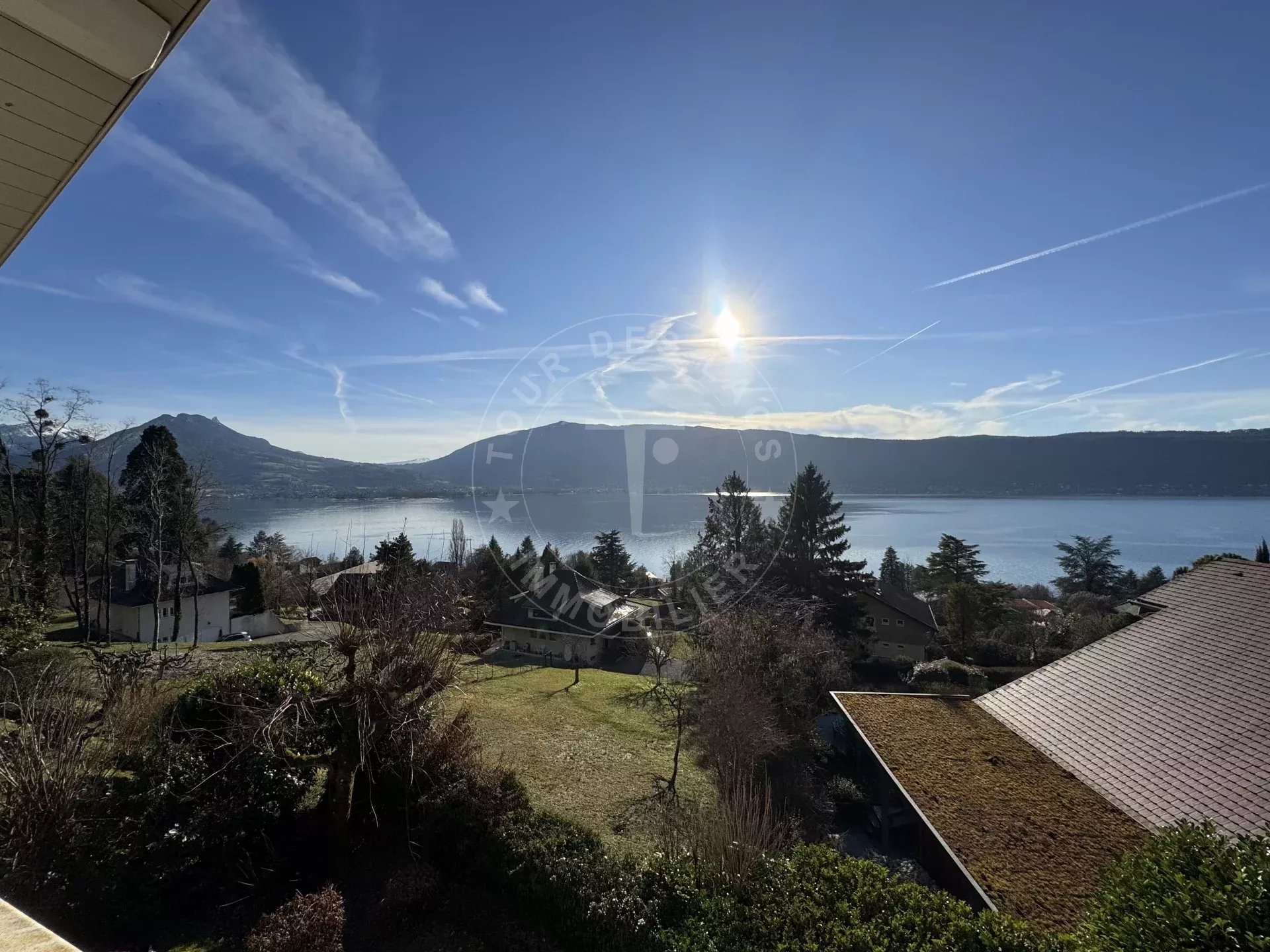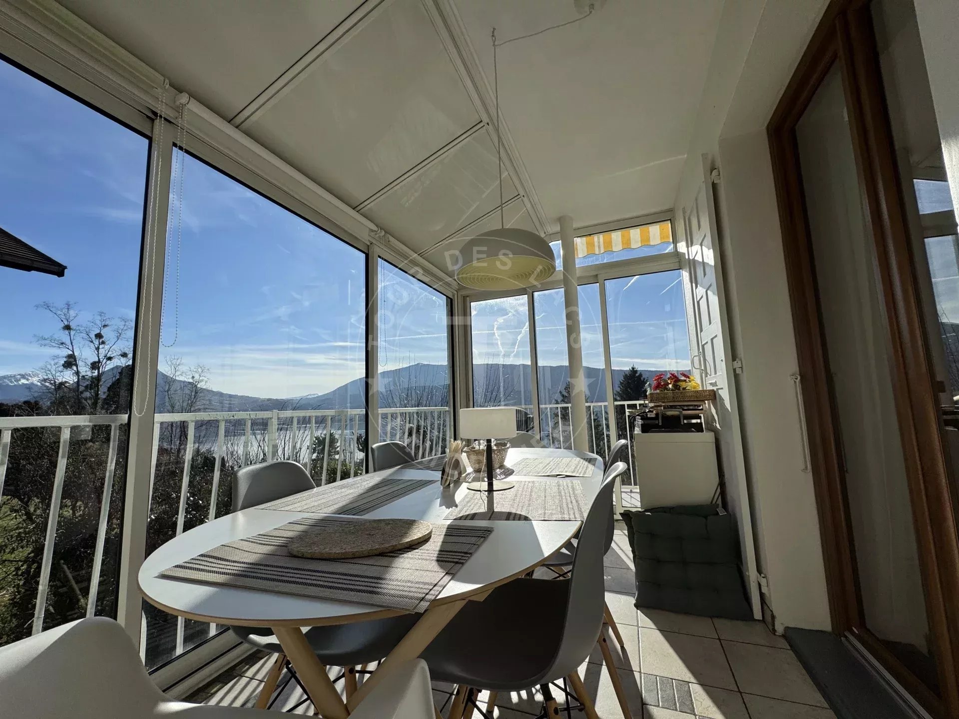 Le grand séjour constitue la pièce centrale avec de beaux volumes baignés de lumière naturelle. Il s’ouvre sur un balcon qui offre une vue panoramique remarquable sur le lac et les paysages environnants, un véritable atout qui accompagne chaque moment de la journée.