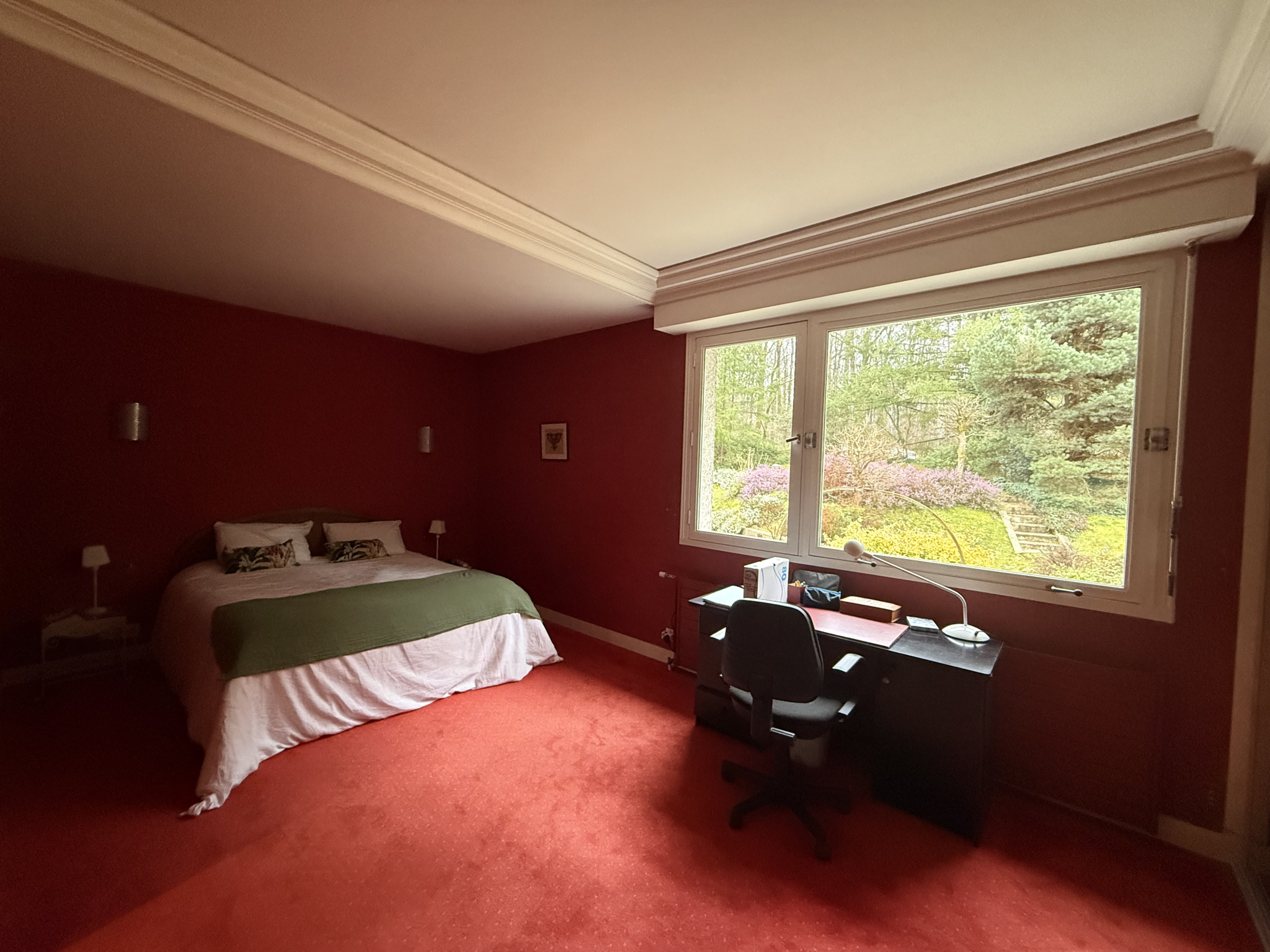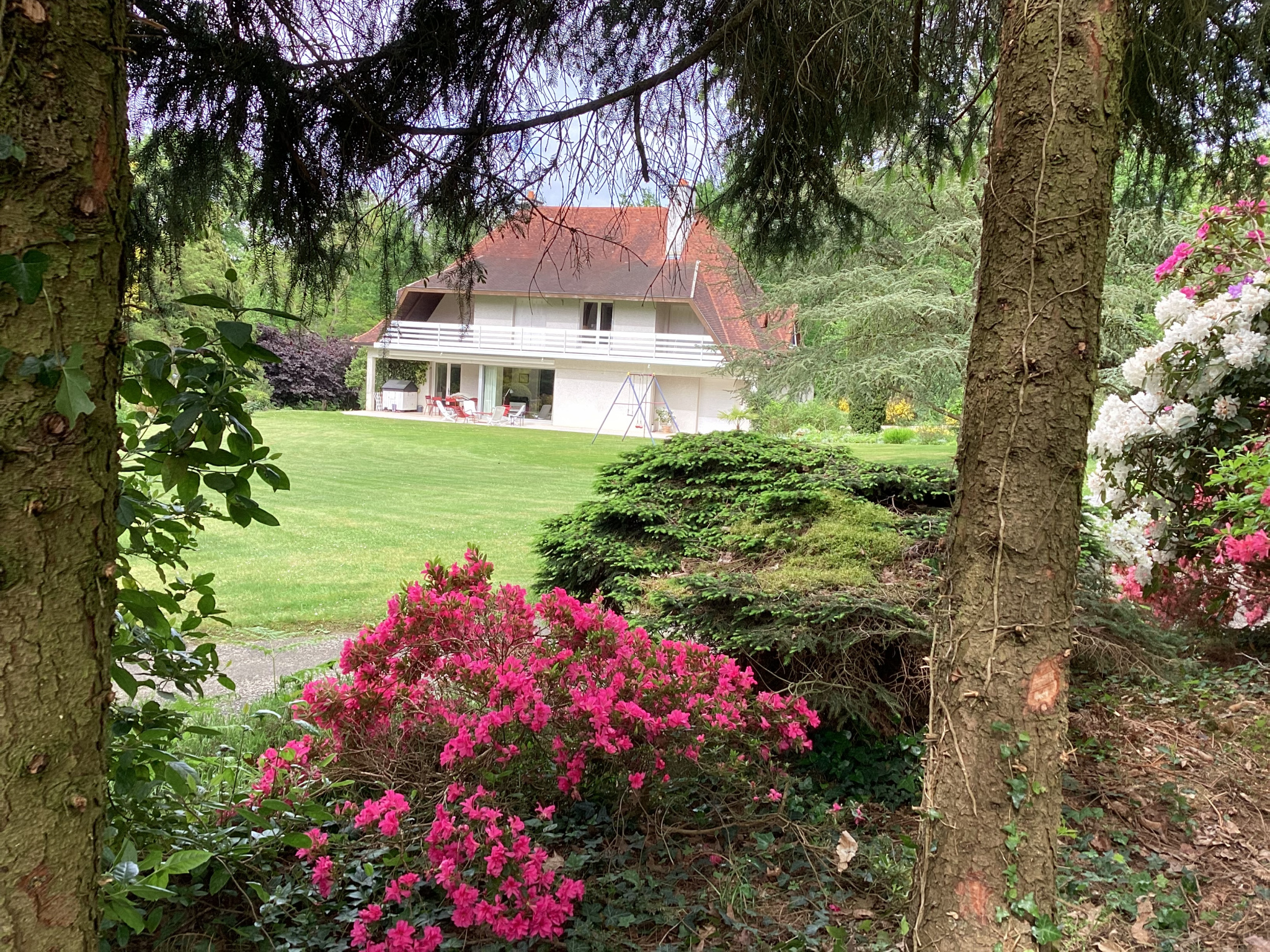 A l'extérieur : La propriété est située dans un grand parc de 5 991 m2 de terrain verdoyant.