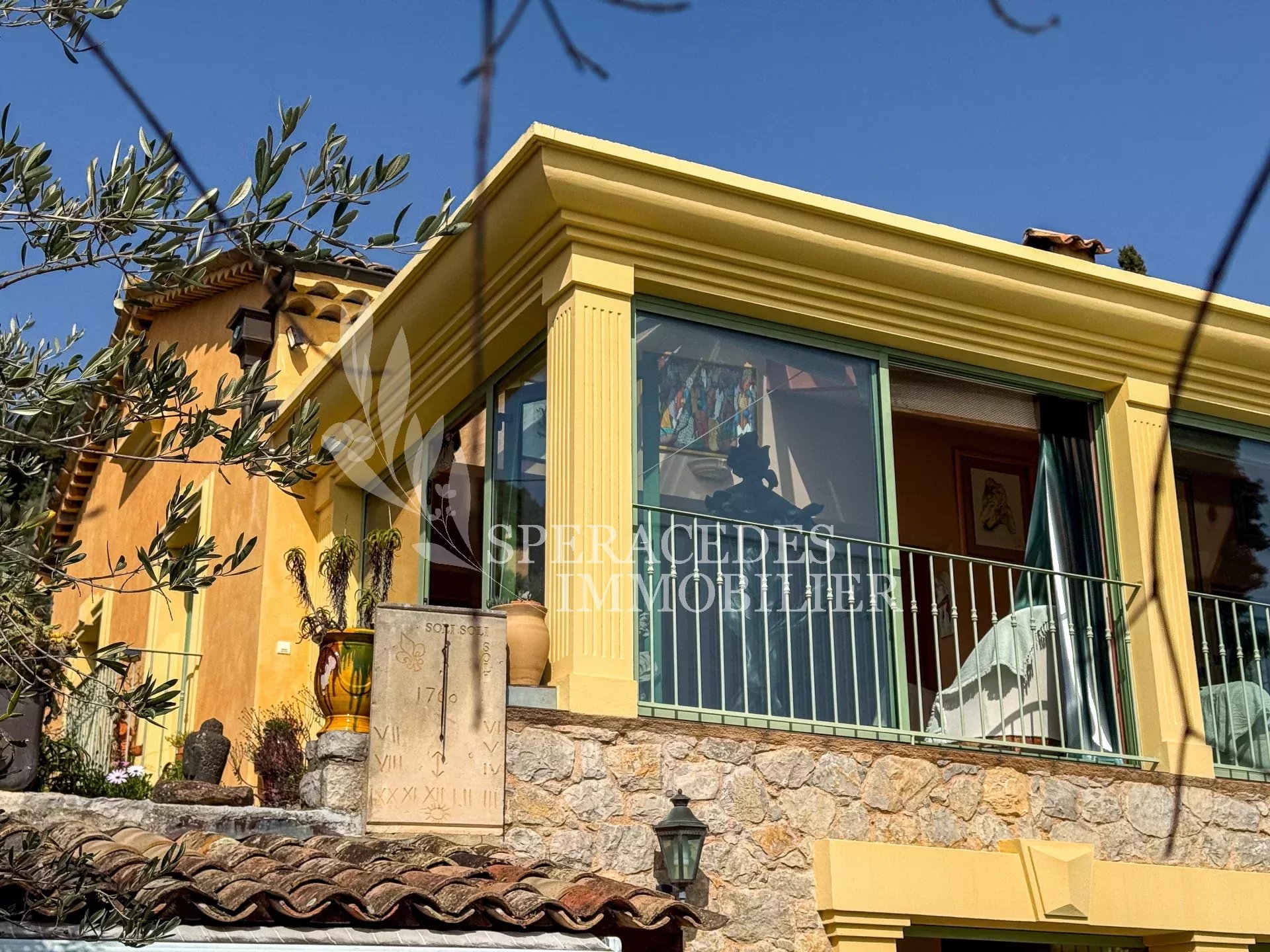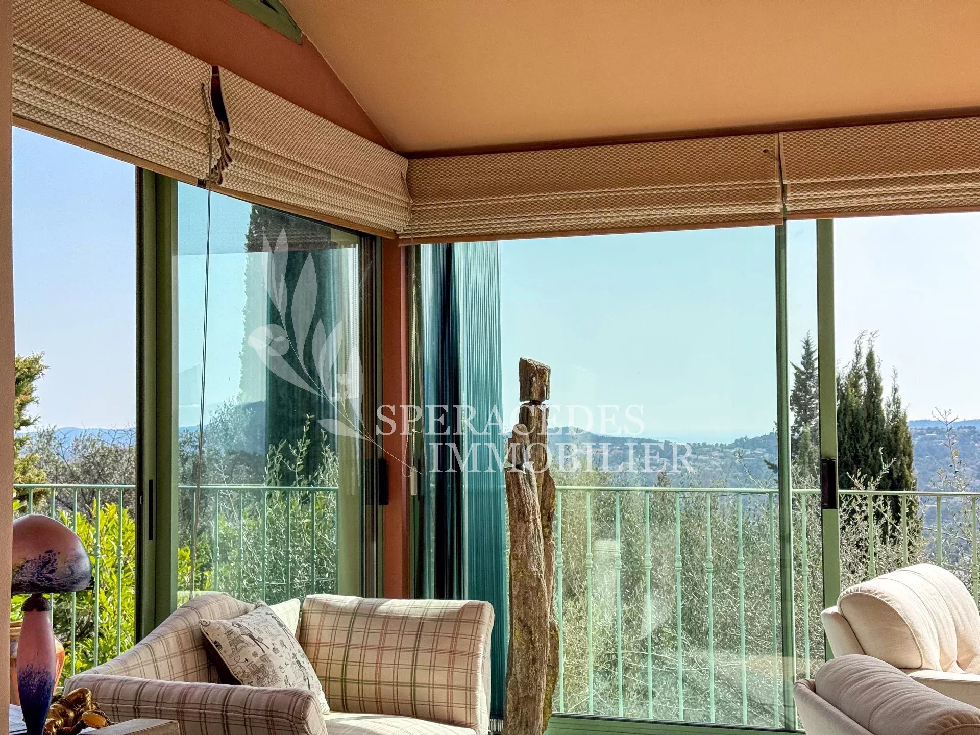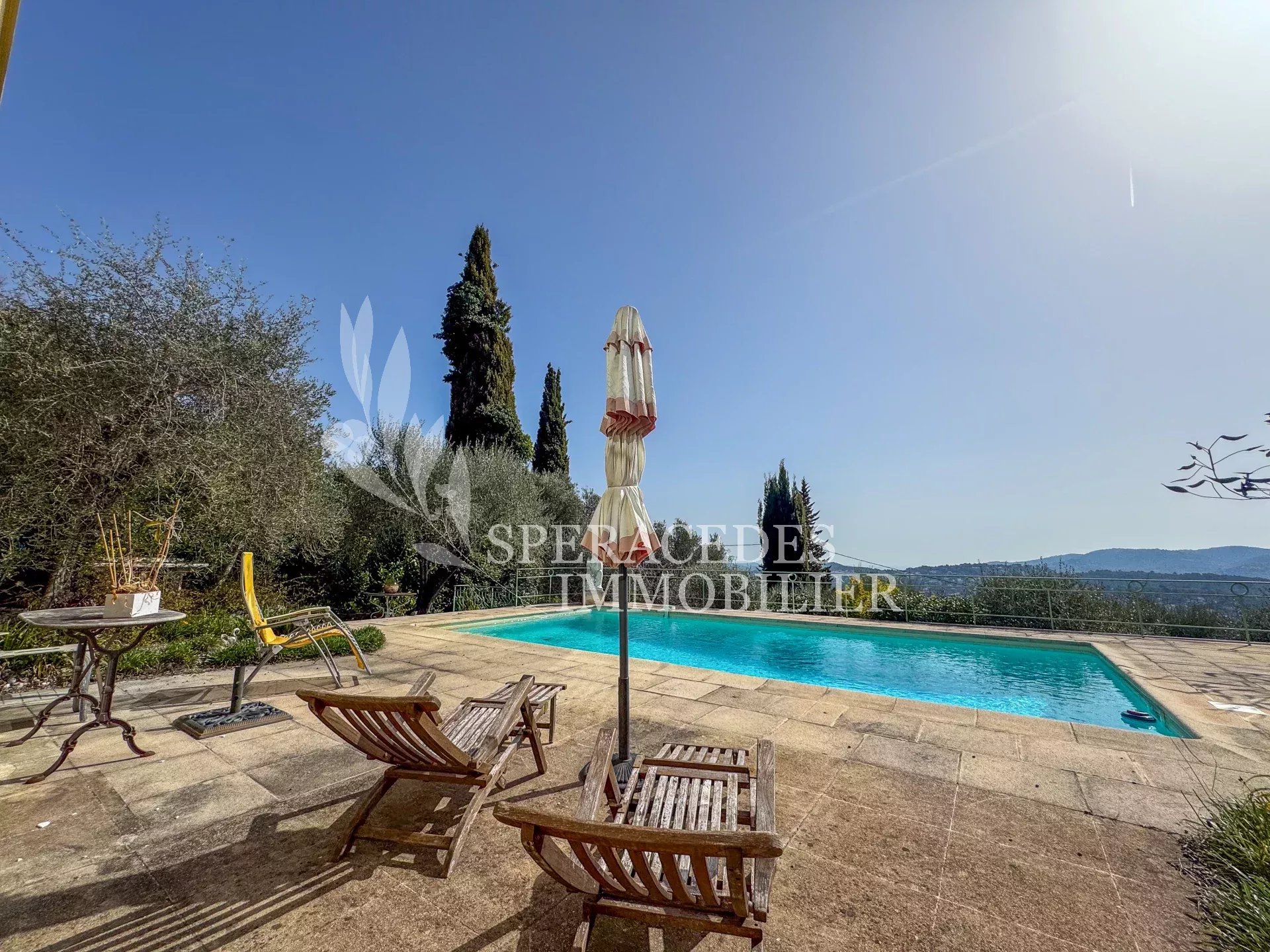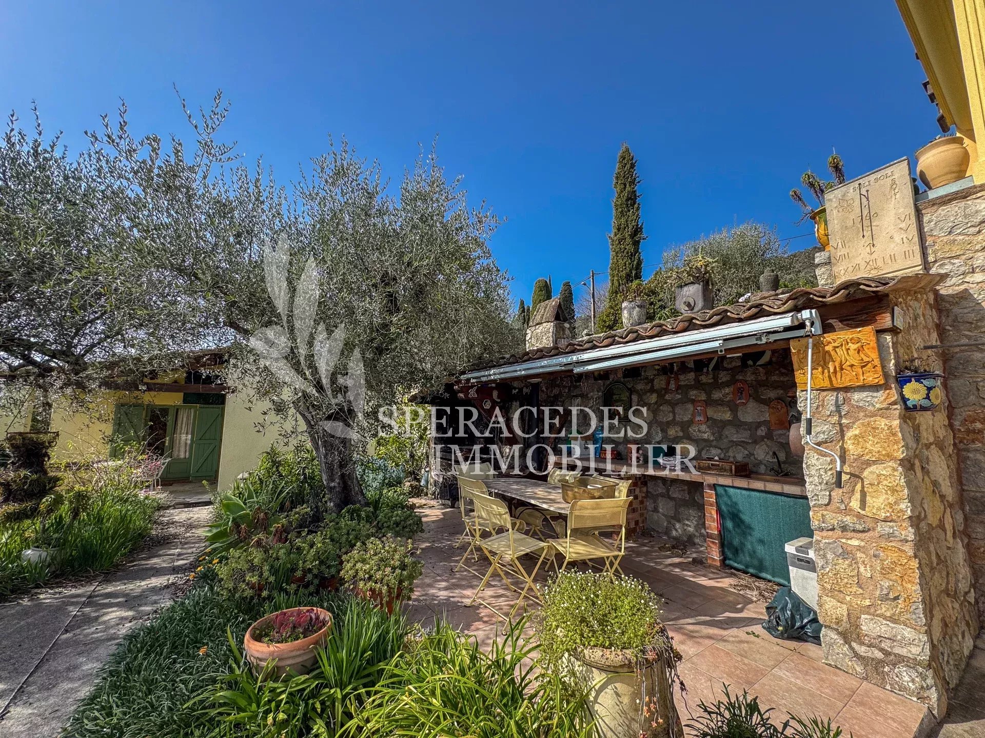 Spéracèdes, belle maison atypique bénéficiant d’une vue mer, collines et lac, à pied du village avec une maison d’amis indépendante, pour une surface habitable totale d’environ 230 m². La maison principale, d’environ 193 m² répartis sur deux niveaux, se compose : Au rez-de-chaussée d’un séjour véranda avec poêle, d’un salon / salle à manger avec cheminée, d’une cuisine ouverte, de deux chambres et d’une salle de bains. En rez-de-jardin, elle offre deux chambres supplémentaires, une salle d’eau avec sauna, un séjour, une cuisine, un cellier, une cave à vin ainsi qu’un local chaudière. La maison d’amis, d’une surface d’environ 35 m², comprend un salon, une cuisine et une salle de bains. L’ensemble est édifié sur un terrain de 2 290 m² et bénéficie d’un bel espace piscine avec cuisine d’été ainsi que d’un abri voitures. La propriété est raccordée au tout-à-l’égout et offre la possibilité de détacher une parcelle d’environ 750 m², déjà prévue par géomètre.