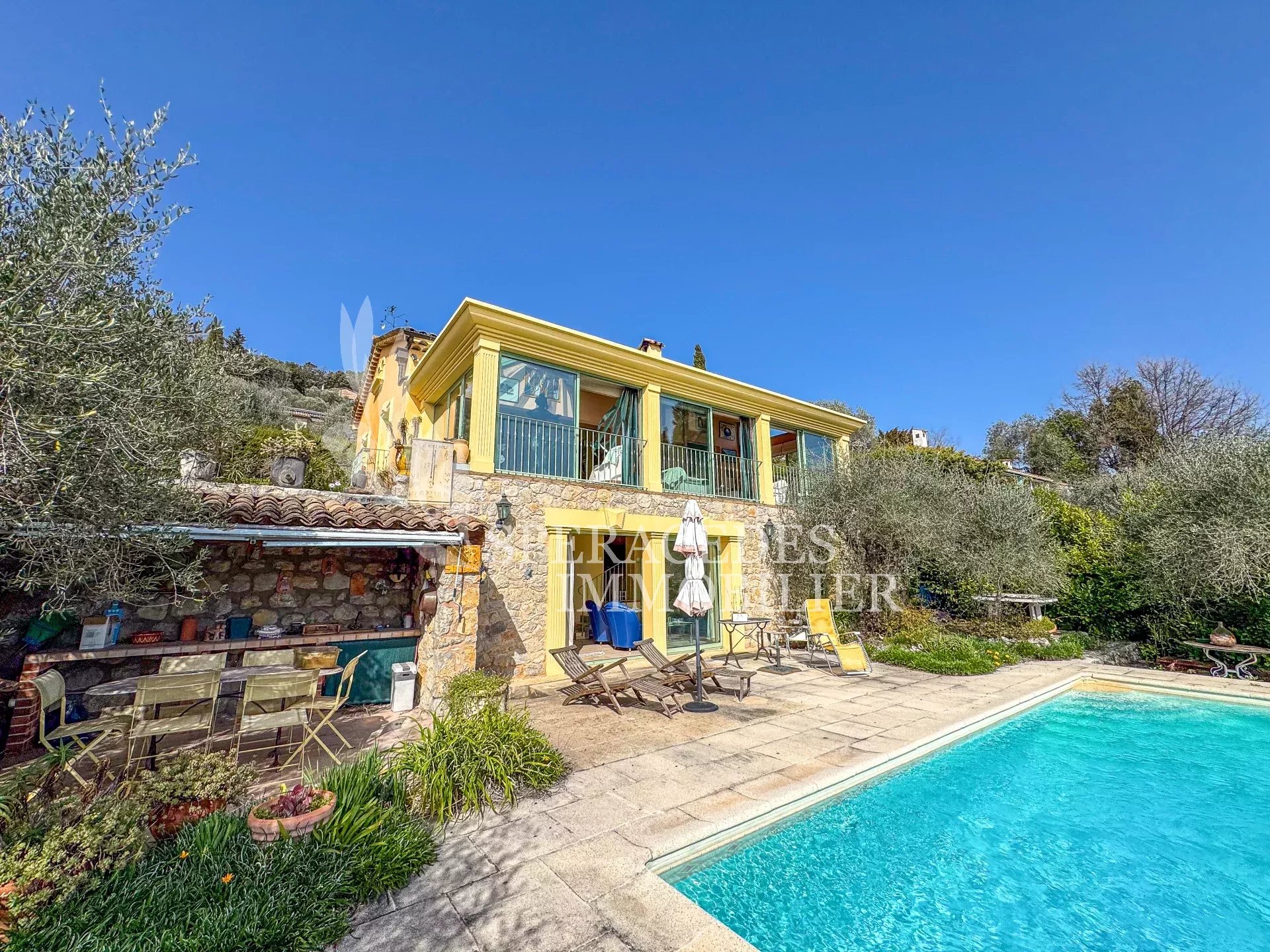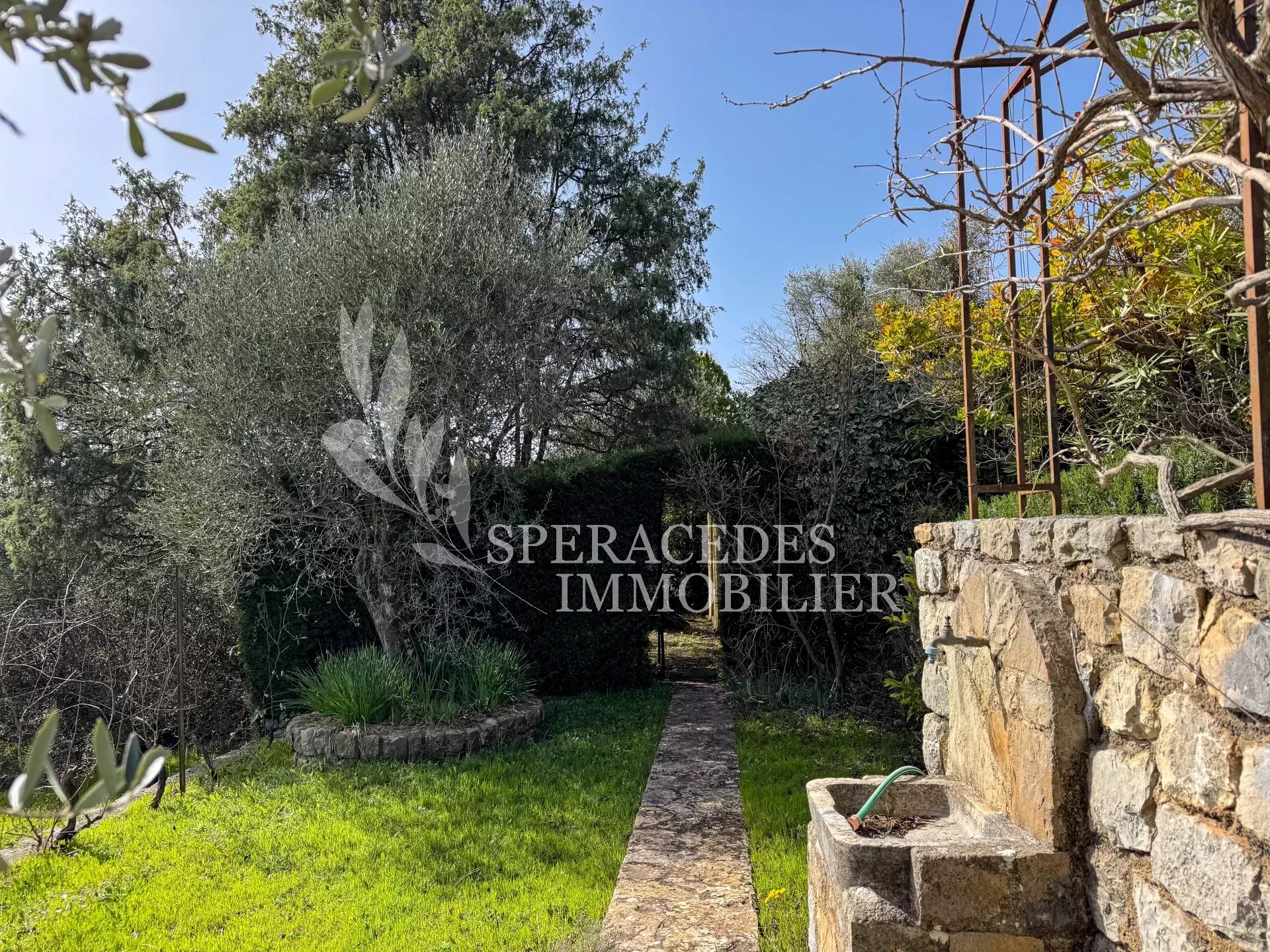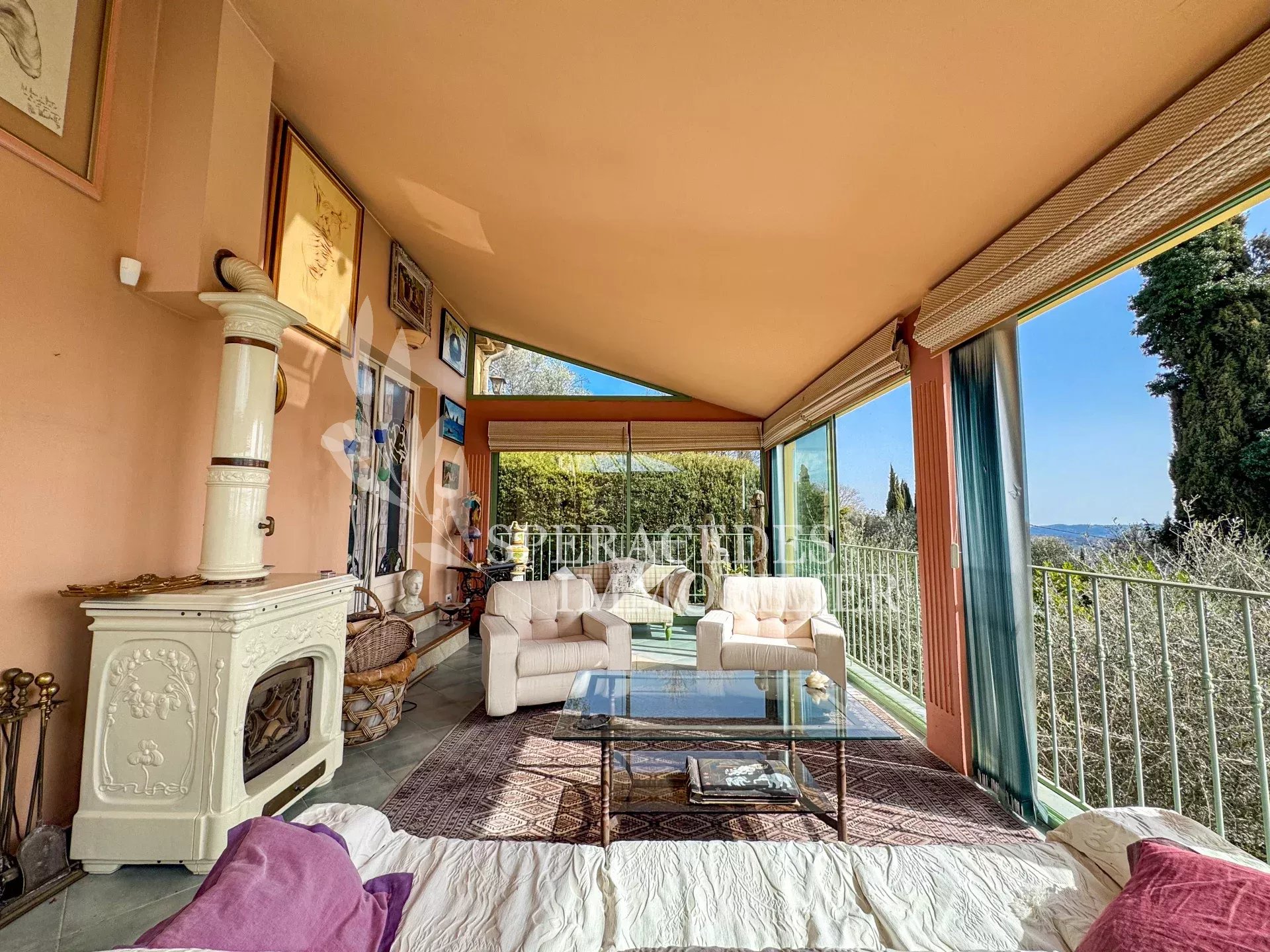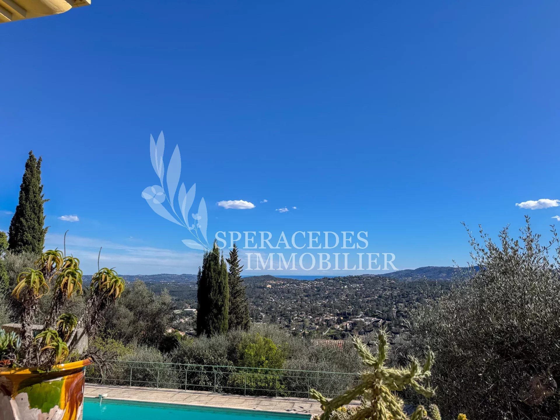 Spéracèdes, belle maison atypique bénéficiant d’une vue mer, collines et lac, à pied du village avec une maison d’amis indépendante, pour une surface habitable totale d’environ 230 m². La maison principale, d’environ 193 m² répartis sur deux niveaux, se compose : Au rez-de-chaussée d’un séjour véranda avec poêle, d’un salon / salle à manger avec cheminée, d’une cuisine ouverte, de deux chambres et d’une salle de bains. En rez-de-jardin, elle offre deux chambres supplémentaires, une salle d’eau avec sauna, un séjour, une cuisine, un cellier, une cave à vin ainsi qu’un local chaudière. La maison d’amis, d’une surface d’environ 35 m², comprend un salon, une cuisine et une salle de bains. L’ensemble est édifié sur un terrain de 2 290 m² et bénéficie d’un bel espace piscine avec cuisine d’été ainsi que d’un abri voitures. La propriété est raccordée au tout-à-l’égout et offre la possibilité de détacher une parcelle d’environ 750 m², déjà prévue par géomètre.