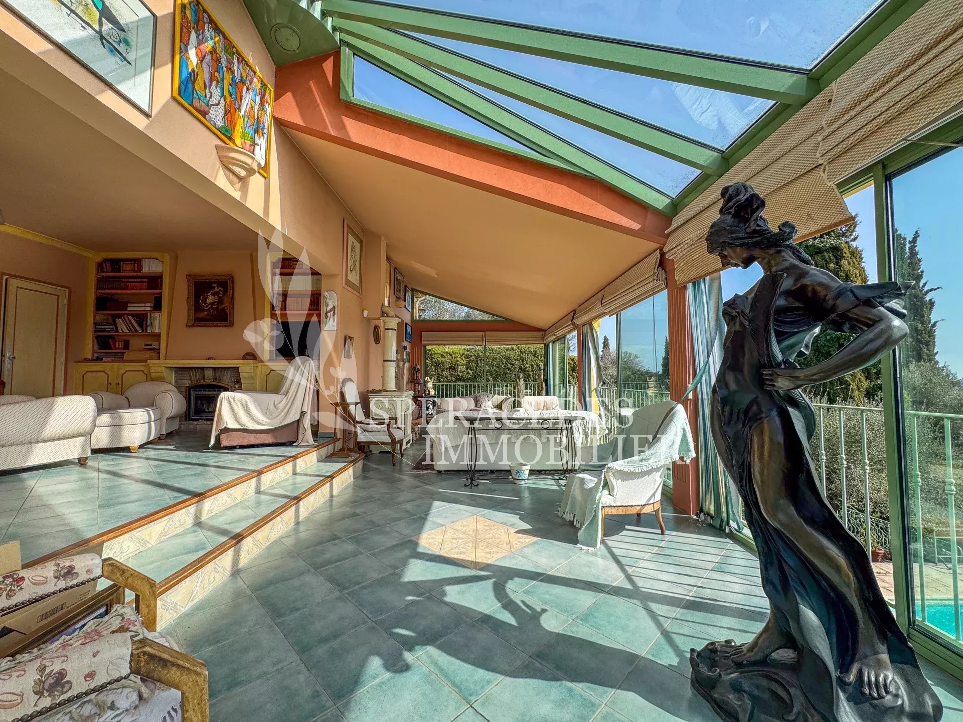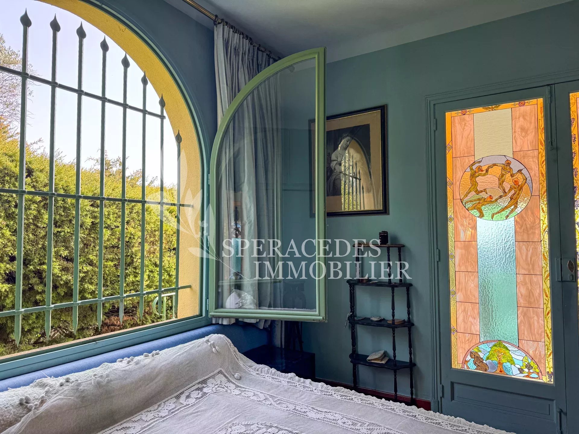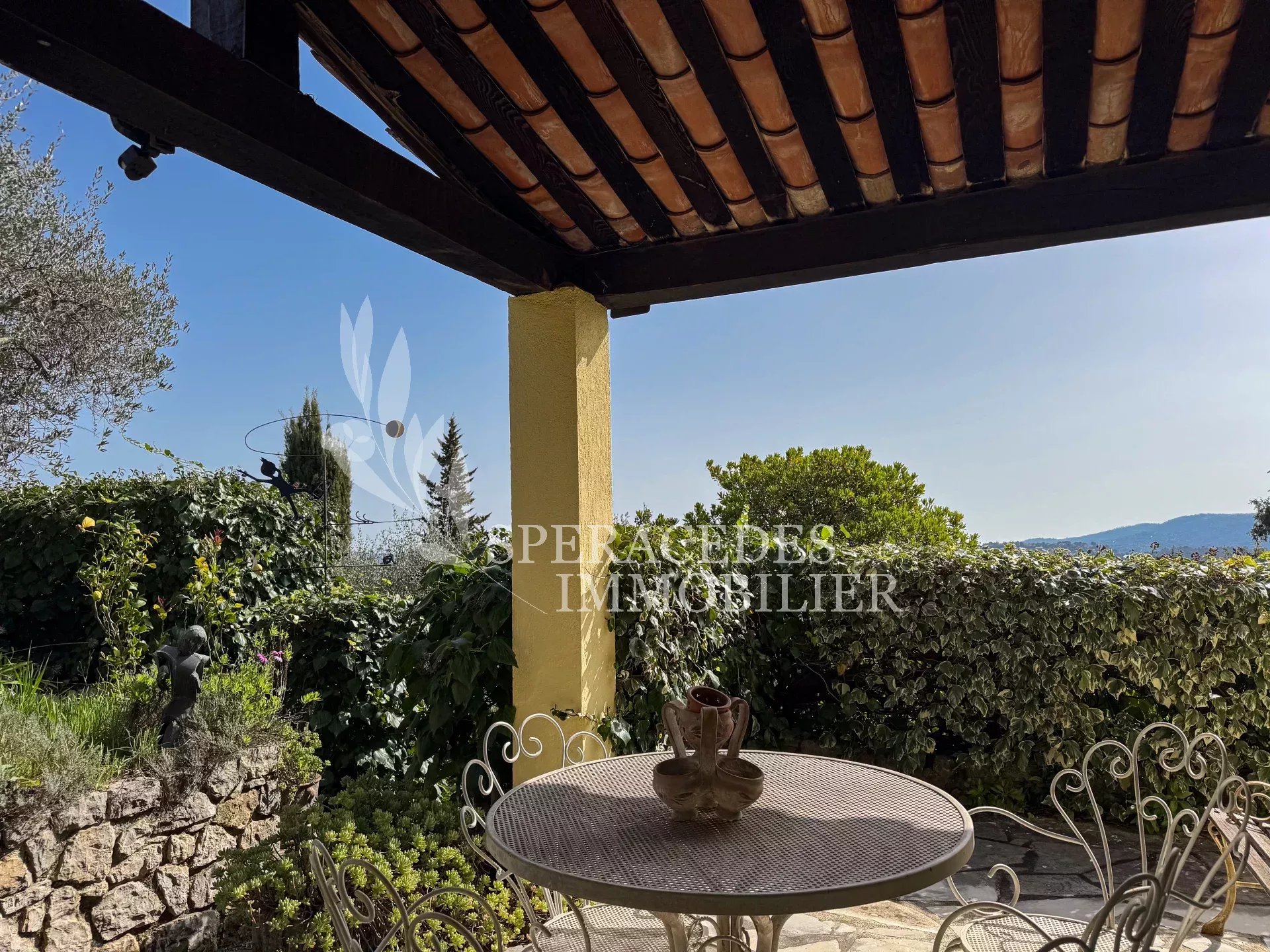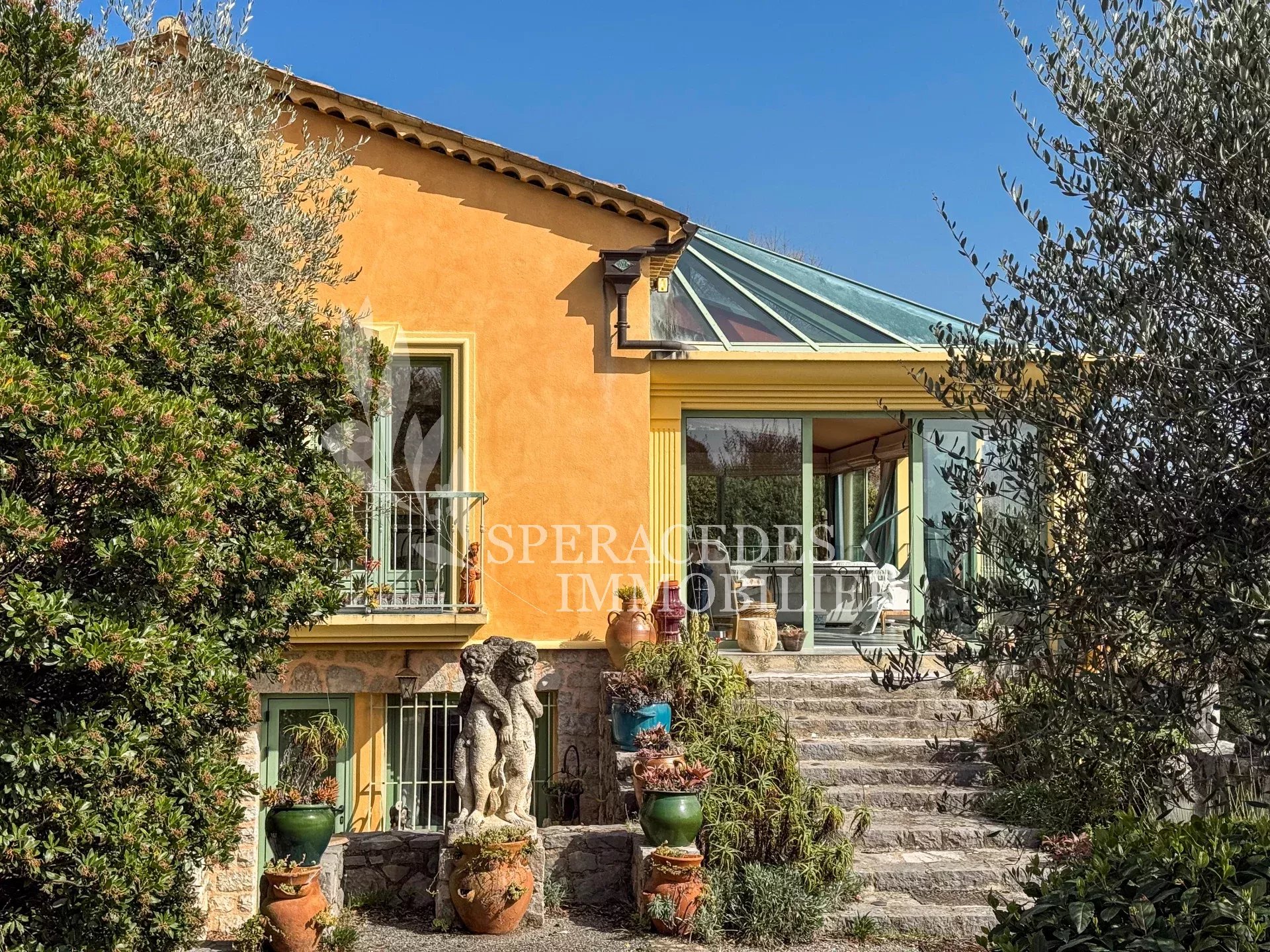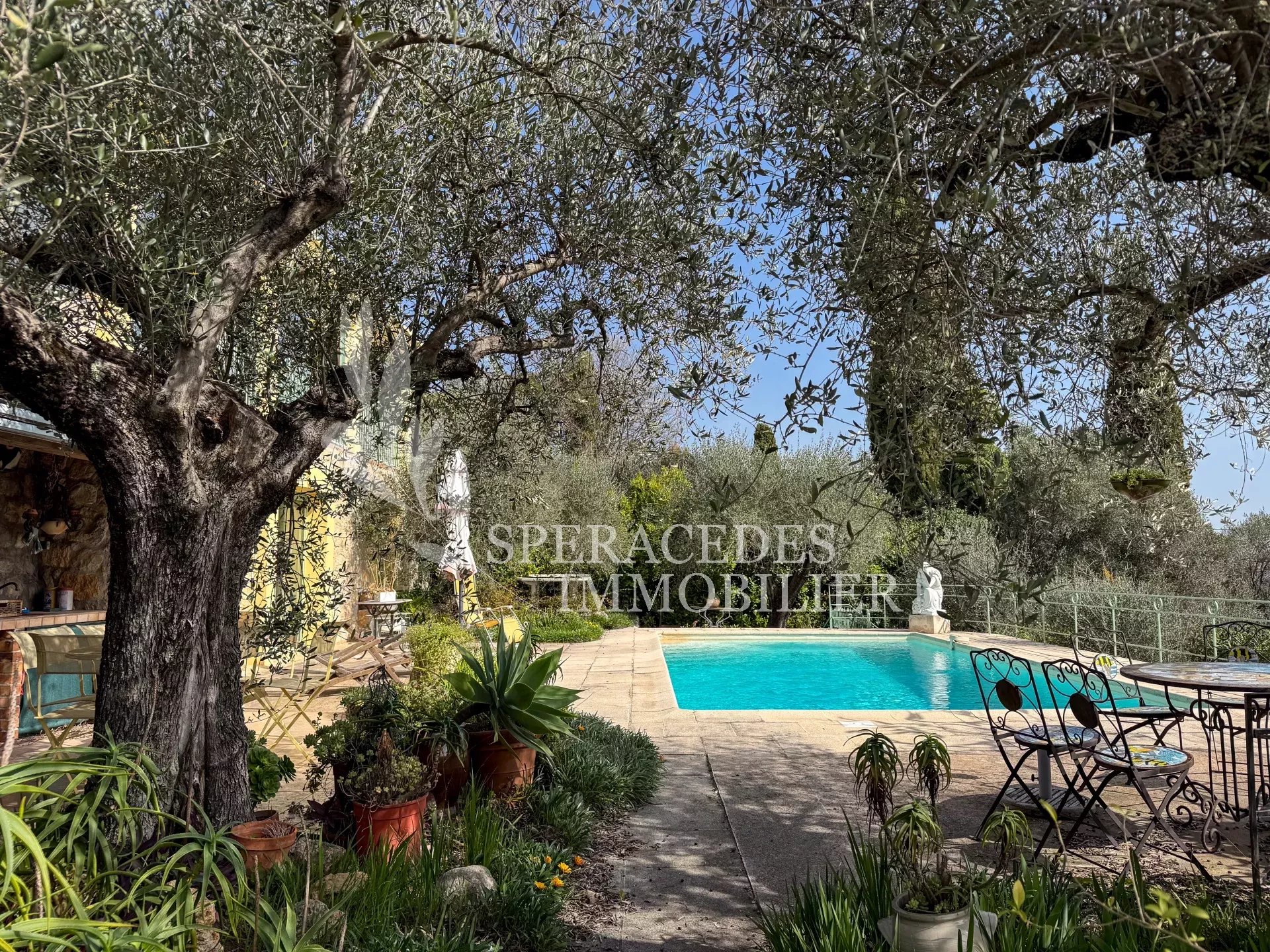 Spéracèdes, belle maison atypique bénéficiant d’une vue mer, collines et lac, à pied du village avec une maison d’amis indépendante, pour une surface habitable totale d’environ 230 m². La maison principale, d’environ 193 m² répartis sur deux niveaux, se compose : Au rez-de-chaussée d’un séjour véranda avec poêle, d’un salon / salle à manger avec cheminée, d’une cuisine ouverte, de deux chambres et d’une salle de bains. En rez-de-jardin, elle offre deux chambres supplémentaires, une salle d’eau avec sauna, un séjour, une cuisine, un cellier, une cave à vin ainsi qu’un local chaudière. La maison d’amis, d’une surface d’environ 35 m², comprend un salon, une cuisine et une salle de bains. L’ensemble est édifié sur un terrain de 2 290 m² et bénéficie d’un bel espace piscine avec cuisine d’été ainsi que d’un abri voitures. La propriété est raccordée au tout-à-l’égout et offre la possibilité de détacher une parcelle d’environ 750 m², déjà prévue par géomètre.