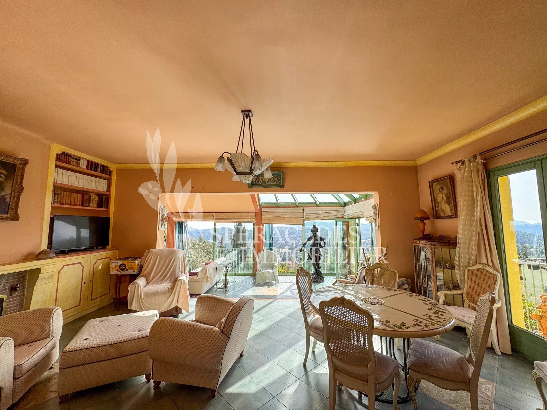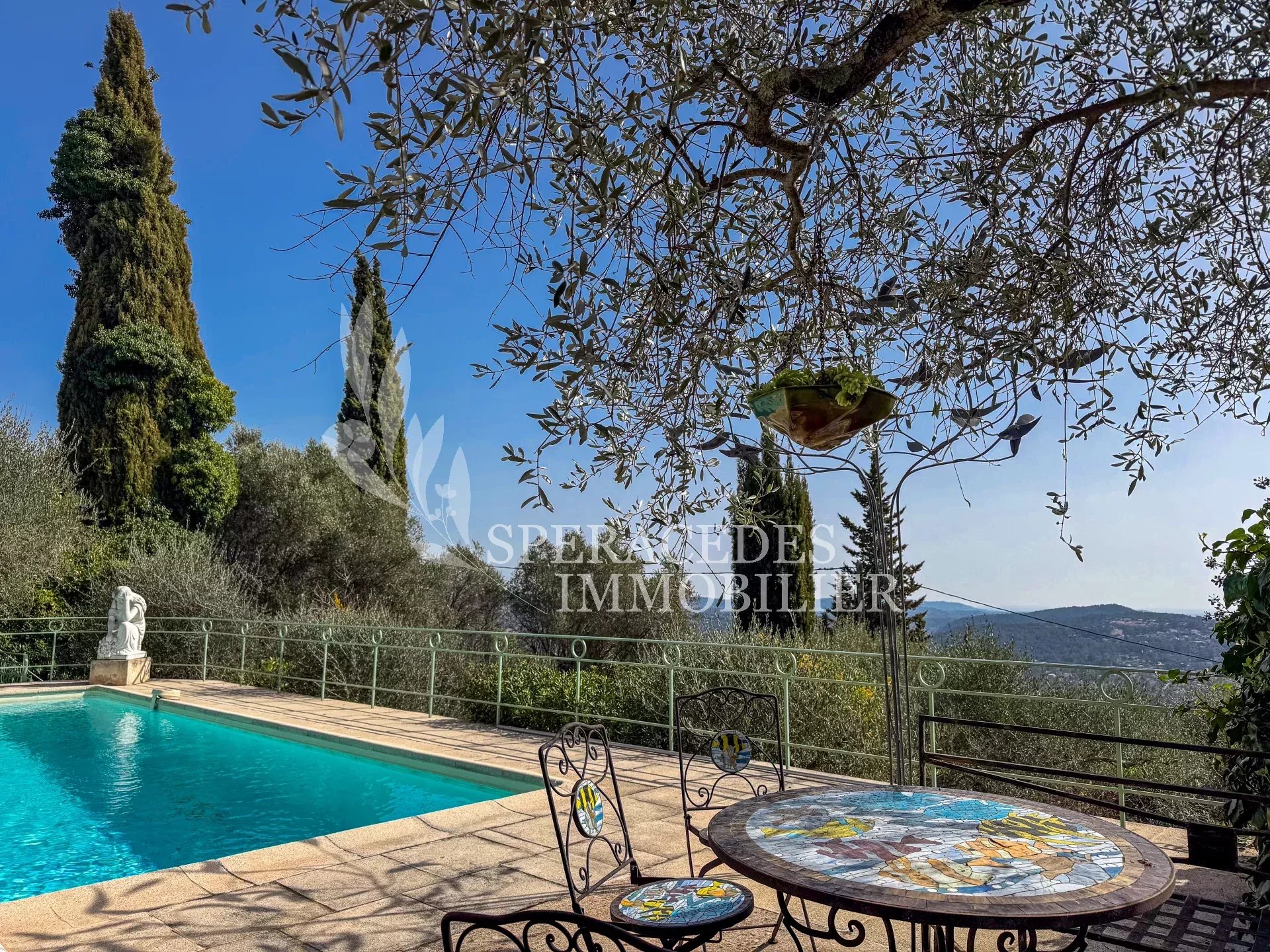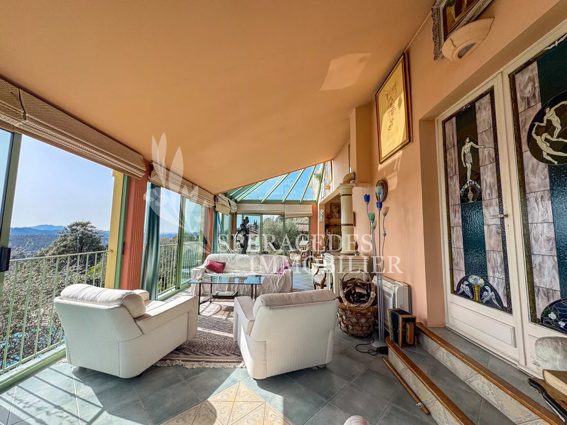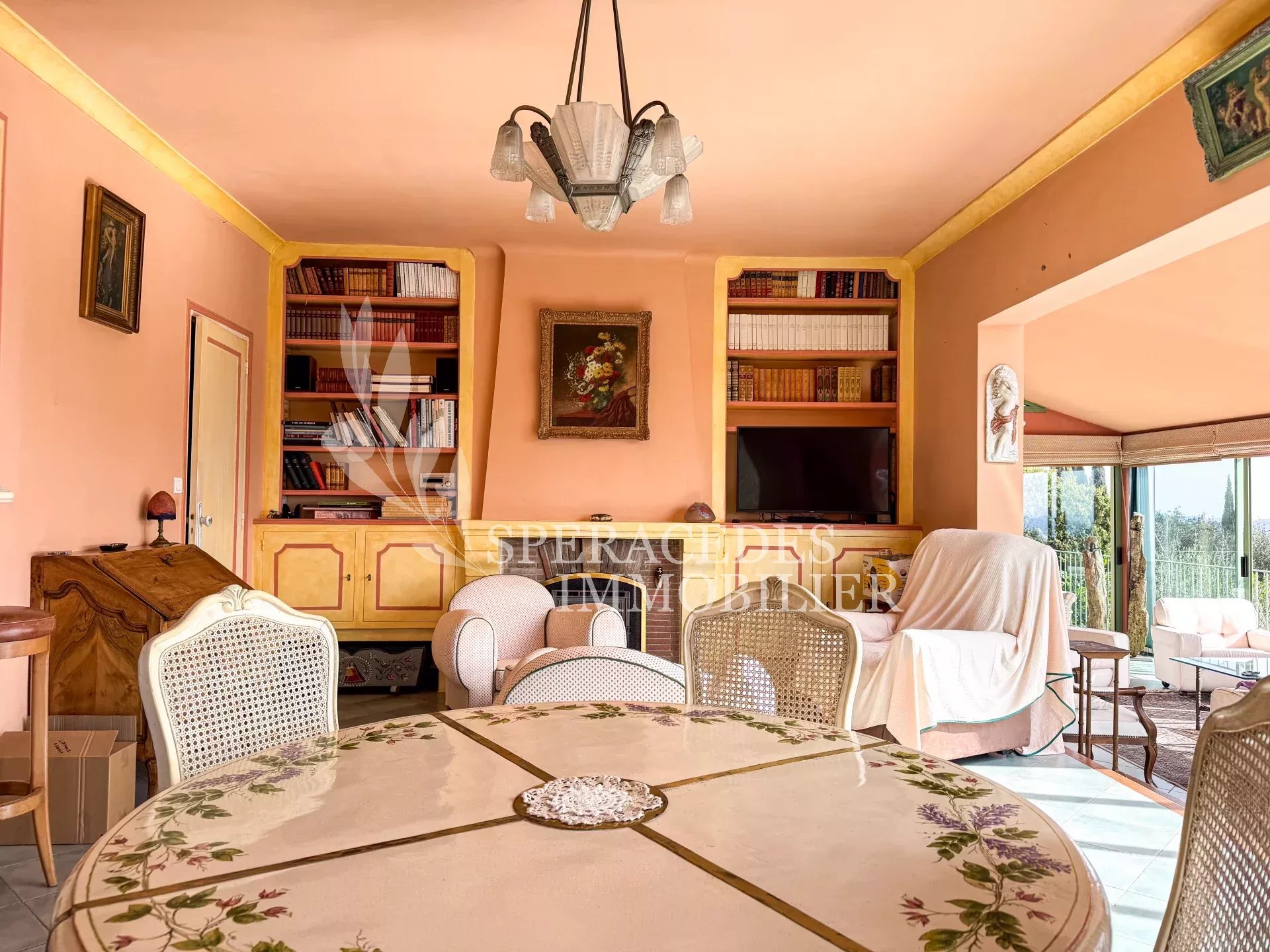 Spéracèdes, belle maison atypique bénéficiant d’une vue mer, collines et lac, à pied du village avec une maison d’amis indépendante, pour une surface habitable totale d’environ 230 m². La maison principale, d’environ 193 m² répartis sur deux niveaux, se compose : Au rez-de-chaussée d’un séjour véranda avec poêle, d’un salon / salle à manger avec cheminée, d’une cuisine ouverte, de deux chambres et d’une salle de bains. En rez-de-jardin, elle offre deux chambres supplémentaires, une salle d’eau avec sauna, un séjour, une cuisine, un cellier, une cave à vin ainsi qu’un local chaudière. La maison d’amis, d’une surface d’environ 35 m², comprend un salon, une cuisine et une salle de bains. L’ensemble est édifié sur un terrain de 2 290 m² et bénéficie d’un bel espace piscine avec cuisine d’été ainsi que d’un abri voitures. La propriété est raccordée au tout-à-l’égout et offre la possibilité de détacher une parcelle d’environ 750 m², déjà prévue par géomètre.