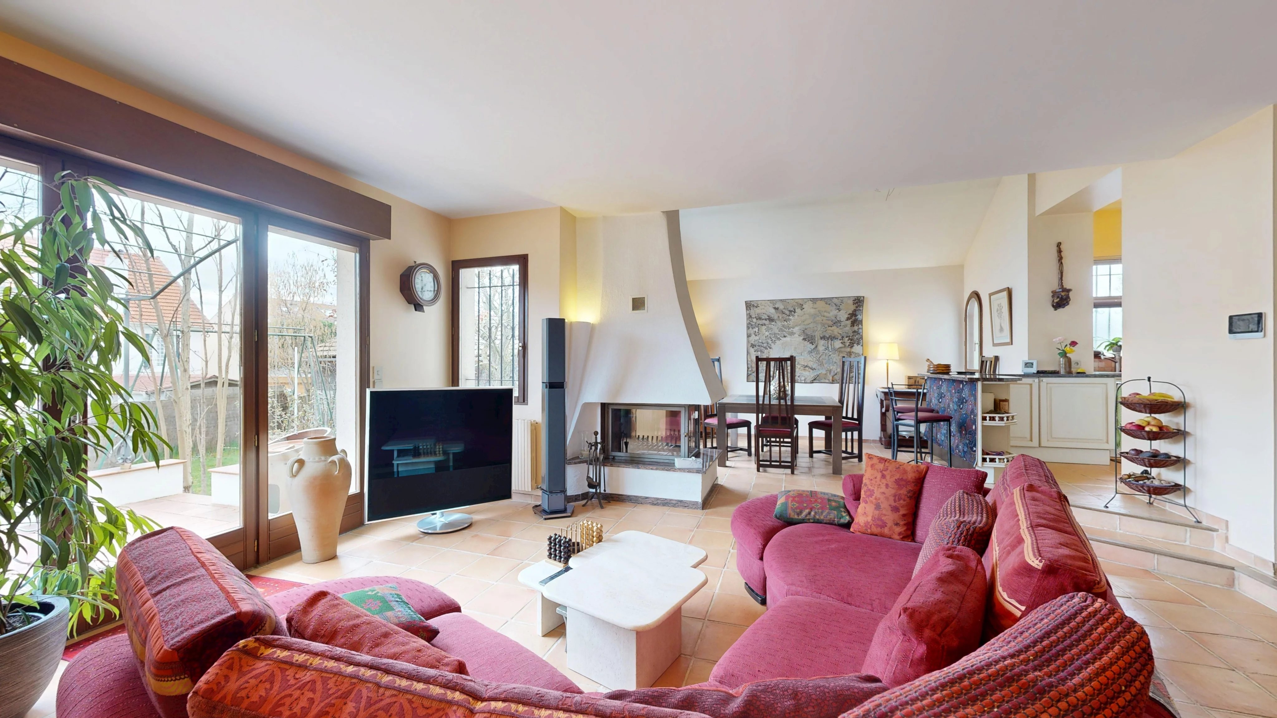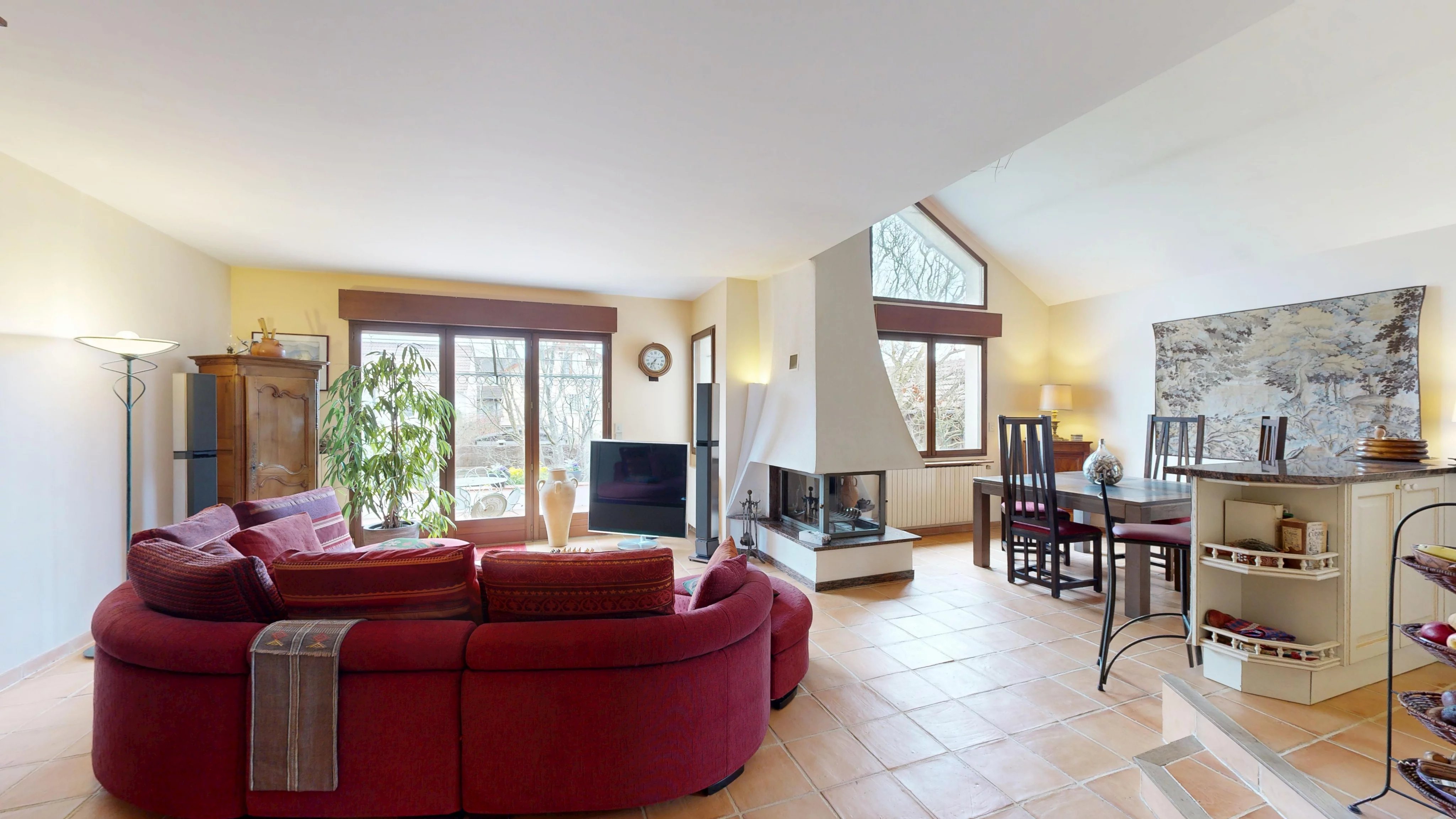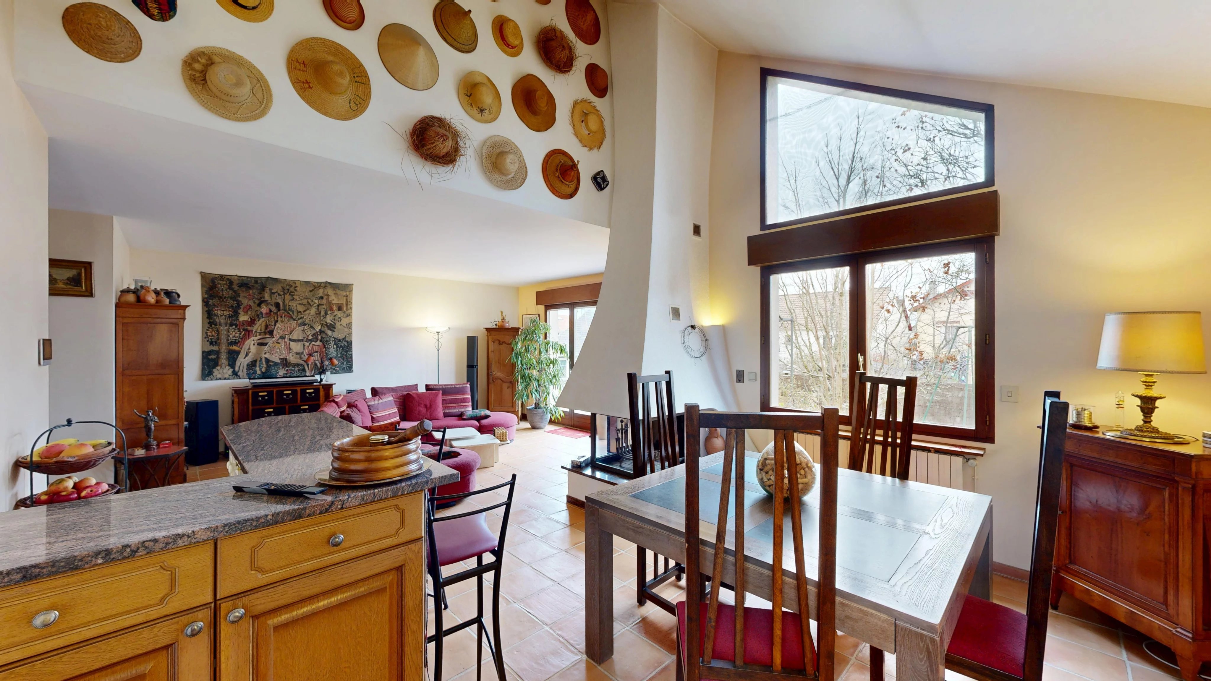 Dès l’entrée, un espace d’accueil dessert harmonieusement les différents espaces de vie. Vous accédez ensuite à un superbe séjour cathédrale, baigné de lumière et offrant de magnifiques volumes. Une cheminée avec insert vient sublimer cet espace chaleureux, idéal pour des moments conviviaux en famille ou entre amis.