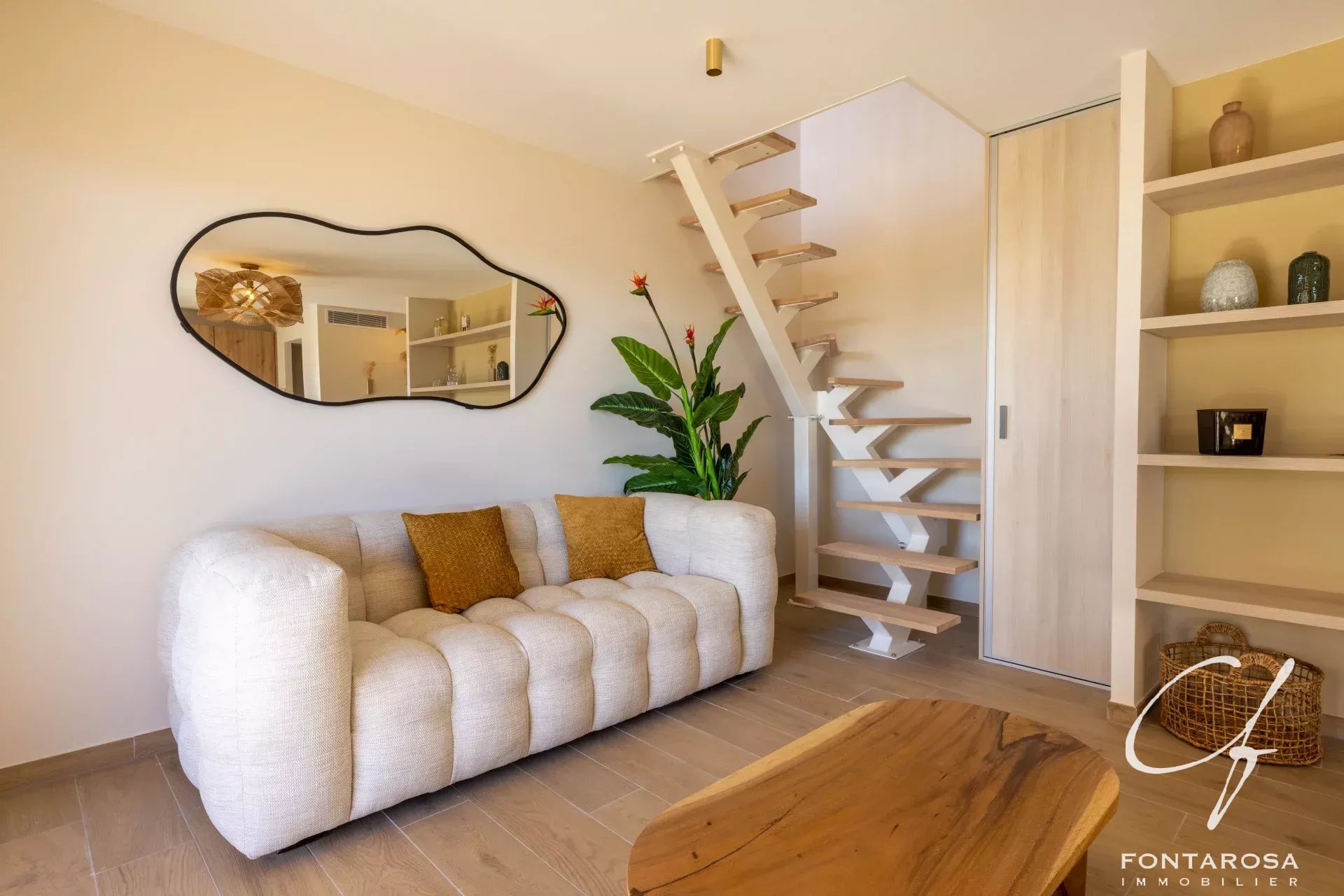 Al piano superiore, la zona notte comprende una confortevole camera da letto, un soppalco e un elegante bagno con doccia, tutti caratterizzati da un'atmosfera calda e contemporanea.