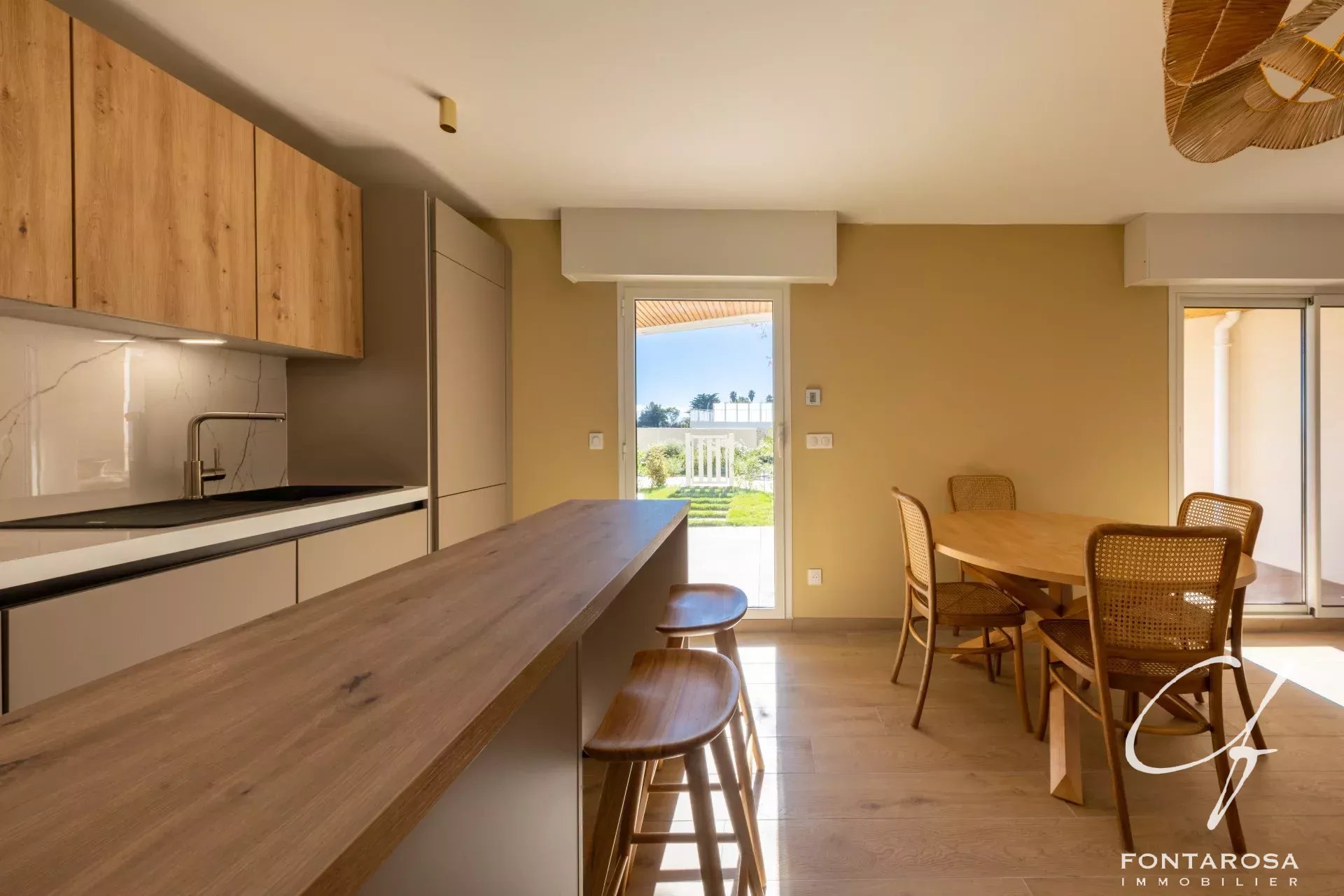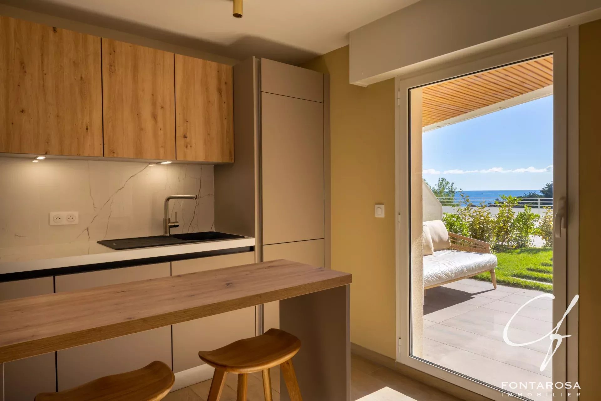 Il livello principale è caratterizzato da un bel soggiorno con cucina a vista, ampliato da un giardino privato e da una terrazza, che offre una vista ininterrotta sul mare e un contesto verde particolarmente piacevole.