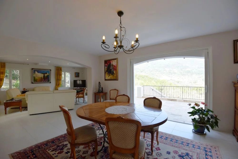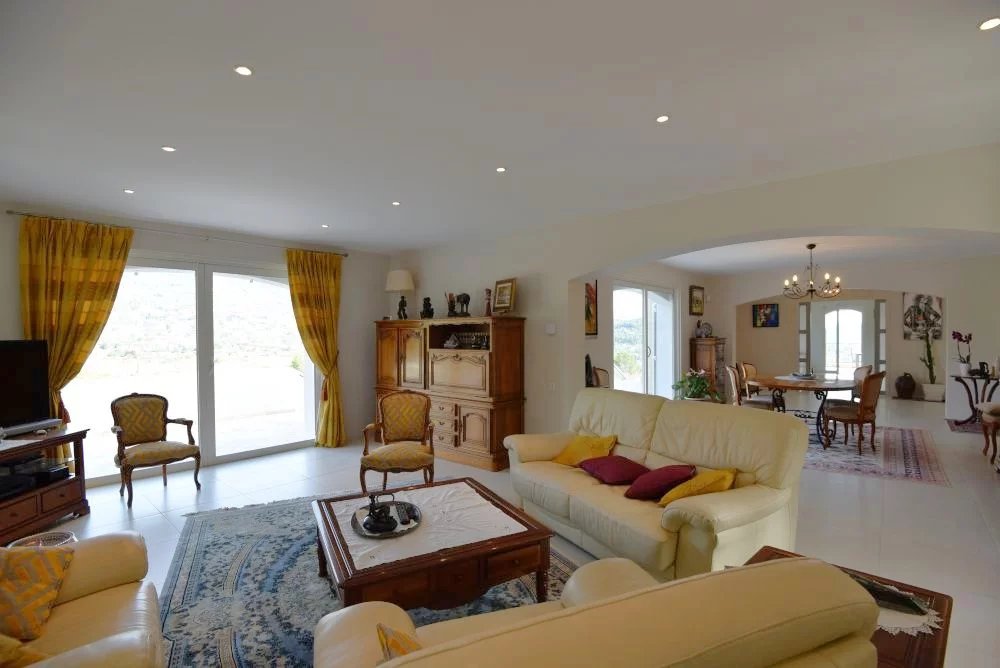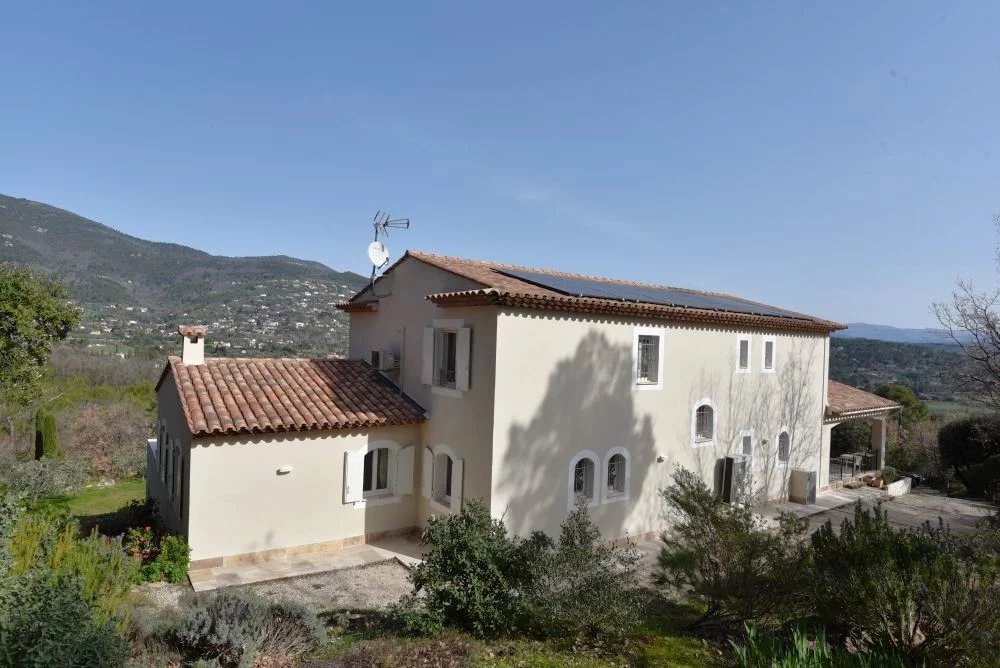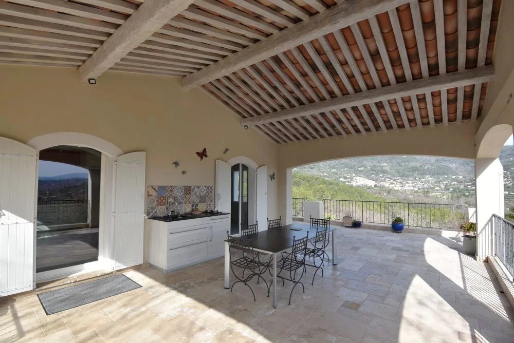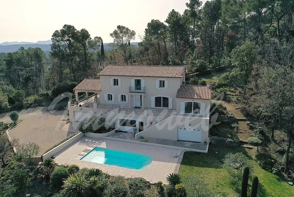 EXCLUSIVITE – Élégante villa provençale avec vue panoramique – Seillans Dans un environnement naturel privilégié, au cœur d’un magnifique terrain paysager de 5 091 m² agrémenté d’oliviers, cette superbe villa d’environ 270 m² offre un cadre de vie rare, alliant calme absolu, panorama exceptionnel et prestations de qualité. Dominant la campagne environnante, la propriété bénéficie d’une vue panoramique spectaculaire sur les villages perchés et les montagnes, offrant un décor changeant au fil des saisons. Dès l’entrée, la villa séduit par ses volumes généreux et sa luminosité. Le rez-de-chaussée accueille un spacieux séjour baigné de lumière, une cuisine entièrement équipée, ainsi qu’un bureau. Ces espaces de vie s’ouvrent sur une magnifique terrasse couverte, véritable prolongement de la maison, idéale pour profiter de moments de convivialité face au paysage. À l’étage, l’espace nuit propose une élégante suite parentale avec salle de bains, ainsi que trois chambres confortables et deux salles d’eau, offrant un agencement parfaitement adapté à la vie familiale ou à la réception d’invités. Le rez-de-jardin complète harmonieusement l’ensemble avec une chambre supplémentaire disposant de sa salle d’eau, une buanderie, un grand garage, ainsi que plusieurs caves et un atelier, offrant de nombreux espaces de rangement et de travail. À l’extérieur, la propriété invite à la détente avec une superbe piscine chauffée, parfaitement intégrée dans l’environnement naturel et bénéficiant elle aussi d’une vue dégagée sur la campagne environnante. Alliance parfaite entre charme provençal, confort moderne et nature préservée, cette villa constitue une adresse idéale pour une résidence principale ou secondaire de caractère, à quelques minutes seulement du village de Seillans, classé parmi les plus beaux villages de France.