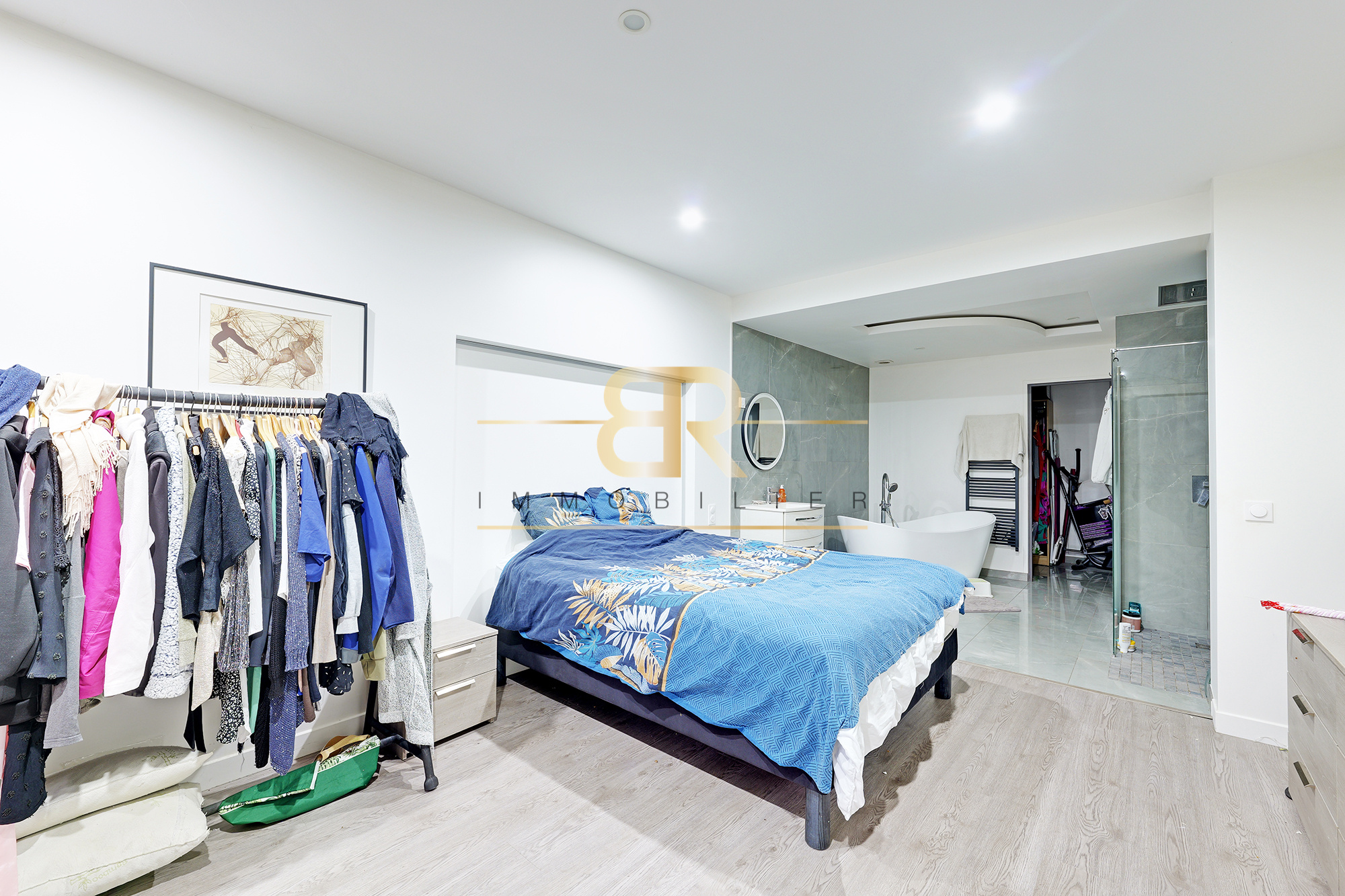 La SUITE PARENTALE, spacieuse et élégante, dispose d'une BAIGNOIRE intégrée, d'une DOUCHE, d'un WC et d'un DRESSING SUR MESURE, offrant un véritable espace privé.