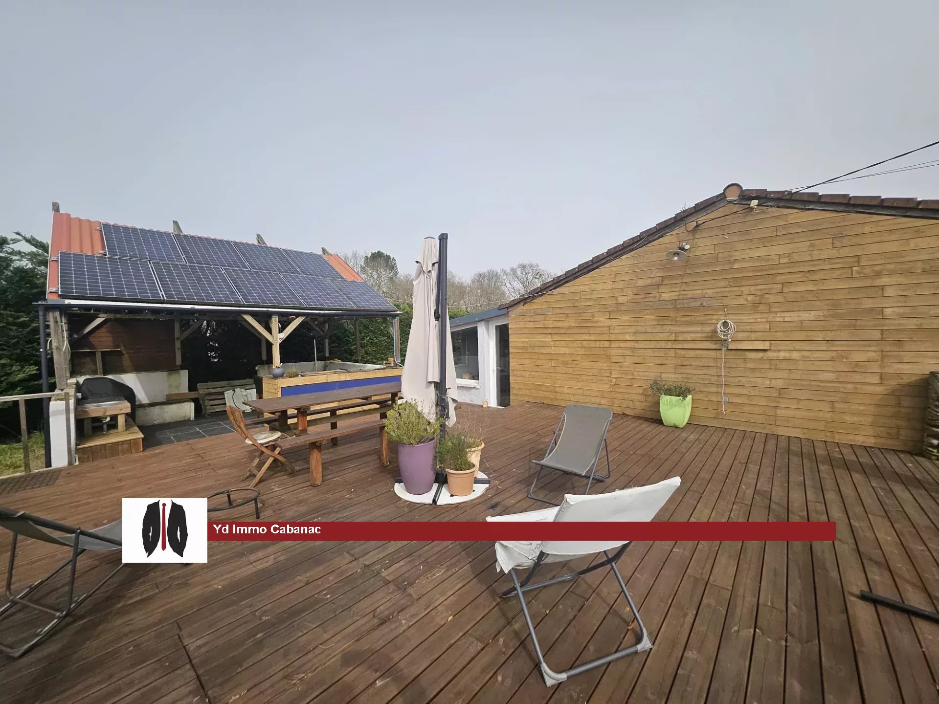 À seulement 10 minutes de Saucats, venez découvrir cette charmante maison de plain-pied située dans un environnement verdoyant. Elle se compose d’une belle pièce de vie lumineuse comprenant un salon chaleureux, un séjour convivial et une cuisine ouverte aménagée. Dans le salon, un poêle à granulés apporte confort et ambiance cosy tout en offrant une solution de chauffage économique. Côté nuit, vous trouverez trois chambres, toutes équipées de placards penderie, ainsi qu’une grande salle d’eau avec douche et espace fonctionnel. À l’extérieur, vous profiterez d’une magnifique terrasse d’environ 80 m², parfaite pour recevoir famille et amis, agrémentée d’un abri avec cuisine d’été. Des panneaux solaires permettent l’autoconsommation pour la maison ainsi qu’un surplus revendu, faisant de ce bien une habitation économe en énergie. Une belle dépendance en bois complète l’ensemble, offrant 32 m² au sol avec un étage de même superficie, idéale pour un atelier, un espace de télétravail, un logement d’appoint ou un projet locatif. Un plus: borne électrique pour voiture. Le tout est implanté sur une parcelle pleine de charme. Un bien rare sur le secteur, alliant confort, économie d’énergie et qualité de vie. Contactez vite votre agence locale YDIMMO CABANAC ydcabanac@gmail.com