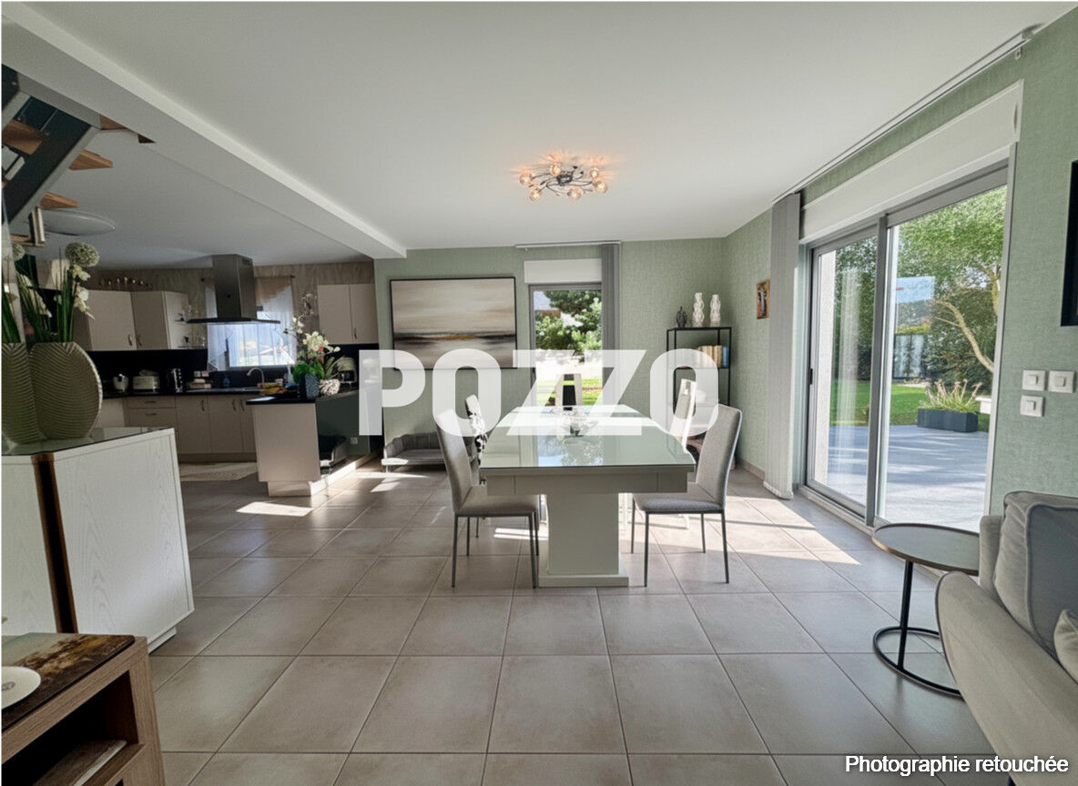 Votre agence POZZO Immobilier vous propose à la vente cette maison contemporaine d'environ 142 m², idéalement située à Bénouville, charmante commune du Calvados réputée pour son cadre de vie paisible entre mer et campagne, à proximité immédiate de Caen et des plages du Débarquement. Implantée sur un terrain arboré de plus de 1 000 m², cette maison offre un environnement calme et recherché. Le rez-de-chaussée s'ouvre sur une entrée desservant une spacieuse et lumineuse pièce de vie d'environ 59 m², avec une cuisine aménagée et équipée. Ce niveau est complété par une chambre avec salle d'eau, ainsi qu'un WC indépendant. A l'étage vous trouverez une salle de bain avec douche et baignoire, des W.C. indépendants, ainsi que trois belles chambres dont une avec un grand dressing, Un autre atout de ce bien réside dans l'une des chambres, qui bénéficie d'un accès direct à une terrasse, offrant un espace extérieur privilégié, idéal pour profiter des beaux jours. Le bien dispose d'un garage attenant de 27 m² , idéal pour le stationnement et le stockage. Chauffage au sol avec pompe à chaleur pour le rez-de-chaussée et radiateurs pour l'étage. Volets roulants électriques. Les informations sur les risques auxquels ce bien est exposé sont disponibles sur le site Géorisques : www.georisques.gouv.fr