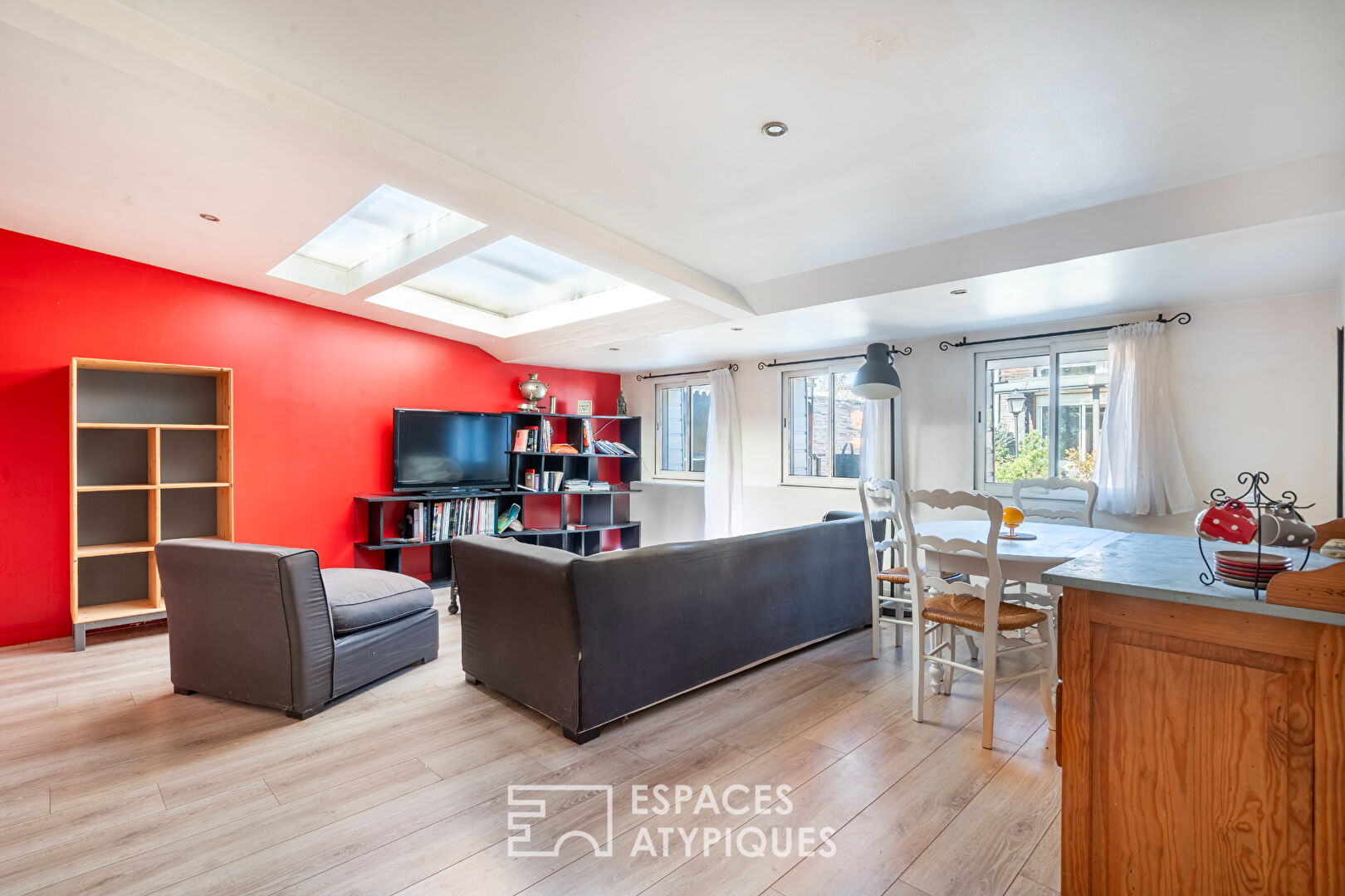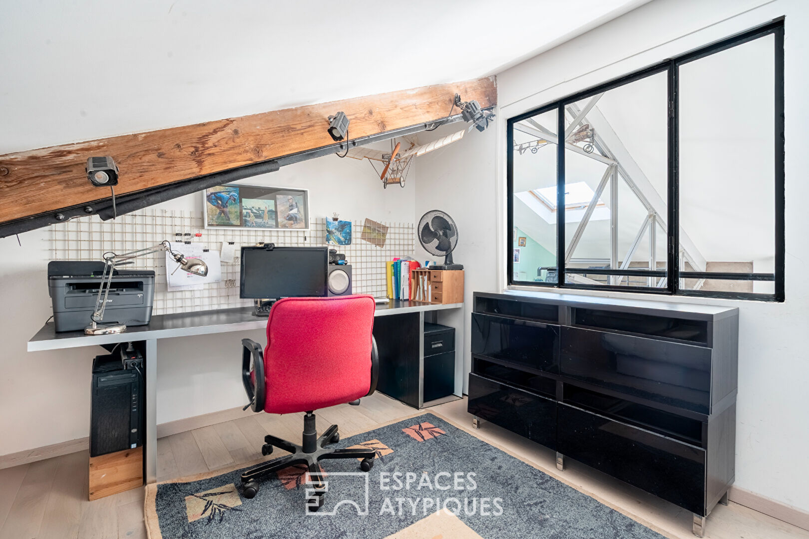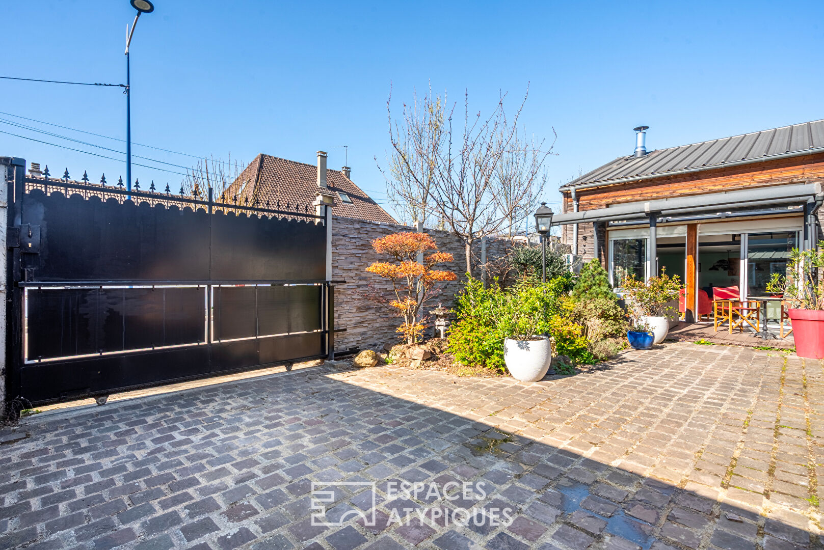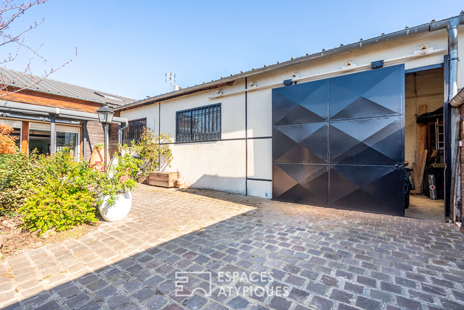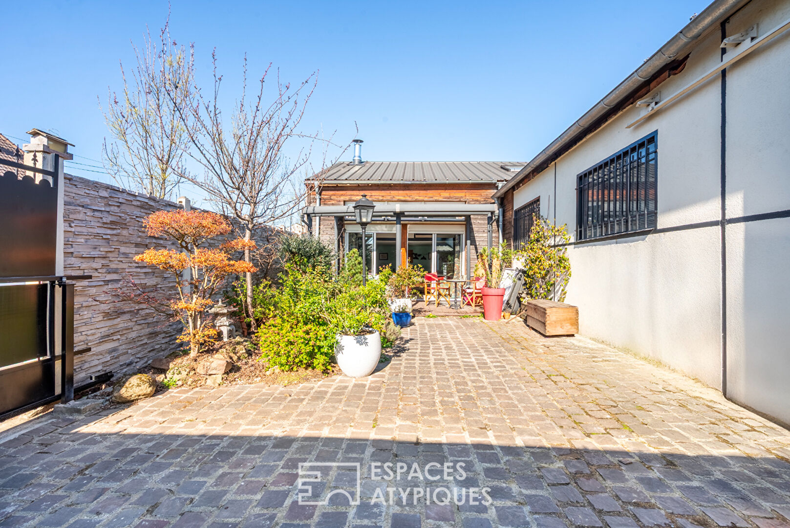 Au coeur du quartier résidentiel du Petit Drancy, à proximité immédiate des commodités, cette maison développe 138 m² habitables sur une parcelle de 343 m². Ancienne menuiserie entièrement réhabilitée, ce bien singulier à l'architecture industrielle affirmée, est organisé autour d'une cour pavé. La pièce de vie principale de 80 m² constitue le véritable coeur du projet. Déployée en double hauteur, elle bénéficie d'un bain de lumière naturelle accentué par les volumes ouverts. Au centre, le séjour s'organise autour d'un poêle à bois, créant un point chaleureux et structurant. L'espace de réception profite d'un accès direct de plain-pied à une terrasse couverte agrémentée d'un jacuzzi ainsi qu'à une cour de 66 m². Un mur habillé en brique de parement dialogue avec la structure acier apparente de la passerelle, renforçant l'identité Loft du lieu. La salle à manger, installée sous la mezzanine, prolonge naturellement le séjour et communique avec la cuisine ouverte dans une circulation fluide. Un WC indépendant complète ce niveau. A l'étage, deux chambres, un bureau et une salle d'eau avec WC composent l'espace nuit. Des surfaces complémentaires permettent l'aménagement d'un atelier ou espace polyvalent, offrant un réel potentiel d'agencement. Un atelier et un garage totalisant 119 m² ainsi qu'une dépendance de 49 m² complètent l'ensemble. Accessibles depuis la cour mais également reliés à l'habitation par un couloir intérieur discret, ces volumes demeurent indépendants des espaces de vie principaux, autorisant un usage professionnel, artistique ou autonome. L'esprit résolument loft, les volumes généreux et la modularité des espaces composent un lieu de vie singulier, rare sur le secteur. RER B Gare de Drancy : à 4 Km Future Ligne 15 - Grand Paris Express - Gare de Drancy / Bobigny : 950 mètres Bus 146, 145 (Arrêt Danton) : à 9 minutes à pied Aéroport Roissy CDG : à 20 Km CLASSE ENERGIE : C / CLASSE CLIMAT : A Montant moyen estimé des dépenses annuelles d'énergie pour un usage standard, indexées aux années 2021, 2022, 2023 : entre 1 530 euros et 2 150 euros (abonnement compris). Les informations sur les risques auxquels ce bien est exposé sont disponibles sur le site Géorisques : https://www.georisques.gouv.fr Contact : Frédéric GROULT EI - 06 09 32 90 87 RSAC : 899 150 254 Bobigny Frédéric GROULT (EI) Agent Commercial - Numéro RSAC : 899 150 254 - BOBIGNY.